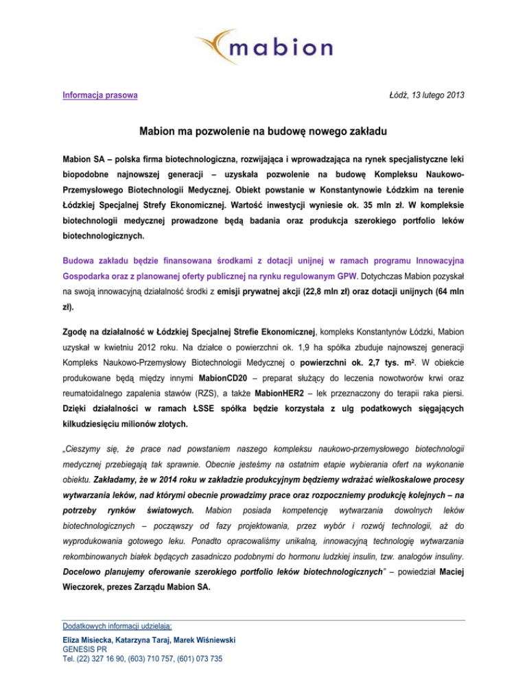 Informacja prasowa Łódź, 13 lutego 2013 Mabion ma pozwolenie na budowę nowego zakładu Mabion SA – polska firma biotechnologiczna, rozwijająca i wprowadzająca na rynek specjalistyczne leki biopodobne najnowszej generacji – uzyskała pozwolenie na budowę Kompleksu NaukowoPrzemysłowego Biotechnologii Medycznej. Obiekt powstanie w Konstantynowie Łódzkim na terenie Łódzkiej Specjalnej Strefy Ekonomicznej. Wartość inwestycji wyniesie ok. 35 mln zł. W kompleksie biotechnologii medycznej prowadzone będą badania oraz produkcja szerokiego portfolio leków biotechnologicznych. Budowa zakładu będzie finansowana środkami z dotacji unijnej w ramach programu Innowacyjna Gospodarka oraz z planowanej oferty publicznej na rynku regulowanym GPW. Dotychczas Mabion pozyskał na swoją innowacyjną działalność środki z emisji prywatnej akcji (22,8 mln zł) oraz dotacji unijnych (64 mln zł). Zgodę na działalność w Łódzkiej Specjalnej Strefie Ekonomicznej, kompleks Konstantynów Łódzki, Mabion uzyskał w kwietniu 2012 roku. Na działce o powierzchni ok. 1,9 ha spółka zbuduje najnowszej generacji Kompleks Naukowo-Przemysłowy Biotechnologii Medycznej o powierzchni ok. 2,7 tys. m2. W obiekcie produkowane będą między innymi MabionCD20 – preparat służący do leczenia nowotworów krwi oraz reumatoidalnego zapalenia stawów (RZS), a także MabionHER2 – lek przeznaczony do terapii raka piersi. Dzięki działalności w ramach ŁSSE spółka będzie korzystała z ulg podatkowych sięgających kilkudziesięciu milionów złotych. „Cieszymy się, że prace nad powstaniem naszego kompleksu naukowo-przemysłowego biotechnologii medycznej przebiegają tak sprawnie. Obecnie jesteśmy na ostatnim etapie wybierania ofert na wykonanie obiektu. Zakładamy, że w 2014 roku w zakładzie produkcyjnym będziemy wdrażać wielkoskalowe procesy wytwarzania leków, nad którymi obecnie prowadzimy prace oraz rozpoczniemy produkcję kolejnych – na potrzeby rynków światowych. Mabion posiada kompetencję wytwarzania dowolnych leków biotechnologicznych – począwszy od fazy projektowania, przez wybór i rozwój technologii, aż do wyprodukowania gotowego leku. Ponadto opracowaliśmy unikalną, innowacyjną technologię wytwarzania rekombinowanych białek będących zasadniczo podobnymi do hormonu ludzkiej insulin, tzw. analogów insuliny. Docelowo planujemy oferowanie szerokiego portfolio leków biotechnologicznych” – powiedział Maciej Wieczorek, prezes Zarządu Mabion SA. Dodatkowych informacji udzielają: Eliza Misiecka, Katarzyna Taraj, Marek Wiśniewski GENESIS PR Tel. (22) 327 16 90, (603) 710 757, (601) 073 735 Decyzja o pozwoleniu na budowę zbiega się w czasie z datą rozpoczęcia zadania inwestycyjnego (luty 2013) dotyczącego budowy w ramach projektu Innowacyjna Gospodarka. Oznacza to, iż wszystkie wydatki związane z inwestycją będą mogły zostać potraktowane jako kwalifikowane i tym samym będą podlegać dofinansowaniu. Obecnie Mabion posiada Centrum Badawczo-Rozwojowe o łącznej powierzchni około 650 m2, składające się z wytwórni sterylnych form leków biotechnologicznych – rekombinowanych białek w standardzie GMP (Good Manufacturing Practice), a także laboratoriów biologii molekularnej i inżynierii genetycznej, biochemicznych, kultur komórkowych oraz analitycznych. W ramach strategii rozwijania, rejestrowania i wprowadzania na światowe rynki leków biopodobnych, na najbardziej zaawansowanym etapie są prace nad MabionCD20. W toku są procedury zmierzające do rejestracji badań klinicznych MabionCD20 już w 7 państwach, w tym w 4 krajach – Gruzji, Polsce, Rosji i na Litwie – komisje bioetyczne wyraziły zgodę na prowadzenie badań. Ponadto spółka uzyskała już wszystkie zgody potrzebne do rejestracji badań leku MabionCD20 w Gruzji i na Litwie – zarówno Ministerstwa Zdrowia, jak i tamtejszych komisji bioetycznych. Oznacza to, że w najbliższych PROCEDURA BADAŃ KLINICZNYCH MABIONCD20 zawarcie umów z około 70 ośrodkami w Europie złożenie wniosków o zgody komisji bioetycznych i instytucji ewidencjonujących badania kliniczne – 7 państw uzyskanie zgody komisji bioetycznych w każdym kraju – 4 państwa uzyskanie zgody instytucji ewidencjonujących badania kliniczne – Gruzja i Litwa tygodniach ruszą pierwsze podania MabionCD20 pacjentom w tych krajach. Mabion zamierza we własnym zakresie przeprowadzić proces rejestracji leku MabionCD20 na obszarze całej Unii Europejskiej, gdzie system rejestracji leków biopodobnych jest dość dobrze uregulowany. W Polsce i krajach ościennych spółka będzie prowadzić sprzedaż leków samodzielnie, natomiast w pozostałych państwach UE zamierza podpisać umowy dystrybucyjne z miejscowymi operatorami. Badania na ludziach to ostatni etap procedury poprzedzającej rejestrację leku. Ponadto jednym z celów spółki jest wprowadzenie leków na rynek amerykański. Mabion zakończył pozytywnie wspólną procedurę Scientific Advice w Europejskim Urzędzie ds. Leków (EMA) i Amerykańskiej Agencji ds. rejestracja badań klinicznych w każdym kraju – Gruzja i Litwa Żywności (FDA) w zakresie rozwoju jakościowego oraz klinicznego leku wytworzenie serii leku do podań pacjentom i podanie leku pacjentom przygotowywania planów regulacyjnych i marketingowych na rynku USA. MabionCD20 w listopadzie 2012 roku. Potwierdziło to możliwość rozpoczęcia Na rynkach, gdzie wymogi dotyczące rejestracji leków biopodobnych nie są ściśle regulowane – jak na przykład Afryka czy Azja – zarówno realizację sprzedaży, jak i całą procedurę rejestracji Mabion planuje przeprowadzić za pośrednictwem lokalnych, wiodących firm farmaceutycznych. Produkcja Dodatkowych informacji udzielają: Eliza Misiecka, Katarzyna Taraj, Marek Wiśniewski GENESIS PR Tel. (22) 327 16 90, (603) 710 757, (601) 073 735 będzie realizowana w zakładach Mabionu w Polsce, a spółka będzie miała udział w przychod