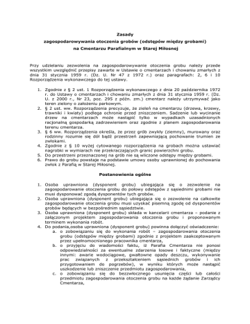 Zasady zagospodarowywania otoczenia grobów (odstępów między grobami) na Cmentarzu Parafialnym w Starej Miłosnej Przy udzielaniu zezwolenia na zagospodarowywanie otoczenia grobu należy przede wszystkim uwzględnić przepisy zawarte w Ustawie o cmentarzach i chowaniu zmarłych z dnia 31 stycznia 1959 r. (Dz. U. Nr 47 z 1972 r.) oraz paragrafach: 2, 6 i 10 Rozporządzenia wykonawczego do tej ustawy. 1. Zgodnie z § 2 ust. 1 Rozporządzenia wykonawczego z dnia 20 października 1972 r. do Ustawy o cmentarzach i chowaniu zmarłych z dnia 31 stycznia 1959 r. (Dz. U. z 2000 r., Nr 23, poz. 295 z późn. zm.) cmentarz należy utrzymywać jako teren zielony o założeniu parkowym. 2. § 2 ust. ww. Rozporządzenia precyzuje, że zieleń na cmentarzu (drzewa, krzewy, trawniki i kwiaty) podlega ochronie przed zniszczeniem. Sadzenie lub wycinanie drzew na cmentarzach może nastąpić tylko w wypadkach uzasadnionych racjonalną gospodarką zadrzewieniem oraz zgodnie z planem zagospodarowania terenu cmentarza. 3. § 6 ww. Rozporządzenia określa, że przez grób zwykły (ziemny), murowany oraz rodzinny rozumie się dół bądź przestrzeń zapewniającą pochowanie trumien ze zwłokami. 4. Zgodnie z § 10 wyżej cytowanego rozporządzenia na grobach można ustawiać nagrobki w wymiarach nie przekraczających granic powierzchni grobu. 5. Do przestrzeni przeznaczonej na grób nie są wliczone odstępy między grobami. 6. Prawo do grobu powstaje na podstawie umowy osoby uprawnionej do pochowania zwłok z Parafią w Starej Miłosnej. Postanowienia ogólne 1. Osoba uprawniona (dysponent grobu) ubiegająca się o zezwolenie na zagospodarowanie otoczenia grobu do połowy odstępów z sąsiednimi grobami nie musi dysponować zgodą dysponentów tych grobów. 2. Osoba uprawniona (dysponent grobu) ubiegająca się o zezwolenie na całkowite zagospodarowanie otoczenia grobu musi uzyskać pisemną zgodę od dysponentów grobów będących w bezpośrednim sąsiedztwie. 3. Osoba uprawniona (dysponent grobu) składa w kancelarii cmentarza – podanie z załączonym projektem zagospodarowania otoczenia grobu i proponowanym terminem wykonania robót. 4. Do podania,osoba uprawniona (dysponent grobu) powinna dołączyć oświadczenie: a. o zobowiązaniu się do wykonania robót – zagospodarowania otoczenia grobu (odstępów między grobami) zgodnie z projektem zaakceptowanym przez upełnomocnionego pracownika cmentarza, b. o przyjęciu do wiadomości faktu, iż Parafia Cmentarza nie ponosi odpowiedzialności za ewentualne zdarzenia losowe i faktyczne (między innymi: awarie wodociągowe, gwałtowne opady deszczu, wykonywanie prac związanych z przekształceniem sąsiednich grobów i ich przygotowaniem do pogrzebów), w wyniku których może nastąpić uszkodzenie lub zniszczenie przedmiotu zagospodarowania, c. o zobowiązaniu się do bezzwłocznego usunięcia części lub całości przedmiotu zagospodarowania otoczenia grobu na każde żądanie Zarządcy Cmentarza, d. o zobowiązaniu się, iż w przypadku braku reakcji lub odmowy usunięcia przedmiotu zagospodarowania otoczenia grobu, dysponent grobu pokryje koszty tego usunięcia, zorganizowanego przez Zarządcę Cmentarza, e. o zapoznaniu się z treścią „Zasad zagospodarowywania otoczenia grobów (odstępów między grobami) na Cmentarzu Parafialnym uznając je jako warunki umowne normujące stosunki pomiędzy osobą uprawnioną (dysponentem grobu) a Zarządcą Cmentarza (działającym w imieniu Parafii N.S.P.J. w Starej Miłosnej. Postanowienia szczegółowe 1. W przypadku usytuowania grobów w skrajnych rzędach, wzdłuż ciągów chodnikowo – drogowych, przy placach gospodarczych oraz ujęciach wodnych, dopuszcza się zagospodarowanie otoczenia grobu od strony ww. urządzeń w granicach 50 cm z możliwością zwiększenia tej powierzchni w zależności od konkretnej sytuacji terenowej. 2. Balustradki, kratki, płotki i inne akcenty ozdobne należy ustawiać w bezpośrednim sąsiedztwie grobu. 3. Zezwala się na ustawianie w przejściach między grobami ławek wolnostojących o wymiarach nieprzekraczających dł. 80 cm, wys. 40 cm, szer. 20 cm zabezpieczonych łańcuchem. 4. Dopuszcza się zagospodarowanie - utwardzenie otoczenia grobów z materiałów nieoszlifowanych typu chodnikowego (płytki, kostki) na podsypce piaskowo – cementowej lub wyłożenie materiałem sypkim (grys, żwir, tłuczeń kamienny). 5. W nogach grobów do połowy alejki (przejścia między grobami) dopuszcza się również na powyższych zasadach wykonywanie tzw. podestów. 6. Wykonanie utwardzenia otoczenia grobu oraz podesty nie mogą wystawać ponad poziom gruntu w otoczeniu grobu według ukształtowania terenu. 7. Materiał użyty do zagospodarowania i utwardzenia otoczenia grobu nie może rażąco kolidować rodzajem i kolorystyką z istniejącym zagospodarowaniem kwatery grzebalnej i obsadzeniami materiałem roślinnym cmentarza. 8. Wszystkie obsadzenia otoczenia grobu materiałem roślinnym ozdobnym muszą bezwzględnie uzyskać akceptację Zarządcy Cmentarza. 9. Prace związane z wykonaniem zagospodarowania otoczenia grobu mogą być wykonywane od poniedziałku do piątku w godzinach od 800 do 1600. 10. Za czynności kancelaryjno – terenowe związane z wykonaniem zagospodarowania – utwardzenia otoczenia grobu ( w tym również materiałem sypkim) oraz wykonaniem podestów należy wnieść do kancelarii cmentarza opłatę. 11. Podania o wyrażenie zgody na zagospodarowanie otoczenia grobów należy pobrać w kancelarii cmentarza. 12. Potwierdzenie prawidłowości wykonanych robót musi mieć odzwierciedlenie w protokole odbioru.