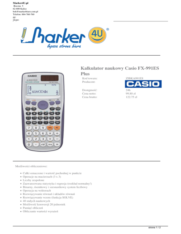 Marker4U.pl Boczna 5 62-800 Kalisz [email protected] Telefon: 884-760-760 gg: skype: Kalkulator naukowy Casio FX-991ES Plus Kod towaru: Producent: ZIBKA991ES Dostępność: Cena netto: Cena brutto: 24h 99.80 zł 122.75 zł Możliwości obliczeniowe: Całki oznaczone i wartość pochodnej w punkcie Operacje na macierzach (3 x 3) Liczby zespolone Zaawansowana statystyka i regresja (rozkład normalny!) Binarny, ósemkowy i szesnastkowy system liczbowy Operacja na wektorach Rozwiązywanie równań i układów równań Rozwiązywanie wzoru (funkcja SOLVE) 40 stałych naukowych Możliwość konwersji 20 jednostek Pamięć obliczeń Obliczanie wartości wyrażeń strona 1 / 2 Marker4U.pl Boczna 5 62-800 Kalisz [email protected] Telefon: 884-760-760 gg: skype: Suma wyrazów ciągu Funkcje trygonometryczne i hiperboliczne Logarytm dziesiętny, naturalny i o dowolnej podstawie Wartość bezwzględna Tabela funkcji Kombinacje i permutacje Ułamki zwykłe Konwersja współrzędnych biegunowych i prostokątnych Konwersja jednostek kąta (DEG, RAD, GRA) Notacja inżynierska Regulacja kontrastu wyświetlacza 9 komórek pamięci Wyświetlacz: Dwuwierszowy 31*96 pkt, 15 i 10 znaków widocznych w linii Ilość funkcji: 417 Wymiary: 13,8 x 80 x 162 mm Zasilanie: LR44 + ogniwo słoneczne strona 2 / 2 Powered by TCPDF (www.tcpdf.org)