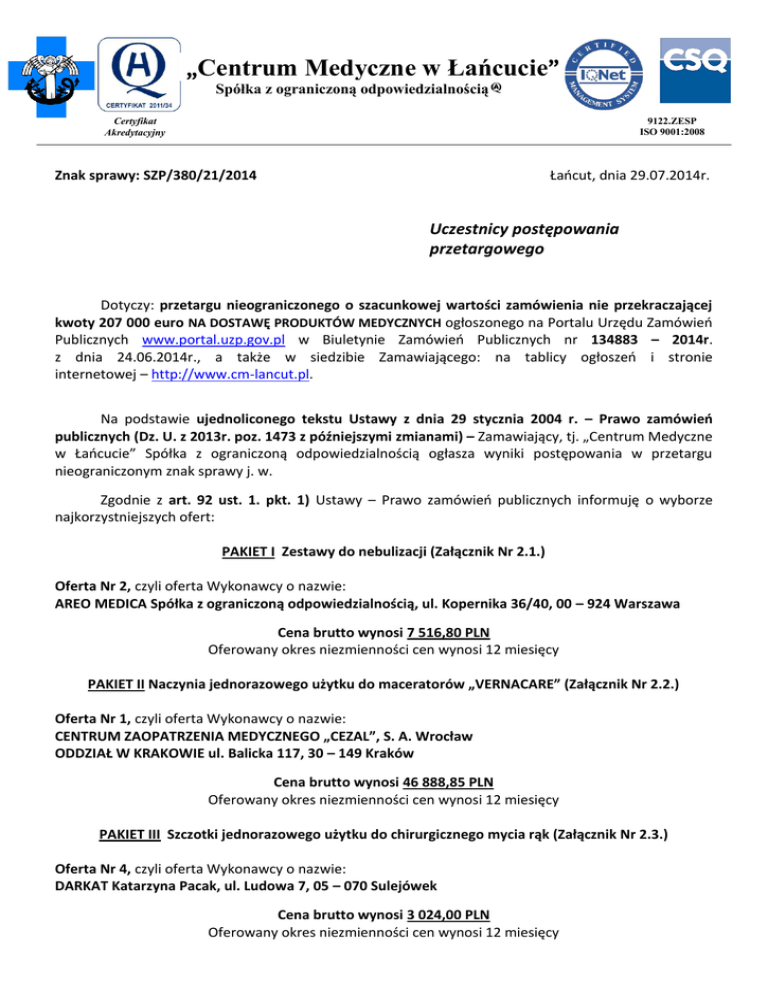 „Centrum Medyczne w Łańcucie” Spółka z ograniczoną odpowiedzialnością 9122.ZESP ISO 9001:2008 Certyfikat Akredytacyjny Znak sprawy: SZP/380/21/2014 Łańcut, dnia 29.07.2014r. Uczestnicy postępowania przetargowego Dotyczy: przetargu nieograniczonego o szacunkowej wartości zamówienia nie przekraczającej kwoty 207 000 euro NA DOSTAWĘ PRODUKTÓW MEDYCZNYCH ogłoszonego na Portalu Urzędu Zamówień Publicznych www.portal.uzp.gov.pl w Biuletynie Zamówień Publicznych nr 134883 – 2014r. z dnia 24.06.2014r., a także w siedzibie Zamawiającego: na tablicy ogłoszeń i stronie internetowej – http://www.cm-lancut.pl. Na podstawie ujednoliconego tekstu Ustawy z dnia 29 stycznia 2004 r. – Prawo zamówień publicznych (Dz. U. z 2013r. poz. 1473 z późniejszymi zmianami) – Zamawiający, tj. „Centrum Medyczne w Łańcucie” Spółka z ograniczoną odpowiedzialnością ogłasza wyniki postępowania w przetargu nieograniczonym znak sprawy j. w. Zgodnie z art. 92 ust. 1. pkt. 1) Ustawy – Prawo zamówień publicznych informuję o wyborze najkorzystniejszych ofert: PAKIET I Zestawy do nebulizacji (Załącznik Nr 2.1.) Oferta Nr 2, czyli oferta Wykonawcy o nazwie: AREO MEDICA Spółka z ograniczoną odpowiedzialnością, ul. Kopernika 36/40, 00 – 924 Warszawa Cena brutto wynosi 7 516,80 PLN Oferowany okres niezmienności cen wynosi 12 miesięcy PAKIET II Naczynia jednorazowego użytku do maceratorów „VERNACARE” (Załącznik Nr 2.2.) Oferta Nr 1, czyli oferta Wykonawcy o nazwie: CENTRUM ZAOPATRZENIA MEDYCZNEGO „CEZAL”, S. A. Wrocław ODDZIAŁ W KRAKOWIE ul. Balicka 117, 30 – 149 Kraków Cena brutto wynosi 46 888,85 PLN Oferowany okres niezmienności cen wynosi 12 miesięcy PAKIET III Szczotki jednorazowego użytku do chirurgicznego mycia rąk (Załącznik Nr 2.3.) Oferta Nr 4, czyli oferta Wykonawcy o nazwie: DARKAT Katarzyna Pacak, ul. Ludowa 7, 05 – 070 Sulejówek Cena brutto wynosi 3 024,00 PLN Oferowany okres niezmienności cen wynosi 12 miesięcy PAKIET IV Fartuchy foliowe, foliowe ochraniacze na buty (Załącznik Nr 2.4.) Oferta Nr 9, czyli oferta Wykonawcy o nazwie: DEMI – CHEM PRZEDSIĘBIORSTWO HANDLOWO – USŁUGOWE Andrzej Wacław Dereziński, ul. Puławska 104 m 13, 02 – 620 Warszawa Cena brutto wynosi 17 502,90 PLN Oferowany okres niezmienności cen wynosi 12 miesięcy PAKIET V Klipsy (Załącznik Nr 2.5.) Oferta Nr 11, czyli oferta Wykonawcy o nazwie: Beryl Med Ltd.1 st Floor, 26 Fouberts Place, London W1F 7PP, Wielka Brytania Adres do korespondencji: ul. Sadowa 14, 05 – 410 Józefów Cena brutto wynosi 2 374,92 PLN Oferowany okres niezmienności cen wynosi 12 miesięcy PAKIET VI Siatki specjalistyczne (Załącznik Nr 2.6.) Oferta Nr 6, czyli oferta Wykonawcy o nazwie: INTER CONSULT SPÓŁKA JAWNA M. D. SITEK, ul. Księdza Brzóski 94/18, 91 – 347 Łódź Cena brutto wynosi 13 750,00 PLN Oferowany okres niezmienności cen wynosi 12 miesięcy PAKIET VII Siatka niewchłanialna (Załącznik Nr 2.7.) Oferta Nr 7, czyli oferta Wykonawcy o nazwie: MEDO PLUS MONIKA SITEK, ul. Księdza Brzóski 94/18, 91 – 347 Łódź Cena brutto wynosi 7 650,13 PLN Oferowany okres niezmienności cen wynosi 12 miesięcy PAKIET VIII Staplery i ładunki (Załącznik Nr 2.8.) Oferta Nr 11, czyli oferta Wykonawcy o nazwie: Beryl Med Ltd.1 st Floor, 26 Fouberts Place, London W1F 7PP, Wielka Brytania Adres do korespondencji: ul. Sadowa 14, 05 – 410 Józefów Cena brutto wynosi 6 258,60 PLN Oferowany okres niezmienności cen wynosi 12 miesięcy PAKIET IX Siatka częściowo wchłanialna (Załącznik Nr 2.9.) Oferta Nr 18, czyli oferta Wykonawcy o nazwie: Johnson & Johnson Poland Sp. z o. o., ul. Iłżecka 24, 02 – 135 Warszawa Cena brutto wynosi 2 808,00 PLN Oferowany okres niezmienności cen wynosi 12 miesięcy PAKIET X Igła insuflacyjna (Załącznik Nr 2.10.) Oferta Nr 15, czyli oferta Wykonawcy o nazwie: SKAMEX Spółka z ograniczoną odpowiedzialnością, SKA, ul. Częstochowska 38/52, 93 – 121 Łódź Cena brutto wynosi 4 860,00 PLN Oferowany okres niezmienności cen wynosi 12 miesięcy Uzasadnienie: w/w oferty są zgodne z Ustawą – Prawo zamówień publicznych, spełniają wymogi zawarte w Specyfikacji Istotnych Warunków Zamówienia i uzyskały maksymalne liczby punktów w poszczególnym pakiecie w oparciu o ustalone kryteria zawarte w SIWZ. Działając na podstawie art. 92 ust. 1. pkt. 3) Ujednoliconego tekstu Ustawy z dnia 29 stycznia 2004 r. – Prawo zamówień publicznych (Dz. U. z 2013r. poz. 907 z późniejszymi zmianami) – – Zamawiający, tj. „Centrum Medyczne w Łańcucie” Spółka z ograniczoną odpowiedzialnością informuje, że w prowadzonym postępowaniu przetargowym nie wykluczono żadnego Wykonawcy. Działając na podstawie art. 92 ust. 1. pkt. 2) Ujednoliconego tekstu Ustawy z dnia 29 stycznia 2004 r. – Prawo zamówień publicznych (Dz. U. z 2013r. poz. 907 z późniejszymi zmianami) – – Zamawiający, tj. „Centrum Medyczne w Łańcucie” Spółka z ograniczoną odpowiedzialnością zawiadamia, że w przeprowadzonym postępowaniu przetargowym na podstawie art. 89 ust. 1. pkt. 2) tejże Ustawy w Pakiecie II Naczynia jednorazowego użytku do maceratorów „VERNACARE” (Załącznik Nr 2.2.) została odrzucona oferta Nr 14 – Przedsiębiorstwo Produkcyjno – Handlowe „RowLAM” s. c., ul. Przybrzeżna 17,62 – 800 Kalisz, ponieważ jej treść nie odpowiada treści Specyfikacji Istotnych Warunków Zamówienia. Zgodnie z art. 89 ust. 1. pkt. 2) Ujednoliconego tekstu Ustawy z dnia 29 stycznia 2004 r. – – Prawo zamówień publicznych (Dz. U. z 2013r. poz. 907 z późniejszymi zmianami) cyt. „Zamawiający odrzuca ofertę, jeżeli jej treść nie odpowiada treści specyfikacji istotnych warunków zamówienia …”. Komisja Przetargowa powołana została Zarządzeniem Wewnętrznym Nr 35/2014 w dniu 23.06.2014r. i składa się z sześciu członków. Przy badaniu i ocenie ofert uczestniczyło pięciu członków komisji p