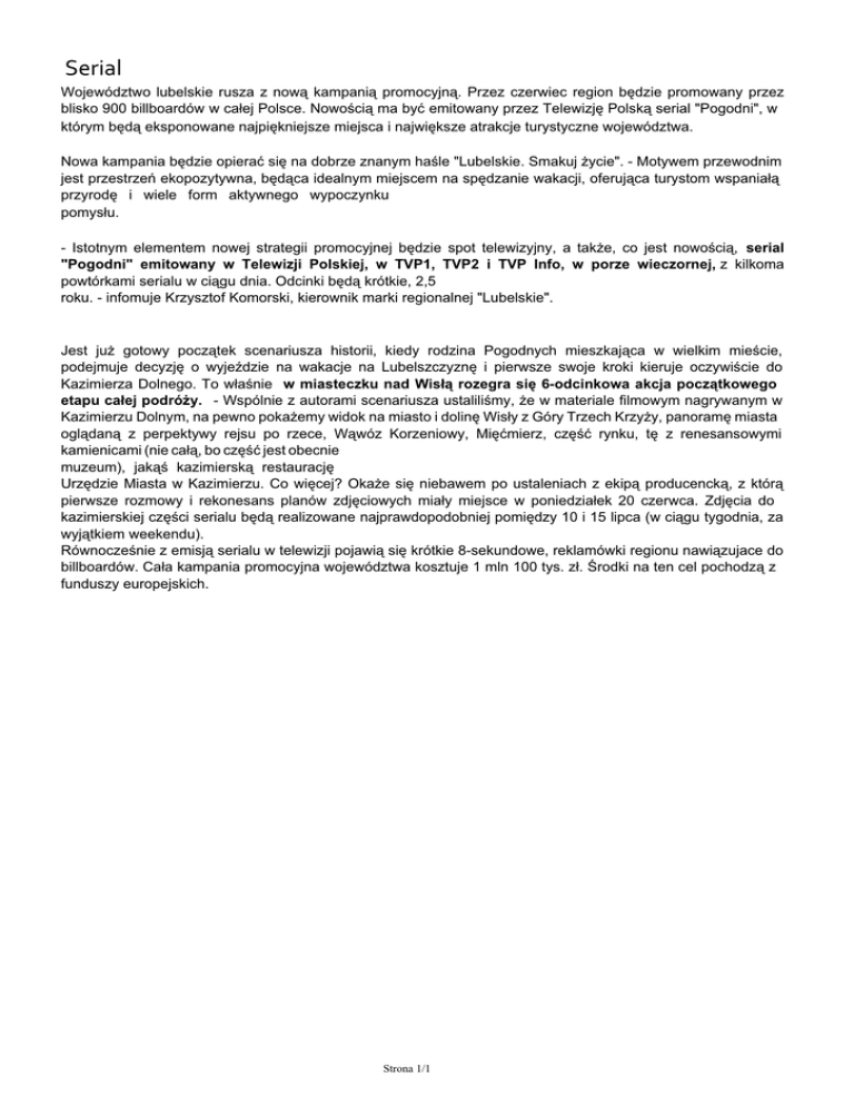 Serial Województwo lubelskie rusza z nową kampanią promocyjną. Przez czerwiec region będzie promowany przez blisko 900 billboardów w całej Polsce. Nowością ma być emitowany przez Telewizję Polską serial "Pogodni", w którym będą eksponowane najpiękniejsze miejsca i największe atrakcje turystyczne województwa. Nowa kampania będzie opierać się na dobrze znanym haśle "Lubelskie. Smakuj życie". - Motywem przewodnim jest przestrzeń ekopozytywna, będąca idealnym miejscem na spędzanie wakacji, oferująca turystom wspaniałą przyrodę i wiele form aktywnego wypoczynku pomysłu. - Istotnym elementem nowej strategii promocyjnej będzie spot telewizyjny, a także, co jest nowością, serial "Pogodni" emitowany w Telewizji Polskiej, w TVP1, TVP2 i TVP Info, w porze wieczornej, z kilkoma powtórkami serialu w ciągu dnia. Odcinki będą krótkie, 2,5 roku. - infomuje Krzysztof Komorski, kierownik marki regionalnej "Lubelskie". Jest już gotowy początek scenariusza historii, kiedy rodzina Pogodnych mieszkająca w wielkim mieście, podejmuje decyzję o wyjeździe na wakacje na Lubelszczyznę i pierwsze swoje kroki kieruje oczywiście do Kazimierza Dolnego. To właśnie w miasteczku nad Wisłą rozegra się 6-odcinkowa akcja początkowego etapu całej podróży. - Wspólnie z autorami scenariusza ustaliliśmy, że w materiale filmowym nagrywanym w Kazimierzu Dolnym, na pewno pokażemy widok na miasto i dolinę Wisły z Góry Trzech Krzyży, panoramę miasta oglądaną z perpektywy rejsu po rzece, Wąwóz Korzeniowy, Mięćmierz, część rynku, tę z renesansowymi kamienicami (nie całą, bo część jest obecnie muzeum), jakąś kazimierską restaurację Urzędzie Miasta w Kazimierzu. Co więcej? Okaże się niebawem po ustaleniach z ekipą producencką, z którą pierwsze rozmowy i rekonesans planów zdjęciowych miały miejsce w poniedziałek 20 czerwca. Zdjęcia do kazimierskiej części serialu będą realizowane najprawdopodobniej pomiędzy 10 i 15 lipca (w ciągu tygodnia, za wyjątkiem weekendu). Równocześnie z emisją serialu w telewizji pojawią się krótkie 8-sekundowe, reklamówki regionu nawiązujace do billboardów. Cała kampania promocyjna województwa kosztuje 1 mln 100 tys. zł. Środki na ten cel pochodzą z funduszy europejskich. Strona 1/1 Powered by TCPDF (www.tcpdf.org)