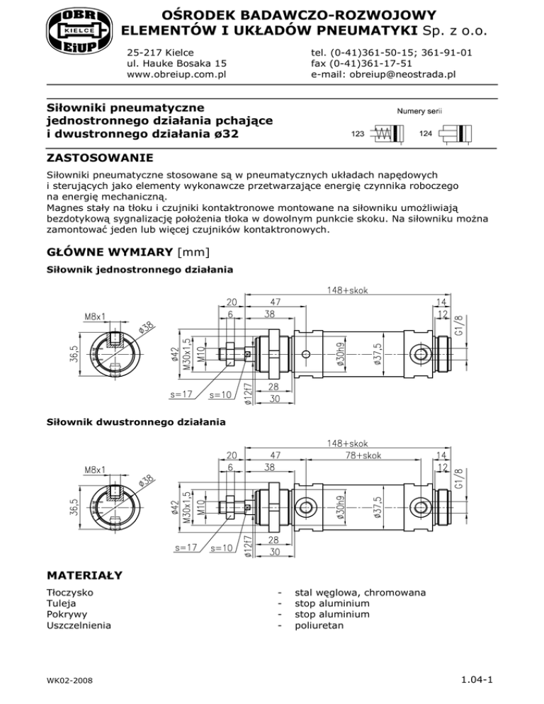 OŚRODEK BADAWCZO-ROZWOJOWY ELEMENTÓW I UKŁADÓW PNEUMATYKI Sp. z o.o. tel. (0-41)361-50-15; 361-91-01 fax (0-41)361-17-51 e-mail: [email protected] 25-217 Kielce ul. Hauke Bosaka 15 www.obreiup.com.pl Siłowniki pneumatyczne jednostronnego działania pchające i dwustronnego działania ø32 ZASTOSOWANIE Siłowniki pneumatyczne stosowane są w pneumatycznych układach napędowych i sterujących jako elementy wykonawcze przetwarzające energię czynnika roboczego na energię mechaniczną. Magnes stały na tłoku i czujniki kontaktronowe montowane na siłowniku umoŜliwiają bezdotykową sygnalizację połoŜenia tłoka w dowolnym punkcie skoku. Na siłowniku moŜna zamontować jeden lub więcej czujników kontaktronowych. GŁÓWNE WYMIARY [mm] Siłownik jednostronnego działania Siłownik dwustronnego działania MATERIAŁY Tłoczysko Tuleja Pokrywy Uszczelnienia WK02-2008 - stal węglowa, chromowana stop aluminium stop aluminium poliuretan 1.04-1 Siłowniki pneumatyczne ø32 OBREiUP Kielce DANE TECHNICZNE Czynnik roboczy - Ciśnienie pracy Zakres temperatur pracy Rodzaj konstrukcji - Amortyzacja Pozycja pracy - spręŜone powietrze lub gaz o podobnych właściwościach, filtrowane o max. wielkości cząsteczek stałych 40 µm, smarowane lub niesmarowane mgłą olejową max. 1,0 MPa od −20 do +80 ºC tłokowa; pokrywy przednia i tylna połączone z tuleją gwintem mechaniczna, elastycznymi pierścieniami dowolna Siłowniki jednostronnego działania Średnica siłownika [mm] 32 Skok* [mm] 10 25 max.50 Teoretyczna siła na tłoczysku Min. siła odciągu przy ciśnieniu 0,6 MPa, pchająca [N] spręŜyny [N] 49,4 429,6 44,9 37,4 * Skoki inne wg zamówienia. Siłowniki dwustronnego działania Teoretyczna siła na tłoczysku [N] przy ciśnieniu 0,6 MPa pchająca ciągnąca Średnica siłownika [mm] Skok* [mm] 32 10, 25, 50, 80, 100, 125, 160, 200, 250, 300, 320, 400, max.500 67 50 * Skoki inne wg zamówienia. SPOSÓB ZAMAWIANIA Sposób budowy numeru zamówieniowego W zamówieniu naleŜy podać nazwę, średnicę, skok i numer zamówieniowy siłownika, np. siłownik dwustronnego działania o średnicy tłoka ø32 mm i skoku 80 mm, nr zamówieniowy 124.032.0080.0 Przykład zamówienia siłownika: Siłownik pneumatyczny dwustronnego działania ø32x80, 124.032.0080.0 ELEMENTY WSPÓŁPRACUJĄCE Elementy mocujące siłowników Czujniki kontaktronowe 1.04-2 – – str. katalogu 1.05-1 str. katalogu 1.06-1