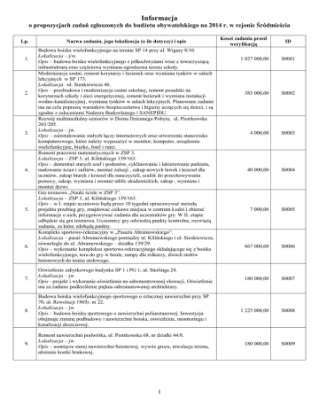 Informacja o propozycjach zadań zgłoszonych do budżetu obywatelskiego na 2014 r. w rejonie Śródmieścia Lp. 1. 2. 3. 4. 5. 6. Nazwa zadania, jego lokalizacja (o ile dotyczy) i opis Budowa boiska wielofunkcyjnego na terenie SP 14 przy ul. Wigury 8/10. Lokalizacja – j/w. Opis – budowa boiska wielofunkcyjnego z piłkochwytami wraz z towarzyszącą infrastrukturą oraz częściowa wymiana ogrodzenia terenu szkoły. Modernizacja szatni, remont korytarzy i łazienek oraz wymiana tynków w salach lekcyjnych w SP 173. Lokalizacja –ul. Sienkiewicza 46. Opis – przebudowa i modernizacja szatni szkolnej, remont posadzki na korytarzach szkoły i sieci energetycznej, remont łazienek i wymiana instalacji wodno-kanalizacyjnej, wymiana tynków w salach lekcyjnych. Planowane zadanie ma na celu poprawę warunków bezpieczeństwa i higieny uczących się dzieci, i są zgodne z zaleceniami Nadzoru Budowlanego i SANEPIDU. Rozwój multimedialny seniorów w Domu Dziennego Pobytu, ul. Piotrkowska 203/205. Lokalizacja – jw. Opis – zainstalowanie stałych łączy internetowych oraz utworzenie stanowiska komputerowego, które należy wyposażyć w monitor, komputer, urządzenie wielofunkcyjne, biurko, fotel i ruter. Remont pracowni matematycznych w ZSP 3. Lokalizacja – ZSP 3, ul. Kilińskiego 159/163. Opis – demontaż starych szaf i podestów, cyklinowanie i lakierowanie parkietu, malowanie ścian i sufitów, montaż żaluzji , zakup nowych ławek i krzeseł dla uczniów, zakup biurek i krzeseł dla nauczycieli, szafek do przechowywania pomocy, zakup, wymiana i montaż tablic akademickich, zakup , wymiana i montaż drzwi. Gra terenowa „Nauki ścisłe w ZSP 3”. Lokalizacja – ZSP 3, ul. Kilińskiego 159/163. Opis – w I. etapie uczniowie będą przez 10 tygodni opracowywać metodą projektu przebieg gry, znajdować ciekawe miejsca w centrum Łodzi i zbierać informacje o nich, przygotowywać zadania dla uczestników gry. W II. etapie odbędzie się gra terenowa. Uczestnicy gry odwiedzą punkty kontrolne, rozwiążą zadania, za które zdobędą punkty. Kompleks sportowo-rekreacyjny w „Pasażu Abramowskiego”. Lokalizacja – pasaż Abramowskiego pomiędzy ul. Kilińskiego i ul. Sienkiewicza, równolegle do ul. Abramowskiego – działka 139/29. Opis – wykonanie kompleksu sportowo-rekreacyjnego składającego się z boiska wielofunkcyjnego, toru do gry w boule, rampy dla rolkarzy, dwóch stołów betonowych do tenisa stołowego. Koszt zadania przed weryfikacją ID 1 027 000,00 S0001 385 000,00 S0002 4 000,00 S0003 40 000,00 S0004 7 000,00 S0005 867 000,00 S0006 180 000,00 S0007 7. Oświetlenie zabytkowego budynku SP 1 i PG 1, ul. Sterlinga 24. Lokalizacja – jw. Opis - projekt i wykonanie oświetlenia na odremontowanej elewacji. Oświetlenie ma za zadanie podkreślenie piękna odrestaurowanej architektury. 8. Budowa boiska wielofunkcyjnego sportowego o sztucznej nawierzchni przy SP 70, ul. Rewolucji 1905r. nr 22. Lokalizacja – jw. Opis – budowa boiska sportowego o nawierzchni poliuretanowej. Inwestycja obejmuje zmianę podbudowy i nawierzchni boiska, oświetlenia, monitoringu i kanalizacji deszczowej. 1 225 000,00 S0008 9. Remont nawierzchni podwórka, ul. Piotrkowska 68, nr działki 44/8. Lokalizacja – jw. Opis – usunięcie starej nawierzchni betonowej, wywóz gruzu, niwelacja terenu, ułożenie kostki brukowej. 180 000,00 S0009 1 10. 11. 12. 13. 14. 15. 16. 17. 18. Budowa boiska wielofunkcyjnego o sztucznej nawierzchni, boiska do siatkówki plażowej oraz zagospodarowanie przyszkolnego terenu ogólnodostępnego na cele rekreacyjne przy XXIX LO, ul. Zelwerowicza 38/44. Lokalizacja – jw. Opis – budowa boiska wielofunkcyjnego o nawierzchni poliuretanowej oraz budowa dwóch boisk do piłki siatkowej plażowej. Otwarte wielofunkcyjne boiska dla mieszkańców przy Zespole Szkół Gastronomicznych, ul. Sienkiewicza 88. Lokalizacja – jw. Opis – budowa kompleksu boisk obejmująca: roboty nawierzchniowe, niwelację terenu, wykonanie nawierzchni boiska poliuretanowego, wykonanie ogrodzenia boiska z siatki metalowej, roboty wodno-kanalizacyjne, elektryczne i oświetleniowe. Rozwój multimedialny (odtwarzacze, aparat fotograficzny) seniorów w Domu Dziennego Pobytu, ul. Jaracza 36. Lokalizacja – jw. Opis – zakup wieży Hi-fi z odtwarzaczem DVD, odtwarzaniem plików mp3 oraz gniazdem USB, oraz zakup aparatu cyfrowego typu „lustrzanka”. Rozwój multimedialny (internet i dostęp do komputerów) seniorów w Domu Dziennego Pobytu, ul. Jaracza 36. Lokalizacja – jw. Opis – stworzenie stanowiska komputerowego wyposażonego w komputer, monitor, biurko, fotel, ruter, urządzenie wielofunkcyjne oraz instalacja stałego łącza internetowego. Remont odtworzeniowy chodnika, ul. Brzeźna 12-18 oraz remont nawierzchni chodnika na ul. Brzeźnej 12-18. Lokalizacja – jw. Opis – usuniecie starych płyt chodnikowych i ułożenie nowych płyt chodnikowych i krawężników z wykorzystaniem starego podłoża. Renowacja wjazdu do posesji w obrębie remontowanego chodnika. Modernizacja nawierzchni w pasażu Abramowskiego. Lokalizacja – pasaż Abramowskiego, między ul. Kilińskiego i Sienkiewicza. Opis – stworzenie projektu zagospodarowania przestrzennego pasażu, w tym wyznaczenie nowych ścieżek spacerowych, oraz ścieżki rowerowej wraz z torem do jazdy na rolkach. W realizację tego projektu wchodzi likwidacja starych płyt chodnikowych, wyrównanie terenu, oraz położenie nowych chodników, wykonanie ścieżki rowerowej i toru do jazdy na rolkach. Wspieranie inicjatyw edukacyjnych, kulturalnych i sportowych w Śródmieściu jako forma przeciwdziałania wykluczeniu społecznemu dzieci i młodzieży. Lokalizacja – Śródmieście. Opis – Podejmowane działania mają dotyczyć przeciwdziałaniu wykluczeniu społecznemu dzieci i młodzieży z śródmiejskich enklaw biedy. Działania te będą obejmowały organizowanie czasu wolnego dla w/w grupy w sposób konstruktywny i twórc