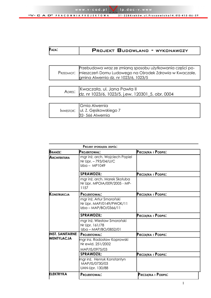 Przebudowa wraz ze zmianą sposobu użytkowania części pomieszczeń Domu Ludowego na Ośrodek Zdrowia w Kwaczale, gmina Alwernia dz. nr 1023/6, 1023/5 PROJEKT BUDOWLANO - FAZA: WYKONAWCZY Przebudowa wraz ze zmianą sposobu użytkowania części po- PRZEDMIOT: mieszczeń Domu Ludowego na Ośrodek Zdrowia w Kwaczale, gmina Alwernia dz. nr 1023/6, 1023/5 ADRES: Kwaczała, ul. Jana Pawła II dz. nr 1023/6, 1023/5, j.ew. 120301_5, obr. 0004 Gmia Alwernia INWESTOR: ul. Z. Gęsikowskiego 7 32- 566 Alwernia PROJEKT SPORZĄDZIŁ ZESPÓŁ: BRANŻE: ARCHITEKTURA PROJEKTOWAŁ: PIECZĄTKA I PODPIS: mgr inż. arch. Wojciech Popiel Nr Upr. – 793/04/U/C Izba – MP1049 SPRAWDZIŁ: PIECZĄTKA I PODPIS: mgr inż. arch. Marek Skołuba Nr Upr. MPOIA/009/2005 - MP1157 KONSTRUKCJA PROJEKTOWAŁ: PIECZĄTKA I PODPIS: mgr inż. Artur Smoroński Nr Upr. MAP/0149/PWOK/11 Izba – MAP/BO/0366/11 SPRAWDZIŁ: PIECZĄTKA I PODPIS: mgr inż. Wiesław Smoroński Nr Upr. 161/78 Izba – MAP/BO/0852/01 INST. SANITARNE PROJEKTOWAŁ: WENTYLACJA mgr inz. Radosław Koprowski Nr ewid. 251/2002 PIECZĄTKA I PODPIS: MAP/IS/0975/03 SPRAWDZIŁ: PIECZĄTKA I PODPIS: mgr inż. Henryk Konstantyn MAP/IS/0730/03 UAN-Upr. 130/88 ELEKTRYKA PROJEKTOWAŁ: PIECZĄTKA I PODPIS: 1 Przebudowa wraz ze zmianą sposobu użytkowania części pomieszczeń Domu Ludowego na Ośrodek Zdrowia w Kwaczale, gmina Alwernia dz. nr 1023/6, 1023/5 mgr inż. Paweł Wrona Nr Upr – MAP/0063/POOE/11 Izba – MAP/IE/0334/11 SPRAWDZIŁ: PIECZĄTKA I PODPIS: mgr inż. Bartłomiej Karabin Nr Upr.: MAP/0319/PWOE/13 Izba - MAP/EI/0069/14 DATA: Kraków 10.2015 r. 2 Przebudowa wraz ze zmianą sposobu użytkowania części pomieszczeń Domu Ludowego na Ośrodek Zdrowia w Kwaczale, gmina Alwernia dz. nr 1023/6, 1023/5 ZAWARTOŚĆ OPRACOWANIA część PROJEKT BUDOWLANY Nr strony 1. INFORMACJA BIOZ - Opis 4-7 - Opis Oświadczenie projektanta Wojciech Popiel, Marek Skołuba Uprawnienia Wojciech Popiel Zaświadczenie Izba Wojciech Popiel Uprawnienia Marek Skołuba Zaświadczenie Izba Marek Skołuba Uzgodnienie Wojewódzki Urząd Ochrony Zabytków w Krakowie OZKr.5183.1233.2015.AM Charakterystyka energetyczna Rysunki 7-22 23 2. PROJEKT ARCHITEKTONICZNY - - 24 25 26 27 28 29-32 33-47 3. PROJEKT KONSTRUKCYJNY - Zaświadczenie Izba Artur Smoroński, Zaświadczenie Izba Wiesław Smoroński Uprawnienia Artur Smoroński, Wiesław Smoroński Oświadczenie projektanta Artur Smoroński, Wiesław Smoroński Opis Ekspertyza Techniczna Opis Projekt Konstrukcji Rysunki 49 50 51 52-54 55-67 68-70 4. PROJEKT BRANŻA SANITARNA - - Opis Rysunki Oświadczenie projektanta Radosław Koprowski, Henryk Konstantyn Zaświadczenie Izba Radosław Koprowski, Henryk Konstantyn Uprawnienia Radosław Koprowski Henryk Konstantyn 71-78 79-83 84 85 86 5. PROJEKT INSTALACJE ELEKTRYCZNE - - Oświadczenie projektanta Dominik Bartłomiej Karabin Paweł Wrona Uprawnienia Paweł Wrona Zaświadczenie Izba Paweł Wrona Uprawnienia Bartłomiej Karabin Zaświadczenie Izba Bartłomiej Karabin Opis Rysunki 93-100 101-104 - Opis Rysunki 105-109 110-113 - 88 89 90 91 92 6. OPINIA GEOTECHNICZNA 3 Przebudowa wraz ze zmianą sposobu użytkowania części pomieszczeń Domu Ludowego na Ośrodek Zdrowia w Kwaczale, gmina Alwernia dz. nr 1023/6, 1023/5 FAZA: BRANŻA: PROJEKT BUDOWLANO - WYKONAWCZY INFORMACJA BIOZ PRZEDMIOT: Przebudowa wraz ze zmianą sposobu użytkowania części pomieszczeń Domu Ludowego na Ośrodek Zdrowia w Kwaczale, gmina Alwernia dz. nr 1023/6, 1023/5 ADRES: Kwaczała, ul. Jana Pawła II dz. nr 1023/6, 1023/5, j.ew. 120301_5, obr. 0004 INWESTOR: Gmia Alwernia ul. Z. Gęsikowskiego 7 32- 566 Alwernia arch. Wojciech Popiel PROJEKTOWAŁ : SPRAWDZIŁ: OPRACOWAŁ : DATA: Nr Upr. 793/04/U/C Izba - MP1049 mgr inż. arch. Marek Skołuba Nr Upr. MPOIA/009/2005 - MP-1157 arch. Aleksandra Szyszkowska Kraków 10.2015 r. 4 Przebudowa wraz ze zmianą sposobu użytkowania części pomieszczeń Domu Ludowego na Ośrodek Zdrowia w Kwaczale, gmina Alwernia dz. nr 1023/6, 1023/5 CZĘŚĆ OPISOWA. 1. Projektowana inwestycja przewiduje: 1.1 Projektowana inwestycja przewiduje: — Wyburzenie części istniejących ścian działowych — Wymurowanie ścian działowych oddzielających projektowane pomieszczenia — Wyburzenie otworów na nowoprojektowane okna — Wyburzenie otworów na nowoprojektowane drzwi — Demontaż drzwi wewnętrznych, istniejących posadzek (mozaika drewniana, płytki) — Budowę wewnętrznych ścianek murowanych, zamurowaniu istniejących otworów drzwiowych, montażu drzwi wewnętrznych, wykonaniu nowych posadzek, montażu okien — Obudowę płytami gips-kartonowymi widocznych elementów projektowanych kominów wentylacyjnych — Przebudowę instalacji elektrycznej i oświetleniowej pomieszczeń , — Projektowaną instalację gazową — Projektowaną wentylację grawitacyjną wspomaganą mechanicznie oraz montaż nawiewników w oknach — Prace wykończeniowe W pierwszej kolejności przewiduje się roboty rozbiórkowe, demontaż drzwi i wyburzenie ścian działowych, wyburzenie otworów na projektowane okna i drzwi, demontaż istniejących posadzek, wykonanie instalacji elektrycznej, wentylacji grawitacyjnej wspomaganej mechanicznie, w dalszej kolejności prace wykończeniowe. Szczegółowa kolejność prac zostanie przedstawiona w harmonogramie opracowanym przez kierownika budowy. 2. Wskazania elementów zagospodarowania działki lub terenu, które mogą stwarzać zagrożenie bezpieczeństwa i zdrowia ludzi: Na terenie inwestycji nie znajdują się elementy zagospodarowania terenu mogące stwarzać zagrożenie. • Podczas wykonywania prac budowlanych występowały będą roboty rozbiórkowe, prace ziemne i wykopy, które mogą stwarzać zagrożenie dla bezpieczeństwa. W celu uniknięcia ryzyka wypadku podczas prowadzenia tych prac należy zastosować przepisy BHP odpowiednio zabezpieczając wykopy i oznakowując teren prowadzenia prac a także zwrócić szczególną uwagę podczas ich prowadz