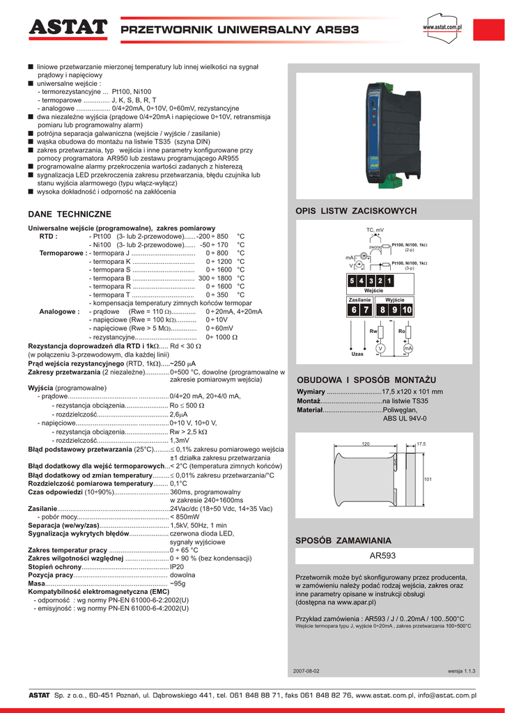 pRZETWORNIK UNIWERSALNY AR593 AR593 PRZETWORNIK UNIWERSALNY liniowe przetwarzanie mierzonej temperatury lub innej wielkoœci na sygna³ pr¹dowy i napiêciowy uniwersalne wejœcie : - termorezystancyjne ... Pt100, Ni100 - termoparowe .............. J, K, S, B, R, T - analogowe .................. 0/4÷20mA, 0÷10V, 0÷60mV, rezystancyjne dwa niezale¿ne wyjœcia (pr¹dowe 0/4÷20mA i napiêciowe 0÷10V, retransmisja pomiaru lub programowalny alarm) potrójna separacja galwaniczna (wejœcie / wyjœcie / zasilanie) w¹ska obudowa do monta¿u na listwie TS35 (szyna DIN) zakres przetwarzania, typ wejœcia i inne parametry konfigurowane przy pomocy programatora AR950 lub zestawu programuj¹cego AR955 programowalne alarmy przekroczenia wartoœci zadanych z histerez¹ sygnalizacja LED przekroczenia zakresu przetwarzania, b³êdu czujnika lub stanu wyjœcia alarmowego (typu w³¹cz-wy³¹cz) wysoka dok³adnoœæ i odpornoœæ na zak³ócenia DANE TECHNICZNE Uniwersalne wejœcie (programowalne), zakres pomiarowy RTD : - Pt100 (3- lub 2-przewodowe)...... -200 ÷ 850 °C - Ni100 (3- lub 2-przewodowe)...... -50 ÷ 170 °C Termoparowe : - termopara J .................................. 0 ÷ 800 °C - termopara K ................................. 0 ÷ 1200 °C - termopara S ................................. 0 ÷ 1600 °C - termopara B ................................. 300 ÷ 1800 °C - termopara R ................................. 0 ÷ 1600 °C - termopara T ................................. 0 ÷ 350 °C - kompensacja temperatury zimnych koñców termopar Analogowe : - pr¹dowe (Rwe = 110 ............. 0 ÷ 20mA, 4÷20mA - napiêciowe (Rwe = 100 k........... 0 ÷ 10V - napiêciowe (Rwe > 5 M.............. 0 ÷ 60mV - rezystancyjne................................. 0÷ 1000 Rezystancja doprowadzeñ dla RTD i 1k..... Rd < 30 (w po³¹czeniu 3-przewodowym, dla ka¿dej linii) Pr¹d wejœcia rezystancyjnego (RTD, 1k).....~250 A Zakresy przetwarzania (2 niezale¿ne)............. 0÷500 °C, dowolne (programowalne w zakresie pomiarowym wejœcia) Wyjœcia (programowalne) - pr¹dowe..................................... ................ 0/4÷20 mA, 20÷4/0 mA, - rezystancja obci¹zenia....................... Ro 500 - rozdzielczoœæ...................................... 2,6A - napiêciowe................................. ................ 0÷10 V, 10÷0 V, - rezystancja obci¹zenia....................... Rw > 2,5 k - rozdzielczoœæ...................................... 1,3mV B³¹d podstawowy przetwarzania (25°C)......... 0,1% zakresu pomiarowego wejœcia ±1 dzia³ka zakresu przetwarzania B³¹d dodatkowy dla wejœæ termoparowych...< 2°C (temperatura zimnych koñców) B³¹d dodatkowy od zmian temperatury......... 0,01% zakresu przetwarzania/°C Rozdzielczoœæ pomiarowa temperatury........ 0,1°C Czas odpowiedzi (10÷90%)............................. 360ms, programowalny w zakresie 240÷1600ms Zasilanie............................................................24Vac/dc (18÷50 Vdc, 14÷35 Vac) - pobór mocy................................................. < 850mW Separacja (we/wy/zas)..................................... 1,5kV, 50Hz, 1 min Sygnalizacja wykrytych b³êdów..................... czerwona dioda LED, sygna³y wyjœciowe Zakres temperatur pracy ................................0 ÷ 65 °C Zakres wilgotnoœci wzglêdnej ....................... 0 ÷ 90 % (bez kondensacji) Stopieñ ochrony.............................................. IP20 Pozycja pracy.................................................. dowolna Masa................................................................. ~95g Kompatybilnoœæ elektromagnetyczna (EMC) - odpornoœæ : wg normy PN-EN 61000-6-2:2002(U) - emisyjnoœæ : wg normy PN-EN 61000-6-4:2002(U) OPIS LISTW ZACISKOWYCH TC, mV + _ Pt100, Ni100, 1k (2-p) zwora mA _ V _ + Pt100, Ni100, 1k (3-p) + 5 4 3 2 1 Wejœcie Wyjœcie Zasilanie 6 7 8 9 10 - Ro Rw Uzas + + - - V mA OBUDOWA I SPOSÓB MONTA¯U Wymiary .............................17,5 x120 x 101 mm Monta¿.................................na listwie TS35 Materia³................................Poliwêglan, ABS UL 94V-0 120 17,5 101 SPOSÓB ZAMAWIANIA AR593 Przetwornik mo¿e byæ skonfigurowany przez producenta, w zamówieniu nale¿y podaæ rodzaj wejœcia, zakres oraz inne parametry opisane w instrukcji obs³ugi (dostêpna na www.apar.pl) Przyk³ad zamówienia : AR593 / J / 0..20mA / 100..500°C Wejœcie termopara typu J, wyjœcie 0÷20mA , zakres przetwarzania 100÷500°C 2007-08-02 APAR wersja 1.1.3 02-699 Warszawa, ul.K³obucka 8 pawilon 119, tel. (0-22) 853-48-56, 853-49-30, 607-98-95, fax (0-22) 607-99-50, e-mail [email protected], internet www.apar.pl ASTAT Sp. z o.o., 60-451 Poznań, ul. Dąbrowskiego 441, tel. 061 848 88 71, faks 061 848 82 76, www.astat.com.pl, [email protected]