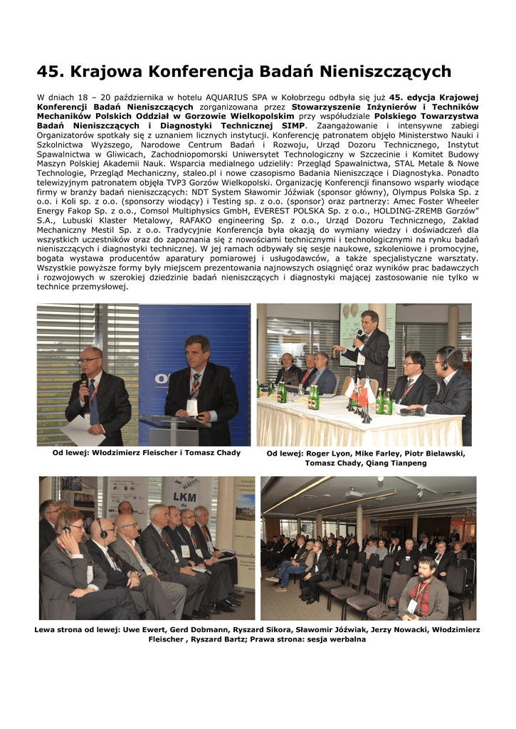 45. Krajowa Konferencja Badań Nieniszczących W dniach 18 – 20 października w hotelu AQUARIUS SPA w Kołobrzegu odbyła się już 45. edycja Krajowej Konferencji Badań Nieniszczących zorganizowana przez Stowarzyszenie Inżynierów i Techników Mechaników Polskich Oddział w Gorzowie Wielkopolskim przy współudziale Polskiego Towarzystwa Badań Nieniszczących i Diagnostyki Technicznej SIMP. Zaangażowanie i intensywne zabiegi Organizatorów spotkały się z uznaniem licznych instytucji. Konferencję patronatem objęło Ministerstwo Nauki i Szkolnictwa Wyższego, Narodowe Centrum Badań i Rozwoju, Urząd Dozoru Technicznego, Instytut Spawalnictwa w Gliwicach, Zachodniopomorski Uniwersytet Technologiczny w Szczecinie i Komitet Budowy Maszyn Polskiej Akademii Nauk. Wsparcia medialnego udzieliły: Przegląd Spawalnictwa, STAL Metale & Nowe Technologie, Przegląd Mechaniczny, staleo.pl i nowe czasopismo Badania Nieniszczące i Diagnostyka. Ponadto telewizyjnym patronatem objęła TVP3 Gorzów Wielkopolski. Organizację Konferencji finansowo wsparły wiodące firmy w branży badań nieniszczących: NDT System Sławomir Jóźwiak (sponsor główny), Olympus Polska Sp. z o.o. i Koli sp. z o.o. (sponsorzy wiodący) i Testing sp. z o.o. (sponsor) oraz partnerzy: Amec Foster Wheeler Energy Fakop Sp. z o.o., Comsol Multiphysics GmbH, EVEREST POLSKA Sp. z o.o., HOLDING-ZREMB Gorzów” S.A., Lubuski Klaster Metalowy, RAFAKO engineering Sp. z o.o., Urząd Dozoru Technicznego, Zakład Mechaniczny Mestil Sp. z o.o. Tradycyjnie Konferencja była okazją do wymiany wiedzy i doświadczeń dla wszystkich uczestników oraz do zapoznania się z nowościami technicznymi i technologicznymi na rynku badań nieniszczących i diagnostyki technicznej. W jej ramach odbywały się sesje naukowe, szkoleniowe i promocyjne, bogata wystawa producentów aparatury pomiarowej i usługodawców, a także specjalistyczne warsztaty. Wszystkie powyższe formy były miejscem prezentowania najnowszych osiągnięć oraz wyników prac badawczych i rozwojowych w szerokiej dziedzinie badań nieniszczących i diagnostyki mającej zastosowanie nie tylko w technice przemysłowej. Od lewej: Włodzimierz Fleischer i Tomasz Chady Od lewej: Roger Lyon, Mike Farley, Piotr Bielawski, Tomasz Chady, Qiang Tianpeng Lewa strona od lewej: Uwe Ewert, Gerd Dobmann, Ryszard Sikora, Sławomir Jóźwiak, Jerzy Nowacki, Włodzimierz Fleischer , Ryszard Bartz; Prawa strona: sesja werbalna Od lewej: Roger Lyon, Mike Farley, Piotr Bielawski W Konferencji wzięło udział około 300 uczestników, w tym ponad 50 zaproszonych gości z kraju i zagranicy. Należy podkreślić wyjątkowo liczne grono znanych światowych specjalistów, a także obecność przedstawicieli najważniejszych międzynarodowych, zagranicznych i krajowych organizacji oraz instytucji zajmujących się tematyką badań nieniszczących. Swoją obecnością zaszczycili uczestników Konferencji m.in.: Dr Mike Farley – ustępujący Przewodniczący The International Committee for Non-Destructive Testing (ICNDT), Prof. Roger Lyon – Wiceprzewodniczący European Federation of Non-Destructive Testing (EFNDT), Prof. Qiang Tianpeng – Przewodniczący Forum Far East on NDT, a także Pani Hannelore Wessel-Sagebade przedstawiciel The German Society for Non-Destructive Testing (DGZfP), Doc. Ing. Pavel Mazal – President of the Czech Society for Nondestructive Testing (ČNDT), Prof. Uwe Ewert – Federal Institute of Materials Research and Testing (BAM) i Prof. Gerd Dobmann – Universität des Saarlandes, Prof. Ryszard Sikora – Zachodniopomorski Uniwersytet Technologiczny w Szczecinie, Pani Jolanta Kochańska - Zastępca Prezesa Polskiego Komitetu Normalizacyjnego ds. Normalizacji oraz Pan Krzysztof Woźniak przedstawiciel Polskiego Centrum Akredytacji. Od prawej: Hannelore Wessel-Sagebade i Tomasz Chady Qiang Tiangpeng Od lewej: Piotr Bielawski i Ryszard Bartz Tomasz Chady Od lewej: Marek Lipnicki, Christian Segebade, Hannelore Wessel-Sagebade, Pavel Mazal, Marta Wojas Jerzy Nowacki Tradycyjnie w Konferencji uczestniczyli przedstawiciele największych polskich instytucji, organizacji i firm zajmujących się tematyką podejmowaną na KKBN. Ceremonię uroczystego otwarcia rozpoczął Przewodniczący Komitetu Organizacyjnego Pan Włodzimierz Fleischer, który zaprosił do współprowadzenia Prezesa PTBNiDT SIMP Prof. Tomasza Chadego. Następnie głos zabrali Przewodniczący Komitetu Naukowego Prof. Piotr Bielawski przedstawiając pracę Komitetu, zaproszeni goście zagraniczni, a na koniec Pan Ryszard Bartz – Organizator Wystawy, który zaprezentował wystawców i zaprosił sponsorów do krótkiej przemowy. W trakcie otwarcia przedstawiono również nowe inicjatywy PTBNiDT: nowe czasopismo „Badania Nieniszczące i Diagnostyka” i medal im. Prof. Z. Pawłowskiego. W trakcie Konferencji odbyły się 62 wystąpienia w ramach 11 sesji werbalnych, jednej sesji specjalnej – panelowej poświęconej tematyce certyfikacji i akredytacji oraz jednej plakatowej, a także jednej promocji i wystawców. Podczas Konferencji poruszono zarówno problematykę tradycyjną związaną z badaniami nieniszczącymi materiałów i elementów maszyn i konstrukcji (ang. Non-Destructive Testing - NDT), jak i problematykę identyfikacji stanu technicznego konstrukcji (ang. Structural Health Monitoring - SHM) i diagnostyki technicznej maszyn (ang. Condition Monitoring and Diagnostics of Machines). Jednym z kluczowych aspektów była również, wyraźnie interesująca uczestników konferencji, problematyka certyfikacji, akredytacji i normalizacji na potrzeby różnych gałęzi przemysłu - prezentowana m.in. podczas sesji specjalnej – panelu dyskusyjnego. Podejmowano także tematy z innych ważnych obszarów, m.in. zastosowania badań nieniszczących w medycynie, co świadczy o rosnącej konieczności integracji środowisk technicznych i medycznych na potrzeby rozwoju. Zauważyć można również wzrost zaintere