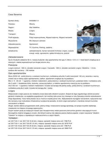 Casa Severina Symbol oferty: 5443085/111 Państwo: Włochy Region: Alta Valtellina Miasto: Livigno Transport: Własny Profil wyjazdu: Pobyt wypoczynkowy, Wyjazd rodzinny, Wyjazd narciarski Wyżywienie: We własnym zakresie Zakwaterowanie: Apartament Wyposażenie: TV, Kuchnia, Parking, Jadalnia świadczenia: zakwaterowanie, karnet narciarski 6-dniowy Livigno, zużycie energii, wody, ogrzewanie; opłata klimatyczna, pościel Zakwaterowanie Są to 2 budynki oddalone 50 m, nowszy budynek: dwa apartamenty trilo typu 5. Mono 1 2 6 x 4 i 1 beat beat 5 znajdują się w starszych i słabiej wyposażonych po drugiej stronie ulicy. Położenie Livigno centrum - 500 m, ośrodek narciarski Livigno / Carosello - 300 m, ośrodek narciarski Livigno / Mottolino - 1,5 km, autobus dla narciarzy - 100 metrów Opis apartamentów Mono 20/02 m2 - pokój dzienny z aneksem kuchennym, rozkładaną sofą dla 2 osób (szerokość 140 cm), łazienka z wanną (mieści się w niskiej części apartasmentu), balkon, apartament znajduje się na poddaszu. Bilo 4 / 5 - 30 m2 - 1 sypialnia z łóżkiem małżeńskim, pokój dzienny z aneksem kuchennym, podwójne łóżko i rozkładana sofa dla 2 osób i 1 dodatkowe łóżko, łazienka, zazwyczaj balkon, a niektóre apartamenty mieszczą się na poddaszu trilo 5-50 m2 - 1 sypialnia z łóżkiem małżeńskim i krzesło lub kanapa dla jednej osoby, pokój dzienny z aneksem kuchennym, rozkładaną sofą dla 2 osób i krzesła lub kanapą dla 1 osoby. Livigno Miejscowość Livigno jeszcze do niedawna znana była tylko włoskim turystom. Dojazd do tego zagubionego wśród szczytów górskich miasteczka, ze względów pogodowych, był możliwy tylko przez trzy miesiące w roku.Sytuację zmieniło wybudowanie drogi dojazdowej. Teraz której dostać się tu można w każdej porze roku. Wybudowanie wyciągów narciarskich, wytyczenie tras dla narciarzy oraz rozbudowa infrastruktury turystycznej sprawiły, że dziś Livigno jest jednym z bardziej znanych kurortów narciarskich w Alpach. Długie, bardzo dobrze przygotowane stoki, pewny śnieg i nowoczesne wyciągi sprawiają, że tysiące turystów wybierają miasteczko za miejsce zimowego wypoczynku. Dużym atutem jazdy po tutejszych trasach jest niezapomniany widok panoramy łańcuchów górskich otaczających kurort. Szczególnie chętnie ściągają tu turyści, dla których ważną rolę odgrywa pewna (ładna) pogoda. Livigno nazywane "włoskim Tybetem" to miejsce o największym nasłonecznieniu w całych Alpach. TERMINY: od: 2017-03-11 do: 2017-03-18 (8 dni), miejsca: sprawdź miejsca cena od: 1788 PLN od: 2017-03-11 do: 2017-03-25 (15 dni), miejsca: sprawdź miejsca cena od: 3576 PLN od: 2017-03-18 do: 2017-03-25 (8 dni), miejsca: sprawdź miejsca cena od: 1788 PLN od: 2017-03-18 do: 2017-04-01 (15 dni), miejsca: sprawdź miejsca cena od: 3566 PLN 1/2 od: 2017-03-25 do: 2017-04-01 (8 dni), miejsca: sprawdź miejsca cena od: 1778 PLN od: 2017-03-25 do: 2017-04-08 (15 dni), miejsca: sprawdź miejsca cena od: 2954 PLN od: 2017-04-01 do: 2017-04-08 (8 dni), miejsca: sprawdź miejsca cena od: 1177 PLN od: 2017-04-01 do: 2017-04-15 (15 dni), miejsca: sprawdź miejsca cena od: 2354 PLN od: 2017-04-08 do: 2017-04-15 (8 dni), miejsca: zamów cena od: 1177 PLN dodatkowe informacje/uwagi: karnet narciarski w cenie od: 2017-04-15 do: 2017-04-22 (8 dni), miejsca: zamów cena od: 1177 PLN dodatkowe informacje/uwagi: karnet narciarski w cenie CENNIK: Długość pobytu: 15 dni 8 dni 15 dni 8 dni 15 dni 8 dni Grupa cenowa: H H L0703 L0703 L0503 L0503 7580 3790 14980 7490 5832 2916 16980 8490 5132 2566 7780 3890 11272 5636 17580 8790 9174 4587 13980 6990 Pobyt w obiekcie (do wyboru) apartament BILO 4-osobowy dla 3 osób standardowo dla osób: 3 11868 5934 apartament BILO 4-osobowe dla 2 osób standardowo dla osób: 2 9592 4796 apartament 2 - osobowy typu MONO standardowo dla osób: 2 7780 3890 apartament BILO 5-osobowe standardowo dla osób: 5 17580 8790 (*) apartament BILO 4-osobowy dla 4-osób standardowo dla osób: 4 14064 7032 Ubezpieczenie (do wyboru) (*) ubezpieczenie NW KL ubezpieczene NWKL SKI 60 30 60 30 60 30 140 70 140 70 140 70 Waluta: PLN Aktualne ceny z systemu S.A.R.T. (-) - cena usługi, podatku kalkulowana przy osobie lub gratis (*) - kwota wliczona w cenę standardową 2/2