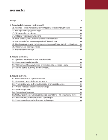 SPIS TREŚCI Wstęp4 1. Grawitacja i elementy astronomii 1.1. Kosmos i świat mikroskopowy. Magia wielkich i małych liczb 1.2. Ruch jednostajny po okręgu 1.3. Siły w ruchu po okręgu 1.4. Oddziaływania grawitacyjne 1.5. Stan przeciążenia, niedociążenia i nieważkości 1.6. Ruch satelitów. Pierwsza prędkość kosmiczna 1.7. Zjawiska związane z ruchem naszego naturalnego satelity – Księżyca 1.8. Obserwacje nocnego nieba 1.9. Elementy kosmologii 0 0 0 0 0 0 0 0 0 2. Fizyka atomowa 2.1. Zjawisko fotoelektryczne. Fotokomórka 2.2. Kwantowa teoria światła 2.3. Widma światła wysyłanego przez ciała stałe, ciecze i gazy 2.4. Model Bohra budowy atomu wodoru. 0 0 0 0 3. Fizyka jądrowa 3.1. Budowa materii. Jądro atomowe 3.2. Rozmiary i masy jąder atomowych 3.3. Promieniowanie jądrowe. Rozpady promieniotwórcze 3.4. Prawo rozpadu promieniotwórczego 3.5. Reakcje jądrowe 3.6. Energetyka jądrowa 3.7. Wpływ promieniowania jądrowego na materię i na organizmy żywe 3.8. Wykrywanie promieniowania jądrowego 3.9. Zastosowania promieniowania jądrowego 0 0 0 0 0 0 0 0 0 3
