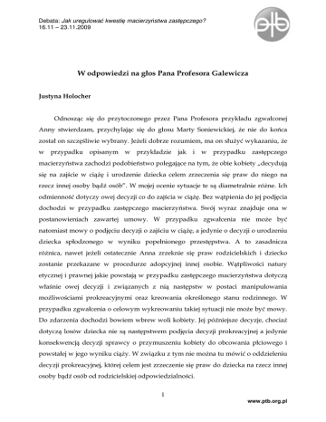 Debata: Jak uregulować kwestię macierzyństwa zastępczego? 16.11 – 23.11.2009 W odpowiedzi na głos Pana Profesora Galewicza Justyna Holocher Odnosząc się do przytoczonego przez Pana Profesora przykładu zgwałconej Anny stwierdzam, przychylając się do głosu Marty Soniewickiej, że nie do końca został on szczęśliwie wybrany. Jeżeli dobrze rozumiem, ma on służyć wykazaniu, że w przypadku opisanym w przykładzie jak i w przypadku zastępczego macierzyństwa zachodzi podobieństwo polegające na tym, że obie kobiety „decydują się na zajście w ciążę i urodzenie dziecka celem zrzeczenia się praw do niego na rzecz innej osoby bądź osób”. W mojej ocenie sytuacje te są diametralnie różne. Ich odmienność dotyczy owej decyzji co do zajścia w ciążę. Bez wątpienia do jej podjęcia dochodzi w przypadku zastępczego macierzyństwa. Swój wyraz znajduje ona w postanowieniach zawartej umowy. W przypadku zgwałcenia nie może być natomiast mowy o podjęciu decyzji o zajściu w ciążę, a jedynie o decyzji o urodzeniu dziecka spłodzonego w wyniku popełnionego przestępstwa. A to zasadnicza różnica, nawet jeżeli ostatecznie Anna zrzeknie się praw rodzicielskich i dziecko zostanie przekazane w procedurze adopcyjnej innej osobie. Wątpliwości natury etycznej i prawnej jakie powstają w przypadku zastępczego macierzyństwa dotyczą właśnie owej decyzji i związanych z nią następstw w postaci manipulowania możliwościami prokreacyjnymi oraz kreowania określonego stanu rodzinnego. W przypadku zgwałcenia o celowym wykreowaniu takiej sytuacji nie może być mowy. Do zdarzenia dochodzi bowiem wbrew woli kobiety. Jej późniejsze decyzje, chociaż dotyczą losów dziecka nie są następstwem podjęcia decyzji prokreacyjnej a jedynie konsekwencją decyzji sprawcy o przymuszeniu kobiety do obcowania płciowego i powstałej w jego wyniku ciąży. W związku z tym nie można tu mówić o oddzieleniu decyzji prokreacyjnej, której celem jest zrzeczenie się praw do dziecka na rzecz innej osoby bądź osób od rodzicielskiej odpowiedzialności. 1 www.ptb.org.pl Debata: Jak uregulować kwestię macierzyństwa zastępczego? 16.11 – 23.11.2009 Zaznaczyć również należy, że oba przypadki różnią się nie tylko „okolicznościami stanu faktycznego”, ale także rodzajem konsekwencji prawnych. Anna może zatrzymać dziecko albo zrzec się wobec niego praw rodzicielskich. W pierwszym przypadku ona będzie prawnym opiekunem urodzonego dziecka. W drugim może zostać uruchomiona procedura adopcyjna. Sytuacja jest więc, jeżeli w ogóle można tak powiedzieć, jasna. W przypadku zastępczego macierzyństwa, jeżeli matka zastępcza w trakcie trwania ciąży lub po urodzeniu dziecka zmieni zdanie, sytuacja będzie dużo bardziej skomplikowana. Problemy pojawią się przy próbie określenia uprawnień stron i zakresu możliwych do dochodzenia roszczeń. Będzie tak zapewne nawet wówczas, gdy zastępcze macierzyństwo stanie się elementem porządku prawnego. Przesądza o tym charakter samego zjawiska i niełatwe kolizje dóbr wymagających ochrony. 2