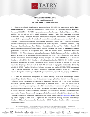 REGULAMIN HANDLOWY Sprytny Karnet vol. 2 SEZON NARCIARSKI 2015/2016 1. Niniejszy regulamin handlowy na sezon narciarski 2015/2016 wydany przez spółkę Tatry mountain resorts, a.s. z siedzibą: Demänovská Dolina 72, 031 01 Liptovský Mikuláš, Republika Słowacka, REGON: 31 560 636, wpisaną do rejestru handlowego w Sądzie Rejonowym Žilina, wydział: Sa, pozycja nr: 62/L (dalej nazywaną „spółka TMR“ lub „zarządca“) reguluje świadczenie usług – transport kolejami linowymi i wyciągami narciarskimi, korzystanie z tras narciarskich w poszczególnych ośrodkach narciarskich zarządzanych przez spółkę TMR oraz związane z tym prawa i obowiązki na podstawie Sprytnego Karnetu vol.2. Niniejszy regulamin handlowy obowiązuje w ośrodkach narciarskich Tatry Wysokie – Tatranská Lomnica, Tatry Wysokie – Starý Smokovec, Tatry Niskie – Jasná (Chopok Sever), Tatry Niskie – Chopok Juh oraz w ośrodku narciarskim Štrbské Pleso, którego zarządcą jest spółka 1. Tatranská, akciová spoločnosť, z siedzibą: K vodopádom 4051, 059 85 Štrbské Pleso, Republika Słowacka, REGON: 31 395 783, wpisana do rejestru handlowego w Sądzie Rejonowym Prešov, wydział: Sa, pozycja nr: 10427/P, w przypadku Sprytnego karnetu vol. 2 SKI Tatry+Špindlerův Mlýn także w ośrodku narciarskim Špindlerův Mlýn, którego zarządcą jest spółka MELIDA, a.s., z siedzibą Špindlerův Mlýn 238, 543 51 Špindlerův Mlýn, Republika Czeska, REGON: 241 66 511, wpisana do rejestru handlowego w Sądzie Rejonowym Hradci Králové, wydział: B, pozycja nr: 3175, a w przypadku Sprytnego karnetu vol. 2 SKI+WP również w aquaparku Tatralandia Liptovský Mikuláš i GINO Paradise Bešeňová, którego zarządcą jest spółka EUROCOM Investment, s.r.o., z siedzibą Bešeňová 136, 034 83 Bešeňová, Republika Słowacka, REGON: 35 756 985, wpisana do rejestru handlowego w Sądzie Rejonowym Žilina, wydział: Sro, pozycja nr: 14588/L. 2. Klient ma możliwość zakupienia na sezon zimowy 2015/2016 sezonowego karnetu narciarskiego Sprytny Karnet vol. 2 (dalej nazywanego „Sprytny Karnet vol. 2“) zgodnie z odrębną ofertą zarządzającego dotyczącą Sprytnego Karnetu vol. 2 na sezon narciarski 2015/2016. Sprytny Karnet vol. 2 obowiązuje w terminie od 04.12.2015 do 30.04.2016, w godzinach otwarcia poszczególnych ośrodków narciarskich w rozumieniu pkt 8.3 niniejszego regulaminu handlowego oraz w zależności od rodzaju Sprytnego Karnetu vol. 2, w terminie od 04.12.2015 do 30.04.2016 w Aquaparku Tatralandia i GINO Paradise Bešeňová, lub na wieczorne szusowanie. Sprytny Karnet vol. 2 nie uprawnia do korzystania z kolejki linowej na trasie Staw Łomnicki – Łomnica. Informacje publikowane na stronie internetowej www.gopass.sk określają, czy dany Sprytny Karnet vol. 2 uprawnia do korzystania z usług ośrodka narciarskiego Špindlerův Mlýn, a/lub Aquaparku Tatralandia i GINO Paradise Bešeňová i/lub wieczornego szusowania, czy nie. 3. Spółka TMR wydaje Sprytny Karnet vol. w postaci bezstykowej karty czipowej – KEY CARD z danymi identyfikacyjnymi posiadacza Sprytnego Karnetu vol. 2. Bezstykowa karta czipowa – KEY CARD – uprawnia posiadacza (osobę, której dane identyfikacyjne zawiera Sprytny Karnet vol. 2) do korzystania z usług świadczonych w poszczególnych ośrodkach narciarskich zarządzanych przez spółkę TMR oraz w ośrodku narciarskim Štrbské Pleso lub w ośrodku Skiareal Špindlerův Mlýn lub w Aquaparku Tatralandia i GINO Paradise Bešeňová w zakresie zależnym od rodzaju zakupionego Sprytnego Karnetu vol. 2 i informacji o zakresie usług publikowanych stronie internetowej www.gopass.sk. 4. Klient ma możliwość zakupienia Sprytnego Karnetu vol. 2 w okresie od 16.09.2015 do 31.10.2015 wyłącznie online za pośrednictwem strony internetowej www.gopass.sk. następująco: 4.1 Sprytny Karnet vol. 2 SKI uprawniający posiadacza do korzystania z usług ośrodków narciarskich zarządzanych przez spółkę TMR i w ośrodku narciarskim Štrbské Pleso w dziennych godzinach otwarcia urządzeń transportowych w okresie od 04.12.2015 do 30.04.2016 – łączna cena 249,- EUR, 4.2 Sprytny Karnet vol. 2 SKI+WP uprawniający posiadacza do korzystania z usług ośrodków narciarskich zarządzanych przez spółkę TMR i w ośrodku narciarskim Štrbské Pleso w dziennych godzinach otwarcia urządzeń transportowych w okresie od 04.12.2015 do 30.04.2016 oraz w okresie od 04.12.2015 do 30.04.2016 także do korzystania z usług Aquaparku Tatralandia w zakresie całodziennego biletu wstępu typu „Tropical Packet“ i aquaparku GINO Paradise Bešeňová w zakresie całodziennego biletu wstępu typu „SEA&FUN Packet“ – cena kupna ogółem 299,- EUR, 4.3 Sprytny Karnet vol. 2 SKI+WP&NIGHT uprawniający posiadacza do korzystania z usług ośrodków narciarskich zarządzanych przez spółkę TMR i w ośrodku narciarskim Štrbské Pleso w dziennych godzinach otwarcia urządzeń transportowych w okresie 04.12.2015 do 30.04.2016 oraz w okresie 04.12.2015 do 30.04.2016 do korzystania z usług Aquaparku Tatralandia w zakresie całodziennego biletu wstępu typu „Tropical Packet“ i aquaparku GINO Paradise Bešeňová w zakresie całodziennego biletu wstępu typu „SEA&FUN Packet“, oraz w okresie od 04.12.2015 do 30.04.2016 do wieczornego szusowania – cena kupna ogółem 349,- EUR, 4.4 Sprytny Karnet vol. 2 SKI Tatry+Špindlerův Mlýn uprawniający posiadacza do korzystania z usług ośrodków narciarskich zarządzanych przez spółkę TMR, w ośrodku narciarskim Štrbské Pleso oraz ośrodku narciarskim Skiareal Špindlerův Mlýn w dziennych godzinach otwarcia urządzeń transportowych w okresie od 04.12.2015 do 30.04.2016 cena kupna ogółem 399,- EUR 5. Sprytne Karnety w obniżonej cenie: 5.1 Prawo do zakupu Sprytnego Karnetu vol. 2 „Senior“ przysługuje osobom w wieku 60 lat i więcej. Aby skorzystać z prawa do zakupu Sprytnego Karnetu vol. 2 „Senior“ 