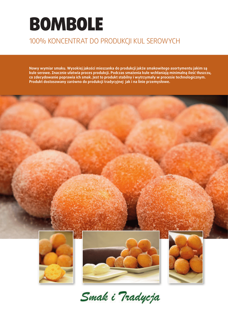 BOMBOLE 100% koncentrat do produkcji kul serowych Nowy wymiar smaku. Wysokiej jakości mieszanka do produkcji jakże smakowitego asortymentu jakim są kule serowe. Znacznie ułatwia proces produkcji. Podczas smażenia kule wchłaniają minimalną ilość tłuszczu, co zdecydowanie poprawia ich smak. Jest to produkt stabilny i wytrzymały w procesie technologicznym. Produkt dostosowany zarówno do produkcji tradycyjnej jak i na linie przemysłowe. BOMBOLE 100% koncentrat do produkcji kul serowych RECEPTURA z serem białym RECEPTURA z serem białym Koncentrat ciasta „Bombole” 1000 g Ser biały 500 g Jaja 500 g Olej 100 g Woda 360 g Sposób wykonania: Wszystkie składniki wymieszać w maszynie cukierniczej na wolnych obrotach do połączenia składników. Odstawić na ok. 15 min, następnie wypiekać w temp. ok. 160 -170°C. RECEPTURA z maślanką RECEPTURA z maślanką Koncentrat ciasta „Bombole” 1000 g Maślanka 860 g Jaja 500 g Mąka pszenna typ 500 200 g Olej 100 g Sposób wykonania: Wszystkie składniki wymieszać w maszynie cukierniczej na wolnych obrotach do połączenia składników. Odstawić na ok. 15 min, następnie wypiekać w temp. ok. 160 -170°C. Producent dodatków dla piekarstwa i cukiernictwa Eco Trade Sp. z o.o. ul. Okrężna 8, 44-100 Gliwice, tel./fax +48 32 231 20 87–88, www.ecotrade.pl, e‑mail [email protected] www.facebook.com/Ecotrade.gliwice