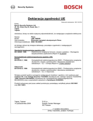 Security Systems Deklaracja zgodności UE Dokument odniesienia: <EC-10-015> Firma Bosch Security Systems Ltd. 3F, 96, Chien Kuo N. Road, Sec. 1 Tajpej Tajwan oświadcza, biorąc na siebie wyłączną odpowiedzialność, że następujące urządzenie elektryczne: Nazwa: Model: Opis produktu: Informacje dodatkowe: Plena LBB 1968/00 Eliminator sprzężeń akustycznych Plena 8900 196 80001 do którego odnosi się niniejsza deklaracja, pozostaje w zgodności z następującymi wymaganiami: Standardy bezpieczeństwa zgodnie z EN: IEC 60065: 1998 Elektroniczne urządzenia foniczne, wizyjne i podobne – Wymagania bezpieczeństwa użytkowania (Raport nr AL92005) Kompatybilność elektromagnetyczna zgodnie z EN: Emisja EN 55103-1: 1996 Kompatybilność elektromagnetyczna (EMC) - Profesjonalne urządzenia akustyczne, wizyjne, audiowizualne i sterowania oświetleniem estradowym – Cz. 1: Emisja (Raport nr TTEMC-E92053) Odporność EN 55103-2: 1996 Kompatybilność elektromagnetyczna (EMC) - Profesjonalne urządzenia akustyczne, wizyjne, audiowizualne i sterowania oświetleniem estradowym – Cz. 2: Odporność. Niniejszy produkt spełnia wymagania następujących dyrektyw i zgodnie z nimi opatrzony jest znakiem CE: Low Voltage Directive 73/23/EEC (Dyrektywa dot. niskiego napięcia 73/23/EWG) i EMC Directive 89/336/EEC (Dyrektywa dot. kompatybilności elektromagnetycznej 89/336/EWG) wraz z poprawkami zawartymi w Dyrektywie 93/68/EEC. Produkt wytwarzany jest przez zakład produkcyjny posiadający certyfikaty jakości ISO 9001 oraz ISO 14001. Tajpej, Tajwan 14 października 2004 D.S.Lo Supply Center Manager SC-Taiwan ___________/-/ podpis nieczytelny __________ (Imię i nazwisko, podpis i funkcja)