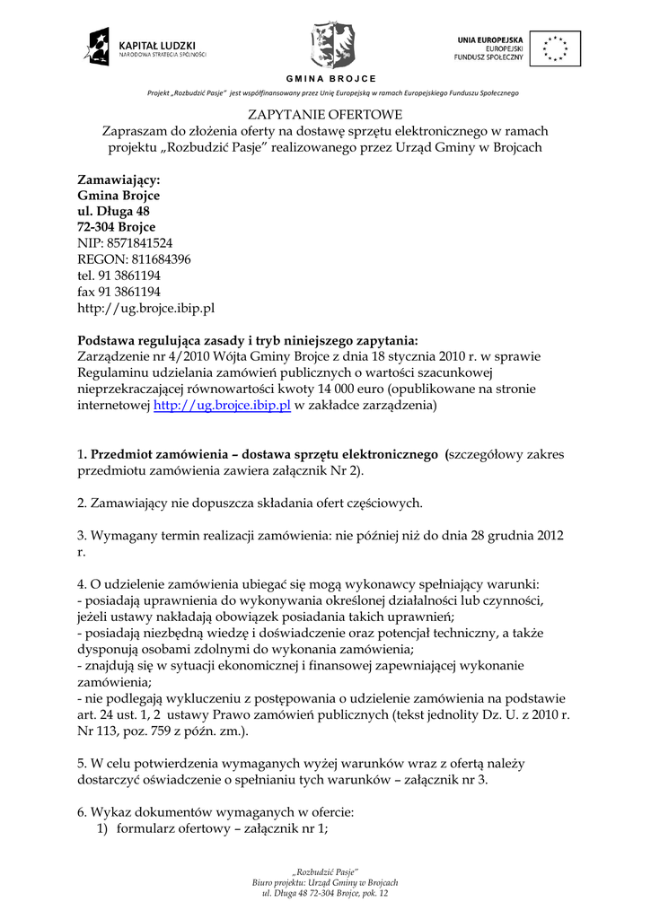 GMINA BROJCE Projekt „Rozbudzić Pasje” jest współfinansowany przez Unię Europejską w ramach Europejskiego Funduszu Społecznego ZAPYTANIE OFERTOWE Zapraszam do złożenia oferty na dostawę sprzętu elektronicznego w ramach projektu „Rozbudzić Pasje” realizowanego przez Urząd Gminy w Brojcach Zamawiający: Gmina Brojce ul. Długa 48 72-304 Brojce NIP: 8571841524 REGON: 811684396 tel. 91 3861194 fax 91 3861194 http://ug.brojce.ibip.pl Podstawa regulująca zasady i tryb niniejszego zapytania: Zarządzenie nr 4/2010 Wójta Gminy Brojce z dnia 18 stycznia 2010 r. w sprawie Regulaminu udzielania zamówień publicznych o wartości szacunkowej nieprzekraczającej równowartości kwoty 14 000 euro (opublikowane na stronie internetowej http://ug.brojce.ibip.pl w zakładce zarządzenia) 1. Przedmiot zamówienia – dostawa sprzętu elektronicznego (szczegółowy zakres przedmiotu zamówienia zawiera załącznik Nr 2). 2. Zamawiający nie dopuszcza składania ofert częściowych. 3. Wymagany termin realizacji zamówienia: nie później niż do dnia 28 grudnia 2012 r. 4. O udzielenie zamówienia ubiegać się mogą wykonawcy spełniający warunki: - posiadają uprawnienia do wykonywania określonej działalności lub czynności, jeżeli ustawy nakładają obowiązek posiadania takich uprawnień; - posiadają niezbędną wiedzę i doświadczenie oraz potencjał techniczny, a także dysponują osobami zdolnymi do wykonania zamówienia; - znajdują się w sytuacji ekonomicznej i finansowej zapewniającej wykonanie zamówienia; - nie podlegają wykluczeniu z postępowania o udzielenie zamówienia na podstawie art. 24 ust. 1, 2 ustawy Prawo zamówień publicznych (tekst jednolity Dz. U. z 2010 r. Nr 113, poz. 759 z późn. zm.). 5. W celu potwierdzenia wymaganych wyżej warunków wraz z ofertą należy dostarczyć oświadczenie o spełnianiu tych warunków – załącznik nr 3. 6. Wykaz dokumentów wymaganych w ofercie: 1) formularz ofertowy – załącznik nr 1; „Rozbudzić Pasje” Biuro projektu: Urząd Gminy w Brojcach ul. Długa 48 72-304 Brojce, pok. 12 GMINA BROJCE Projekt „Rozbudzić Pasje” jest współfinansowany przez Unię Europejską w ramach Europejskiego Funduszu Społecznego 2) szczegółowy zakres przedmiotu zamówienia – załącznik nr 2; 3) oświadczenie, o którym mowa w punkcie 5 – załącznik nr 3; 4) parafowany projekt umowy – załącznik nr 4. 7. Oferta wraz z załącznikami winna być napisana w języku polskim, trwałą i czytelną techniką, wypełniona i parafowana w całości oraz podpisana przez osobę upoważnioną do reprezentowania firmy. 8. Wykonawca poniesie wszelkie koszty związane z przygotowaniem i złożeniem oferty. Zamawiający nie przewiduje zwrotu kosztów udziału w postępowaniu poniesionych przez wykonawcę. 9. Przy wyborze oferty Zamawiający będzie kierował się kryterium najniższej ceny. 10. Okres związania ofertą wynosi 30 dni od daty złożenia oferty. 11. Wykonawca złoży ofertę w zaklejonej kopercie skierowanej na adres Zamawiającego wraz z oznaczeniem „Oferta na dostawę sprzętu elektronicznego w ramach projektu Rozbudzić Pasje” 12. Termin składania ofert upływa dnia 12 grudnia 2012 r. o godz. 11.00, oferty należy składać w sekretariacie Urzędu Gminy w Brojcach (pokój nr 10). 13. Otwarcie ofert nastąpi w dniu 12 grudnia 2012 r. o godz. 11.15 w siedzibie Zamawiającego. 14. Zamawiający udzieli zamówienia Wykonawcy, którego oferta odpowiada zasadom określonym w niniejszym zapytaniu oraz zostanie uznana za najkorzystniejszą. 15. Zgodnie z § 5 cytowanego zarządzenia Zamawiający zastrzega sobie prawo do podjęcia decyzji w sprawie zamknięcia postępowania przed upływem terminu składania ofert lub unieważnienia postępowania po tym terminie. 16. Zamawiający powiadomi wszystkich Wykonawców o wyniku postępowania. W zawiadomieniu wysłanym do Wykonawcy, którego oferta została wybrana Zamawiający określi termin i miejsce zawarcia umowy Zamawiający: Wójt Gminy Brojce „Rozbudzić Pasje” Biuro projektu: Urząd Gminy w Brojcach ul. Długa 48 72-304 Brojce, pok. 12 GMINA BROJCE Projekt „Rozbudzić Pasje” jest współfinansowany przez Unię Europejską w ramach Europejskiego Funduszu Społecznego Załącznik nr 1 ......................................, dn .............................. ................................................................ ................................................................ (nazwa i adres Wykonawcy) FORMULARZ OFERTOWY 1. Stosownie do warunków określonych w Zakresie Przedmiotu Zamówienia Firma nasza oferuje realizację zadania za poniższą cenę: Cena netto Podatek VAT Cena brutto …………….. zł …………….. zł …………….. zł (słownie:……………… (słownie:………………… (słownie:………………… …………………………) ……………………………) ……………………………) Zaproponowana cena wynika ze szczegółowej kalkulacji dokonanej w Tabeli 1. Tabela 1. Kalkulacja kosztów zamówienia Lp. Nazwa pozycji Ilość Cena netto VAT Cena brutto 1 2 szt. 3 4 5=(3+4)*szt. 6 2 Laptop z oprogramowaniem i programem antywirusowym Telewizor 3 Odtwarzacz blu-ray 2 4 Mikroskop z kamerą 4 5 Kamera cyfrowa 2 1 4 Razem 1. Termin realizacji zamówienia: wg zał. nr 2 – „Zakres przedmiotu zamówienia”. 2. Wyrażam zgodę na warunki płatności określone w zapytaniu ofertowym. 3. Oświadczam, że zapoznałem się z opisem przedmiotu zamówienia i nie wnoszę do niego zastrzeżeń. „Rozbudzić Pasje” Biuro projektu: Urząd Gminy w Brojcach ul. Długa 48 72-304 Brojce, pok. 12 GMINA BROJCE Projekt „Rozbudzić Pasje” jest współfinansowany przez Unię Europejską w ramach Europejskiego Funduszu Społecznego 4. Oświadczam, że spełniam warunki określone przez Zamawiającego. 5. Załącznikami do niniejszego formularza oferty stanowiącego integralną część oferty są: a. zakres przed