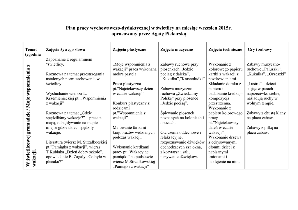 Plan pracy wychowawczo-dydaktycznej w świetlicy na miesiąc wrzesień 2015r. opracowany przez Agatę Piekarską W świetlicowej gromadzie./ Moje wspomnienia z wakacji. Temat tygodnia Zajęcia żywego słowa Zapoznanie z regulaminem "świetlicy. Rozmowa na temat przestrzegania ustalonych norm zachowania w świetlicy Wysłuchanie wiersza L. Krzemienieckiej pt. „Wspomnienia z wakacji” Rozmowa na temat „Gdzie spędziliśmy wakacje?” – praca z mapą, odnajdywanie na mapie miejsc gdzie dzieci spędziły wakacje. Literatura :wiersz M. Strzałkoeskiej pt.”Pamiątka z wakacji”, wiersz T.Kubiaka „Dzień dobry szkoło”, opowiadanie B. Zagały „Co było w plecaku?” Zajęcia plastyczne Zajęcia muzyczne „Moje wspomnienia z Zabawy ruchowe przy wakacji” praca wykonana piosenkach „Jedzie mokrą pastelą pociąg z daleka”, „Kukułka”,”Krasnoludki” Praca plastyczna Zabawa muzyczno – pt.”Najciekawszy dzień ruchowa „Zwiedzamy w czasie wakacji” Polskę” przy piosence „Jedzie pociąg”. Konkurs plastyczny z rodzicami Śpiewanie piosenek pt.”Wspomnienia z poznanych na koloniach i wakacji” obozach. Malowanie farbami krajobrazów widzianych Ćwiczenia oddechowe i relaksacyjne, podczas wakacji. rozpoznawanie dźwięków dochodzących zza okna, Wykonanie kredkami z korytarza i sali, pracy pt.”Wakacyjne nazywanie dźwięków. pamiątki” na podstawie wiersz M.Strzałkowskiej „Pamiątki z wakacji” Zajęcia techniczne Gry i zabawy Wykonanie z kolorowego papieru kartki z wakacji z pozdrowieniami. Składanie domku z papieru i ozdabianie kredką – kompozycja przestrzenna. Wykonanie z papieru kolorowego pracy pt.”Najciekawszy dzień w czasie wakacji”. Wykonanie drzewa z odrysowanymi dłońmi dzieci z napisanymi imionami i naklejenie na nim. Zabawy muzycznoruchowe „Paluszki”, „Kukułka”, „Orzeszki” „Lustro” – dzieci stojąc w parach naprzeciwko siebie, naśladują ruchy w wolnym tempie. Zabawy z chustą klany na placu zabaw. Zabawy z piłką na placu zabaw. Plan pracy wychowawczo-dydaktycznej w świetlicy na miesiąc wrzesień 2015r. opracowany przez Agatę Piekarską Temat tygodnia Zajęcia żywego słowa Zajęcia plastyczne Zajęcia muzyczne Zajęcia techniczne Gry i zabawy Poznanie znaków drogowych – ostrzegawczych, zakazu, nakazu i informacyjnych i nauka przechodzenia przez pasy z sygnalizacją świetlną „Na skrzyżowaniu” – malowanie mokrą pastelą na papierze ściernym. Nauka piosenek „Uliczne sygnały”, „Czerwone – stop, zielone - idź”, „Jak przechodzić przez ulicę”. Wykonanie wydzieranki z kolorowego papierusygnalizacja świetlna. Zabawa orientacyjnoruchowa: ”W lewo, w prawo, na wprost”. Moja bezpieczna droga do szkoły. Rozmowa na temat : W czym pomagają nam przepisy ruchu drogowego i dlaczego powinniśmy ich przestrzegać? Wykonanie farbami pracy plastycznej pt.”Moja droga do szkoły”. Obejrzenie filmu pt. „Bezpieczeństwo dzieci”. Rozmowa na temat bezpieczeństwa w szkole i poza nią. Wykonanie rysunku pastelami do opowiadania Janoscha „Miś Tygrysek chodzą po mieście”. Spotkanie z przedstawicielkami Straży Miejskiej na temat bezpiecznego poruszania się w drodze do szkoły. Przedstawienie kredką wydarzenia realnego – „Przechodzę przez jezdnię”. Zabawa orientacyjnoruchowa: ”Stój, idź” (nauczyciel włącza spokojną muzykę, dzieci reagują na kolor; kiedy nauczyciel podnosi lizak zielony-dzieci poruszają się w rytmie muzyki, lizak czerwony oznaczastój). Rozpoznawanie dźwięków pojazdów (samochód, tramwaj, autobus, motor itp.) – pakiet edukacyjny. „Policjant” – wydzieranka z kolorowego papieru. Wykonanie wybranego znaku drogowego z patyczka, plasteliny kolorowego papieru( znaki ostrzegawcze, zakazu, nakazu, informacyjne). Wykonanie znaczka odblaskowego. „Znam te znaki drogowe” – konkurs grupowy. Utrwalenie zasad ruchu drogowego w grach i zabawach: mijanie się w biegu, znajdź swój kolor, samochody, na skrzyżowaniu, sygnalizacja świetlna, przechodzę przez pasy. Rozwiązywanie krzyżówki z hasłem: Bezpieczeństwo”. Plan pracy wychowawczo-dydaktycznej w świetlicy na miesiąc wrzesień 2015r. opracowany przez Agatę Piekarską Grzeczność na co dzień i od święta. Temat tygodnia Zajęcia żywego słowa Zajęcia plastyczne Zajęcia muzyczne Zajęcia techniczne Gry i zabawy Zapoznanie dzieci z podstawowymi zwrotami grzecznościowymi: proszę, przepraszam, dziękuję. Wykonanie drzewa z magicznymi słowami. Nauka słów piosenki pt.”Grzeczne słowa”. Wykonanie laurki dla ulubionej koleżanki lub kolegi. Zabawa orientacyjnoruchowa: ”Dzień Dobry”. Swobodne wypowiedzi na temat potrzeby używania zwrotów grzecznościowych w różnych sytuacjach na podstawie literatury i własnych doświadczeń. Wspólne poszukiwanie odpowiedzi na pytania: - Na czym polega czarodziejska moc tych słów? – kiedy warto ich używać? – co to znaczy, że uśmiech ma czarodziejską moc? Praca plastyczna – Zabawa muzycznowykonanie kluczyków w ruchowa „Taniec czterech kolorach. Mikoludków”. Zawieszenie ich pod magicznymi słowami. Zabawa muzycznoruchowa pt. „Wręczamy Wykonanie wspólnego kwiatki”. plakatu z magicznymi słowami. Zabawa odprężająca mięśnie szyj i karku oraz „ ćwicząca aparat „Jesienne liście” artykulacyjny malowanie farbą. pt.”Całusy”. Wykonanie z kolorowej bibuły bukiecików. Dzieci obdarowują się samodzielnie wykonanymi bukiecikami, z zastosowaniem zwrotów grzecznościowych. Scenki dramowe ilustrujące stosowanie form grzecznościowych w różnych sytuacjach: - zakupy, - rozmowa telefoniczna, - wizyta, - w autobusie. Plan pracy wychowawczo-dydaktycznej w świetlicy na miesiąc wrzesień 2015r. opracowany przez Agatę Piekarską Warszawa to moje miasto./Początek jesieni 23.09. Temat tygodnia Zajęcia żywego słowa Zajęcia plastyczne Zajęcia muzyczne Zajęcia techniczne Gry i zabawy Zapoznanie z l