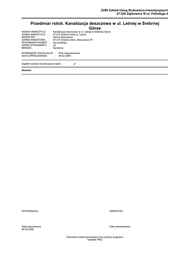Przeceniony Przedmiar robót Knalizacja deszczowe ul. Letnia
