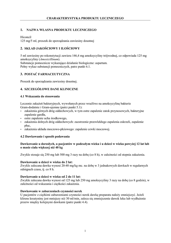 CHARAKTERYSTYKA PRODUKTU LECZNICZEGO 1. NAZWA WŁASNA PRODUKTU LECZNICZEGO Hiconcil 125 mg/5 ml, proszek do sporządzania zawiesiny doustnej 2. SKŁAD JAKOŚCIOWY I ILOŚCIOWY 5 ml zawiesiny po rekonstytucji zawiera 146,4 mg amoksycyliny trójwodnej, co odpowiada 125 mg amoksycyliny (Amoxicillinum). Substancje pomocnicze wykazujące działanie biologiczne: aspartam. Pełny wykaz substancji pomocniczych, patrz punkt 6.1. 3. POSTAĆ FARMACEUTYCZNA Proszek do sporządzania zawiesiny doustnej. 4. SZCZEGÓŁOWE DANE KLINICZNE 4.1 Wskazania do stosowania Leczenie zakaŜeń bakteryjnych, wywołanych przez wraŜliwe na amoksycylinę bakterie Gram-dodatnie i Gram-ujemne (patrz punkt 5.1): zakaŜenia górnych dróg oddechowych, w tym ostre zapalenie zatok przynosowych, bakteryjne zapalenie gardła, ostre zapalenie ucha środkowego, zakaŜenia dolnych dróg oddechowych: zaostrzenie przewlekłego zapalenia oskrzeli, zapalenie płuc, zakaŜenia układu moczowo-płciowego: zapalenie cewki moczowej. 4.2 Dawkowanie i sposób podawania Dawkowanie u dorosłych, u pacjentów w podeszłym wieku i u dzieci w wieku powyŜej 12 lat lub o masie ciała większej niŜ 40 kg Zwykle stosuje się 250 mg lub 500 mg 3 razy na dobę (co 8 h), w zaleŜności od stopnia zakaŜenia. Dawkowanie u dzieci w wieku do 2 lat: Zwykle zalecana dawka wynosi 20-40 mg/kg mc. na dobę w 3 jednakowych dawkach w regularnych odstępach czasu, tj. co 8 h. Dawkowanie u dzieci w wieku od 2 do 11 lat: Zwykle zalecana dawka wynosi od 125 mg lub 250 mg amoksycyliny 3 razy na dobę (co 8 godzin), w zaleŜności od wskazania i cięŜkości zakaŜenia. Dawkowanie w zaburzeniach czynności nerek U pacjentów z cięŜkimi zaburzeniami czynności nerek dawkę preparatu naleŜy zmniejszyć. JeŜeli klirens kreatyniny jest mniejszy niŜ 30 ml/min, zaleca się zmniejszenie dawek leku lub wydłuŜenie przerw między kolejnymi dawkami (patrz punkt 4.4). 1 Dorośli (w tym pacjenci w podeszłym wieku): Klirens kreatyniny [ml/min] > 30 10 – 30 < 10 Dawka Przerwa między dawkami Dostosowanie dawki nie jest konieczne 500 mg 500 mg 12 h 24 h Zaburzenia czynności nerek u dzieci o masie ciała poniŜej 40 kg: Klirens kreatyniny [ml/min] > 30 10 – 30 < 10 Dawka Nie jest konieczne dostosowanie dawki 15 mg/kg mc. 15 mg/kg mc. Przerwa między dawkami 12 h 24 h Dawkowanie w zaburzeniach czynności wątroby: U pacjentów z zaburzeniami czynności wątroby i prawidłową czynnością nerek zmiana dawkowania nie jest konieczna. Czas leczenia zakaŜeń: Zwykle zaleca się kontynuowanie leczenia przez 2 lub 3 dni po ustąpieniu objawów zakaŜenia. W zakaŜeniach wywołanych przez paciorkowce beta-hemolizujące lek naleŜy stosować co najmniej 10 dni. Sposób podawania: Hiconcil w zawiesinie podaje się doustnie za pomocą łyŜeczki miarowej lub strzykawki, dołączonej do opakowania. Zawiesinę naleŜy popić szklanką wody. Pokarm nie ma wpływu na wchłanianie amoksycyliny. Podawanie preparatu dzieciom: zalecone dawki preparatu podaje się dzieciom bez rozcieńczania. Po przyjęciu leku dziecku naleŜy podać do popicia mleko lub herbatę. Jeśli nie moŜna stosować leku doustnie, zwłaszcza w pilnej terapii cięŜkich zakaŜeń, wskazane jest leczenie pozajelitowe. 4.3 Przeciwwskazania • NadwraŜliwość na penicylinę. NaleŜy uwzględnić, Ŝe pacjent nadwraŜliwy na którykolwiek antybiotyk beta-laktamowy, moŜe mieć alergię równieŜ na amoksycylinę (alergia krzyŜowa). NadwraŜliwość na którąkolwiek substancję pomocniczą. 4.4 Specjalne ostrzeŜenia i środki ostroŜności dotyczące stosowania Przed rozpoczęciem leczenia amoksycyliną naleŜy przeprowadzić dokładny wywiad dotyczący występowania w przeszłości reakcji nadwraŜliwości na penicyliny i cefalosporyny. NaleŜy wziąć pod uwagę moŜliwość występowania (10% - 15% przypadków) krzyŜowych reakcji nadwraŜliwości na cefalosporyny. U pacjentów leczonych penicyliną opisywano cięŜkie, sporadycznie zakończone zgonem reakcje nadwraŜliwości (rzekomoanafilaktyczne). Ryzyko wystąpienia tych reakcji jest większe u pacjentów z nadwraŜliwością na antybiotyki beta-laktamowe w wywiadzie. Hiconcil naleŜy stosować ostroŜnie u pacjentów ze skłonnością do alergii i astmą. Po doustnym podaniu amoksycyliny rzadko występuje wstrząs anafilaktyczny i inne cięŜkie reakcje alergiczne. Jednak w przypadku wystąpienia takich reakcji naleŜy wdroŜyć odpowiednie 2 pilne postępowanie lecznicze: doŜylne podanie epinefryny, a następnie środków przeciwhistaminowych, uzupełnienie płynów oraz podanie glikokortykosteroidów. Pacjenci powinni pozostawać pod ścisłą obserwacją, a w razie potrzeby naleŜy zastosować dalsze postępowanie terapeutyczne (sztuczne oddychanie, podanie tlenu). OstroŜnie stosować powinni pacjenci z chorobami przewodu pokarmowego, zwłaszcza z przebytym zapaleniem okręŜnicy. Pacjenci z cięŜkimi zaburzeniami ze strony przewodu pokarmowego, przebiegającymi z biegunką i wymiotami, nie powinni stosować preparatu Hiconcil, ze względu na ryzyko zmniejszonego wchłaniania leku. W takich przypadkach zaleca się podawanie amoksycyliny parenteralnie. U pacjentów z zaburzeniami czynności nerek wydalanie amoksycyliny jest opóźnione. W zaleŜności od stopnia upośledzenia czynności nerek moŜe być konieczne zmniejszenie całkowitej dawki dobowej (patrz punkt 4.2). Szczególne środki ostroŜności naleŜy zachować u dzieci, wcześniaków oraz w okresie noworodkowym: naleŜy kontrolować czynność nerek, wątroby oraz parametry hematologiczne. Długotrwałe stosowanie amoksycyliny rzadko moŜe powodować nadmierny wzrost opornych bakterii lub droŜdŜy. Z tego względu pacjentów naleŜy obserwować pod kątem wystąpienia nadkaŜenia. DuŜe stęŜenie amoksycyliny w moczu moŜe powodować jej wytrącanie w cewnikach moczowych. Z tego względu co pewien czas naleŜy obejrzeć cewniki i ocenić ich stan. W przypadku stosowania duŜych dawek a