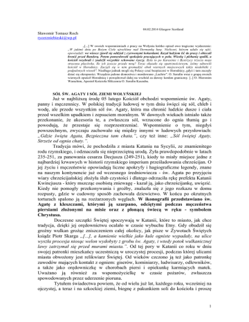 04.02.2014 Glasgow Scotland Sławomir Tomasz Roch [email protected] „[...] W swoich wspomnieniach z pracy na Wołyniu krótko opisał owo tragiczne wydarzenie: „W jakimś dniu po Bożym Ciele ujrzeliśmy nad Dermanką łunę. Nieliczni, którym udało się ujść, opowiadali: we wiosce zjawił się oddział z czerwonymi kokardami. Kazał ludziom iść do pracy i obiecali bronić przed Banderą. Potem pomordowali spokojnie pracujących w polu. Wioskę i plebanię spalili, a kościół rozebrali i znaleźli wszystkie schowane rzeczy. Była to po Karasinie i Bystrzycy trzecia moja stracona placówka. Ile ich jeszcze przede mną? Teraz okazało się opatrznościowym, żeśmy odnowili kościół w Horodnicy. Zaczęli się w nim gromadzić obok wiernych miejscowych także niedobitki z podpalonych wiosek". Niedługo jednak mogli się Polacy czuć bezpieczni w Horodnicy, gdyż i tam zaczęły dziać się okropności. Wszędzie palono domostwa i mordowano „Lachiw". O. Serafin wraz z grupą swoich wiernych opuścił Horodnicę i powędrował dalej na wschód za dawny kordon graniczny. [..] O. Hieronim Warachim, Apostoł Kościoła Milczenia O. Serafin Kaszuba. SÓL ŚW. AGATY I SÓL ZIEMI WOŁYŃSKIEJ Już w najbliższą środę 05 lutego Kościół obchodzi wspomnienie św. Agaty, panny i męczennicy. W polskiej tradycji ludowej w tym dniu święci się sól, chleb i wodę, ale przede wszystkim sól św. Agaty, która ma chronić ludzkie dusze i ciała przed wszelkim upadkiem i zepsuciem moralnym. W dawnych wiekach istniało także przekonanie, że akcesoria te, a zwłaszcza sól, wrzucone do ognia tłumią go i powodują, że przestaje się rozprzestrzeniać. Wspomnienie o tym, niegdyś powszechnym, zwyczaju zachowało się między innymi w ludowych przysłowiach: „Gdzie święta Agata, Bezpieczna tam chata.”, czy też inne: „Sól świętej Agaty, Strzeże od ognia chaty.”. Tradycja mówi, że pochodziła z miasta Katania na Sycylii, ze znamienitego rodu rzymskiego, i odznaczała się nieprzeciętną urodą. Żyła prawdopodobnie w latach 235-251, za panowania cesarza Decjusza (249-251), kiedy to miały miejsce jedne z najbardziej krwawych w historii rzymskiego imperium prześladowania chrześcijan. O jej życiu i męczeństwie opowiadają liczne apokryfy i hagiograficzne legendy, znane na naszym kontynencie już od wczesnego średniowiecza - św. Agata po przyjęciu wiary chrześcijańskiej złożyła ślub czystości i dlatego odrzuciła rękę prefekta Katanii Kwincjusza - który mszcząc osobistą zniewagę - kazał ją, jako chrześcijankę, uwięzić. Kiedy nie pomogły przekonywania i groźby, znalazła się z jego rozkazu w domu rozpusty, gdzie w cudowny sposób zachowała dziewictwo. W końcu po okrutnych torturach spalono ją na rozżarzonych węglach. W ikonografii przedstawiano św. Agatę z kleszczami, którymi ją szarpano, odciętymi podczas męczeństwa piersiami złożonymi na misie oraz z płonącą świecą w ręku - symbolem Chrystusa. Doczesne szczątki Świętej spoczywają w Katanii, które to miasto, jak chce tradycja, dzięki jej orędownictwu ocalało w czasie wybuchu Etny. Gdy obudził się groźny wulkan grożąc zniszczeniem całej okolicy, jak pisze w Żywotach Świętych ksiądz Piotr Skarga „[...], a kamienie wielkie jako kule ogniste wypadały, na ulice wyszła procesja niosąc welon wydobyty z grobu św. Agaty, i wtedy potok wulkanicznej lawy zatrzymał się przed murami miasta.”. Od tej pory w Katanii co roku w dniu swojej patronki mieszkańcy uczestniczą w uroczystej procesji, podczas której ulicami miasta obwożony jest relikwiarz Świętej. Od wieków czczono ją też jako patronkę zawodów mających kontakt z ogniem: giserów, kominiarzy, ludwisarzy, odlewników, a także jako orędowniczkę w chorobach piersi i opiekunkę karmiących matek. Uważano ją również za wspomożycielkę w czasie pożarów, zwłaszcza spowodowanych przez uderzenie pioruna. Tytułem świadectwa powiem, że od wielu już lat, każdego roku, wcześniej na ojczystej, a teraz i na szkockiej ziemi, biegnę z pakunkiem soli do kościoła i proszę 1 uprzejmię kapłana, właśnie o błogosławieństwo soli św. Agaty. Czynię to zwykle już po mszy świętej, a mam tej soli zwykle tyle, że wystarcza mi spokojnie na cały rok, a jeszcze hojnie mogę się podzielić z innymi. Tu w Glasgow obrzęd ten jest zwyczajnie nieznany i zwykle budzi zdziwienie, ale to wcale mi nie przeszkadza, gdy w kilka minut później wracam do domu obładowany solą św. Agaty. Jestem wtedy taki szczęśliwy, a przy tym dumny z siebie, jak królewski paw. APOSTOŁ KOŚCIOŁA MILCZENIA Kiedy w czerwcu 1941 roku rozpoczęła się wojna Niemiec ze Związkiem Radzieckim, a wojska III Rzeszy zajęły Wołyń, dla polskiej ludności na Wołyniu nastały szczególnie ciężkie czasy. Konflikt polsko-ukraiński wybuchł ze wzmożoną siłą. Nacjonalizm doprowadził do barbarzyńskich mordów i palenia wsi. Właśnie Karasin, w którym przed kilkoma miesiącami osiadł o. Serafin Kaszuba, w sierpniu 1941 roku padł ofiarą niewyobrażalnego okrucieństwa. Od Karasina rozpoczęły się krwawe „czerwone noce" nad Wołyniem. Z różnym natężeniem, aż do wiosny 1944 roku, płonęły na Wołyniu polskie chaty, przelewała się niewinna krew. Z powierzchni ziemi znikło wiele polskich wsi, wyginęły zupełnie niektóre rodziny. Nad żyjącymi zawisła groźba barbarzyństwa, rozpoczęła się bieda. Tę ciężką dolę społeczeństwa dzielił młody kapłan-zakonnik o. Serafin. Po spaleniu Karasina, wraz z ocalałą resztką parafian, schronił się we wsi Bystrzyca, gdzie urządził kaplicę. W parę miesięcy potem, gdy Bystrzyca została spalona, powędrował dalej. Osiadł w pozbawionej kapłana parafii Dermanka. Czysto polska, dobrze zorganizowana wieś, cieszyła się chwilowym spokojem. O. Serafin rozwinął ożywioną działalność duszpasterską i katechetyczną. Szybko więc zyskał 