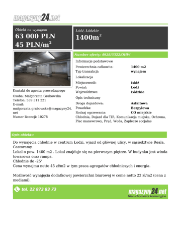 Obiekt na wynajem 63 000 PLN 2 45 PLN/m Łódź, Łódzkie 1400m2 Number oferty: 4928/3322/OHW Informacje podstawowe Powierzchnia całkowita: Typ transakcji: 1400 m2 wynajem Lokalizacja Kontakt do agenta prowadzącego Osoba: Małgorzata Grabowska Telefon: 539 311 221 E-mail: malgorzata.grabowska@magazyny24. net Numer licencji: 10278 Miejscowość: Powiat: Województwo: Łódź Łódź Łódzkie Opis techniczny Droga dojazdowa: Asfaltowa Posadzka: Bezpyłowa Rodzaj ogrzewania: CO miejskie Chlodnia, Dojazd dla TIR, Komunikacja miejska, Ochrona, Plac manewrowy, Prąd, Woda, Zaplecze socjalne Opis obiektu Do wynajęcia chłodnie w centrum Łodzi, wjazd od głównej ulicy, w sąsiedztwie Reala, Castoramy. Lokal o pow. 1400 m2 . Lokal znajduje się na pierwszym piętrze. W budynku jest winda towarowa oraz rampa. Chłodnie do -25' Cena wynajmu netto 45 zł/m2 w tym praca agregatów chłodniczych i energia. Możliwość wynajęcia dodatkowej powierzchni biurowej w cenie netto 22 zł/m2 (cena z mediami).