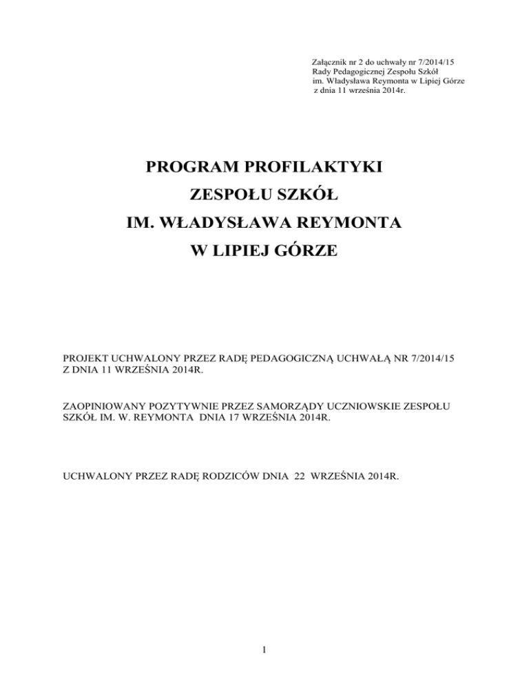 Załącznik nr 2 do uchwały nr 7/2014/15 Rady Pedagogicznej Zespołu Szkół im. Władysława Reymonta w Lipiej Górze z dnia 11 września 2014r. PROGRAM PROFILAKTYKI ZESPOŁU SZKÓŁ IM. WŁADYSŁAWA REYMONTA W LIPIEJ GÓRZE PROJEKT UCHWALONY PRZEZ RADĘ PEDAGOGICZNĄ UCHWAŁĄ NR 7/2014/15 Z DNIA 11 WRZEŚNIA 2014R. ZAOPINIOWANY POZYTYWNIE PRZEZ SAMORZĄDY UCZNIOWSKIE ZESPOŁU SZKÓŁ IM. W. REYMONTA DNIA 17 WRZEŚNIA 2014R. UCHWALONY PRZEZ RADĘ RODZICÓW DNIA 22 WRZEŚNIA 2014R. 1 PROGRAM PROFILAKTYKI ZESPOŁU SZKÓŁ IM.W.REYMONTA W LIPIEJ GÓRZE MOTTO: NAJLEPSZĄ PROFILAKTYKĄ JEST DOBRE WYCHOWANIE Cele szkolnej (pierwszorzędowej) profilaktyki: - ochranianie uczniów przed zagrożeniami i wszelkimi zakłóceniami rozwoju, - reagowanie w sytuacjach rozpoznania pierwszych prób zachowań ryzykownych, - promowanie zdrowia, - uczenie podejmowania roztropnych decyzji, - rozwijanie umiejętności panowania nad własnymi emocjami, - nauka krytycznego stosunku do mediów, - kształcenie umiejętności interpersonalnych, - budowanie prawidłowych dojrzałych więzi, - uczenie poczucia odpowiedzialności za słowo, - kształcenie postaw tolerancji, szacunku i otwartości międzykulturowej, - nawiązywanie współpracy z instytucjami wspierającymi szkołę w profilaktyce. STRUKTURA SZKOLNEGO PROGRAMU PROFILAKTYKI Poziom decyzyjny - MEN - KURATOR OŚWIATY - DYREKTOR SZKOŁY Poziom realizacyjny - ZESPÓŁ DS. PROFILAKTYKI W SZKOLE - RADA PEDAGOGICZNA - RODZICE - WYCHOWAWCY KLAS I NAUCZYCIELE - UCZNIOWIE 2 PROGNOZA – realia tworzenia programu profilaktyki Zespół Szkół im. Władysława Reymonta w Lipiej Górze jest małą szkołą liczącą 176 uczniów, co w połączeniu z przyjaznym i bezpiecznym otoczeniem sprawia, iż stwarzamy naszym uczniom duże poczucie bezpieczeństwa. Jednak nie jesteśmy odizolowani od zagrożeń. Wszyscy nasi uczniowie nasi mieszkają na wsi a zatem mają utrudniony dostęp do korzystania z oferty różnych ośrodków kulturalnych. Większość rodziców utrzymuje swoje rodziny z pracy we własnym gospodarstwie rolnym, dlatego część dzieci czas wolny od zajęć szkolnych przeznacza na pomoc rodzicom w gospodarstwie. Są też rodzice pracujący poza miejscem zamieszkania i często nie ma ich w domu, co wpływa negatywnie na dzieci, które spędzają ten czas albo na bieganiu z rówieśnikami, albo przed telewizorem. Brak opieki wpływa negatywnie na ich zachowania a także osiągane wyniki edukacyjne. Wykształcenie rodziców w większości jest zawodowe, co może być przyczyną braku aspiracji naukowych dzieci (ale w niektórych wypadkach może być również motywujące). Obserwuje się małą aktywność społeczną wśród mieszkańców. Sytuacja materialna wielu rodzin jest bardzo ciężka. Brak pracy, brak perspektyw na życie wywołuje negatywne postawy ( alkoholizm i związane z nim przejawy patologii). Zauważa się również częste przejawy niewydolności wychowawczej rodziców, a przecież to rodzice są pierwszym wzorem wychowawczym dla dziecka. PROPOZYCJE ROZWIĄZAŃ Praca indywidualna Bardzo ważną rolę odgrywa poziom indywidualnego kontaktu z uczniem. Ważną funkcję spełnia zarówno wychowawca jak i pedagog oraz każdy nauczyciel. Z nimi uczeń może przeanalizować swoje problemy, decyzje i ważne życiowe wydarzenia. Praca w grupie rówieśniczej Na terenie szkoły działa Samorząd Uczniowski. Grupa ta usprawnia komunikację uczniów, uczy asertywności, rozwiązywania konfliktów. Działania samorządowe przygotowują młodzież do uczestnictwa w życiu społecznym. 3 Praca w grupie zajęciowej Zajęcia tematyczne (komputerowe, teatralne, literackie, matematyczne, sportowe, muzyczne,…) prowadzone przez profesjonalistę, oprócz twórczości w danej dziedzinie służą korygowaniu relacji grupowych – uczą współpracy, wspólnego przeżywania sukcesu, organizacji, dotrzymywania terminu. Po czasie uczniowie dostrzegają efekty swoich działań co motywuje do dalszej pracy. Wychowanie do życia w rodzinie Istotnym elementem w pracy wychowawczej jest realizowanie przez szkołę zajęć: Wychowanie do życia w rodzinie. Wspomagają one uczniów i wyposażają w niezbędne umiejętności interpersonalne, pomagają w budowaniu obrazu własnej osoby, w pozytywnym wchodzeniu w relacje z innymi, rozwiązywaniu konfliktów. Kontakty z rodzicami Rodziny dysfunkcyjne są najczęściej występującym czynnikiem ryzyka. Najczęstszym powodem dysfunkcji jest problem alkoholowy. Pierwszym krokiem w nawiązaniu współpracy jest nawiązanie bezpiecznego kontaktu. Formą pracy są najczęściej spotkania indywidualne dające wsparcie w rozwiązywaniu osobistych problemów. Gdy kontakt indywidualny nie wystarczy kierujemy do odpowiednich placówek specjalistycznych, pomocowych. Starać się należy by rodzice czynnie uczestniczyli w życiu szkoły, organizować spotkania podnoszące wiedzę przydatną do wspierania dziecka w rozwoju. Treści do realizacji dla zespołu ds. profilaktyki: Diagnoza problemów wychowawczych. Monitoring i koordynowanie przebiegu realizacji programu. Opracowanie czynników chroniących i ryzyka w oparciu o badania. Treści do realizacji dla Rady Pedagogicznej: Sprawozdanie i analiza wyników badań ankietowych. Zatwierdzenie programu profilaktyki, programów profilaktycznych. Ewaluacja. Treści do realizacji dla rodziców: Rozpoznawanie czynników ryzyka. Świadomość i refleksja na temat stosowanych metod wychowawczych. Jednorodne środowisko wychowawcze nauczycieli i rodziców. Czynniki budujące relacje dorosły – dziecko. Własny rozwój i samokształcenie. Rozpoznawanie, 4 wyrażanie, akceptowanie uczuć a także radzenie sobie z trudnymi uczuciami. Efektywna współpraca z dzieckiem. Modyfikacja niepożądanych zachowań bez stosowania form przemocy. Aktywne wspierające słuchanie. Rozwój pozytywnego, realistycznego obrazu siebie, swoich możliwości i zdolności u dziecka. Dom rodzinny szkołą zachowań. Po