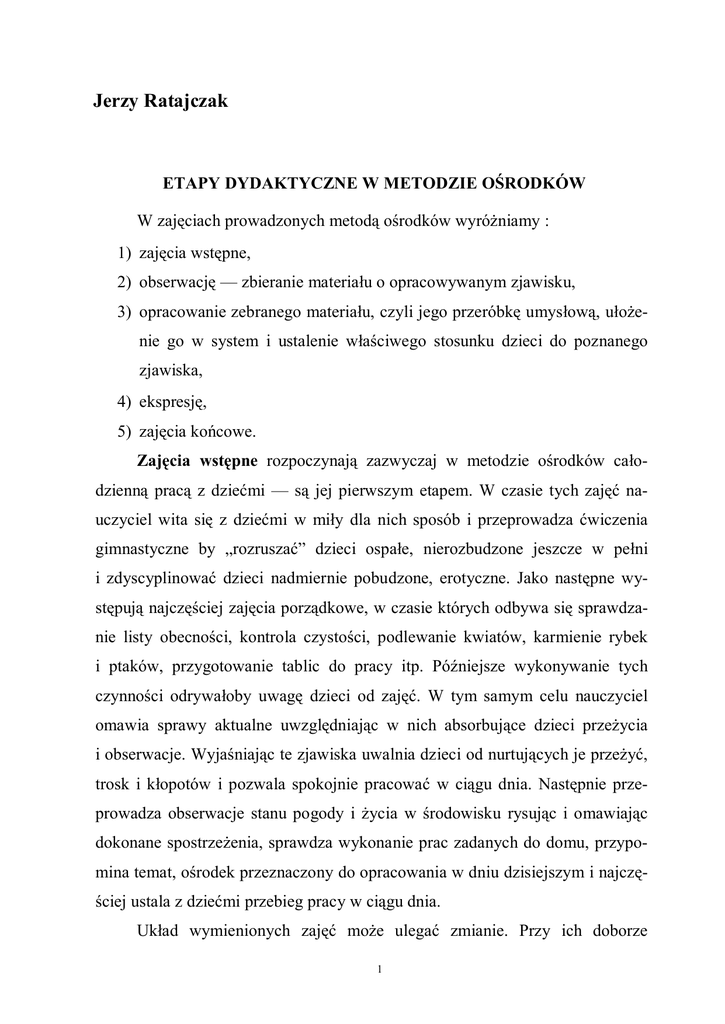 Jerzy Ratajczak ETAPY DYDAKTYCZNE W METODZIE OŚRODKÓW W zajęciach prowadzonych metodą ośrodków wyróżniamy : 1) zajęcia wstępne, 2) obserwację — zbieranie materiału o opracowywanym zjawisku, 3) opracowanie zebranego materiału, czyli jego przeróbkę umysłową, ułożenie go w system i ustalenie właściwego stosunku dzieci do poznanego zjawiska, 4) ekspresję, 5) zajęcia końcowe. Zajęcia wstępne rozpoczynają zazwyczaj w metodzie ośrodków całodzienną pracą z dziećmi — są jej pierwszym etapem. W czasie tych zajęć nauczyciel wita się z dziećmi w miły dla nich sposób i przeprowadza ćwiczenia gimnastyczne by „rozruszać” dzieci ospałe, nierozbudzone jeszcze w pełni i zdyscyplinować dzieci nadmiernie pobudzone, erotyczne. Jako następne występują najczęściej zajęcia porządkowe, w czasie których odbywa się sprawdzanie listy obecności, kontrola czystości, podlewanie kwiatów, karmienie rybek i ptaków, przygotowanie tablic do pracy itp. Późniejsze wykonywanie tych czynności odrywałoby uwagę dzieci od zajęć. W tym samym celu nauczyciel omawia sprawy aktualne uwzględniając w nich absorbujące dzieci przeżycia i obserwacje. Wyjaśniając te zjawiska uwalnia dzieci od nurtujących je przeżyć, trosk i kłopotów i pozwala spokojnie pracować w ciągu dnia. Następnie przeprowadza obserwacje stanu pogody i życia w środowisku rysując i omawiając dokonane spostrzeżenia, sprawdza wykonanie prac zadanych do domu, przypomina temat, ośrodek przeznaczony do opracowania w dniu dzisiejszym i najczęściej ustala z dziećmi przebieg pracy w ciągu dnia. Układ wymienionych zajęć może ulegać zmianie. Przy ich doborze 1 i zestawieniu powinien nauczyciel kierować się stopniem użyteczności dla rozwoju dzieci i powiązaniem z ośrodkami pracy całodziennej. Czas trwania zajęć wstępnych w kl. I wynosi przeciętnie około 50 minut na początku roku szkolnego i około 30 w końcu roku. W latach następnych skraca się jeszcze bardziej. Obserwacja jest następnym etapem pracy całodziennej. Obserwację można podzielić na bezpośrednią i pośrednią (obserwacja bezpośrednia prowadzona jest przy pomocy zmysłów; pośrednia — to korzystanie z wiedzy poprzednio zdobytej przez innych, zawartej w książkach lub dokumentach, dotyczącej zjawisk niedostępnych w chwili obecnej naszym zmysłom) oraz okolicznościową czyli przypadkową i. właściwą, będącą zasadniczym etapem pracy w metodzie ośrodków. W toku interesującej nas najbardziej obserwacji właściwej występuje zazwyczaj najpierw obserwacja dowolna, kiedy to dzieci po zetknięciu się z nowym dla nich przedmiotem oglądają go, dotykają, poruszają, badają, samodzielnie zbierają wiedzę o nim, i obserwacja kierowana, w czasie której nauczyciel naprowadza uwagę dzieci na pominięte przez nie szczegóły i cechy uzupełniając w ten sposób wiadomości zebrane w toku obserwacji dowolnej. W czasie obserwacji podstawowe znaczenie mają takie procesy psychiczne jak odbieranie wrażeń, dokonywanie spostrzeżeń, uzupełnianie ich i korygowanie na podstawie ponownej obserwacji i zapamiętywanie. W ten sposób w czasie obserwacji, czyli osobistych poznawczo-emocjonalnych doświadczeń, gromadzą dzieci rzetelną wiedzę, konkretne spostrzeżenia, materiał, z którego na następnym etapie zbudują logiczny system wiadomości o obserwowanym zjawisku. Obserwacja powinna odbywać się w warunkach najbardziej charakterystycznych dla danego przedmiotu obserwacji; np. królika najlepiej jest obserwować w klatce, owoce w sadzie, kopanie ziemniaków w polu, budowę domu na samej budowie itd. Powinna ona poza tym uczynniać postawę ucznia poprzez jego osobisty udział w obserwowanym zjawisku np.: poprzez karmienie królików i uprzątanie klatek, zrywanie, kupowanie i przynoszenie owoców, kopanie 2 lub zbieranie i zsypywanie ziemniaków, przygotowywanie zaprawy murarskiej noszenie i podawanie cegieł, a nawet murowanie razem z murarzem. Taka obserwacja daje nie tylko bardziej dokładne i wszechstronne wiadomości oraz pozwala na zdobycie prostych umiejętności, lecz przynosi dzieciom dużo zadowolenia i radości. Koncentracja uwagi, dokonywanie spostrzeżeń i zapamiętywanie ich jest wtedy łatwiejsze, gdyż przebiega w atmosferze dodatnich, przyjemnych przeżyć. Opracowanie — przeróbka umysłowa zebranego materiału to następny etap pracy w metodzie ośrodków. Następuje teraz weryfikacja i uzupełnianie zebranych w czasie obserwacji wiadomości, uporządkowanie ich i powiązanie z wiadomościami poprzednio zdobytymi w logiczną całość oraz ustalenie właściwego stosunku dzieci do omawianego zjawiska i sposobu ich postępowania. W tej części zajęć lekcyjnych dzieci porównują zebrane spostrzeżenia z wiadomościami poprzednio zdobytymi lub dostarczonymi im dodatkowo, wskazują na zachodzące między nimi podobieństwa i różnice oraz wzajemną ich zależność, wysuwają cechy istotne na plan pierwszy, stosując analizę i syntezę wydają sądy i wyciągają wnioski — uczą się abstrahowania i klasyfikowania. W ten sposób dzięki określonej pracy umysłowej z chaotycznych i często fragmentarycznych spostrzeżeń powstaje w umysłach dzieci, dostępny dla ich rozwoju, zgodny z rzeczywistością system wiadomości o obserwowanym zjawisku. Omawiany etap pracy jest typową formą przeróbki materiału dostarczonego w drodze spostrzeżeń i obserwacji. Obserwacja to przede wszystkim etap bezpośredniego poznawania, ocena, układanie i wiązanie w logiczny system wiadomości zdobytych w czasie obserwacji — opracowanie materiału to najbardziej abstrakcyjna, myślowa praca, po której nastąpi ekspresja, czyli stosowanie zdobytych wiadomości i umiejętności w praktyce. Etap nazwany tutaj opracowaniem zebranego materiału ma między innymi dlatego doniosłe znaczenie w pracy z dziećmi upośledzonymi umysłowo, że zapobiega łatwo występującym u nich błę