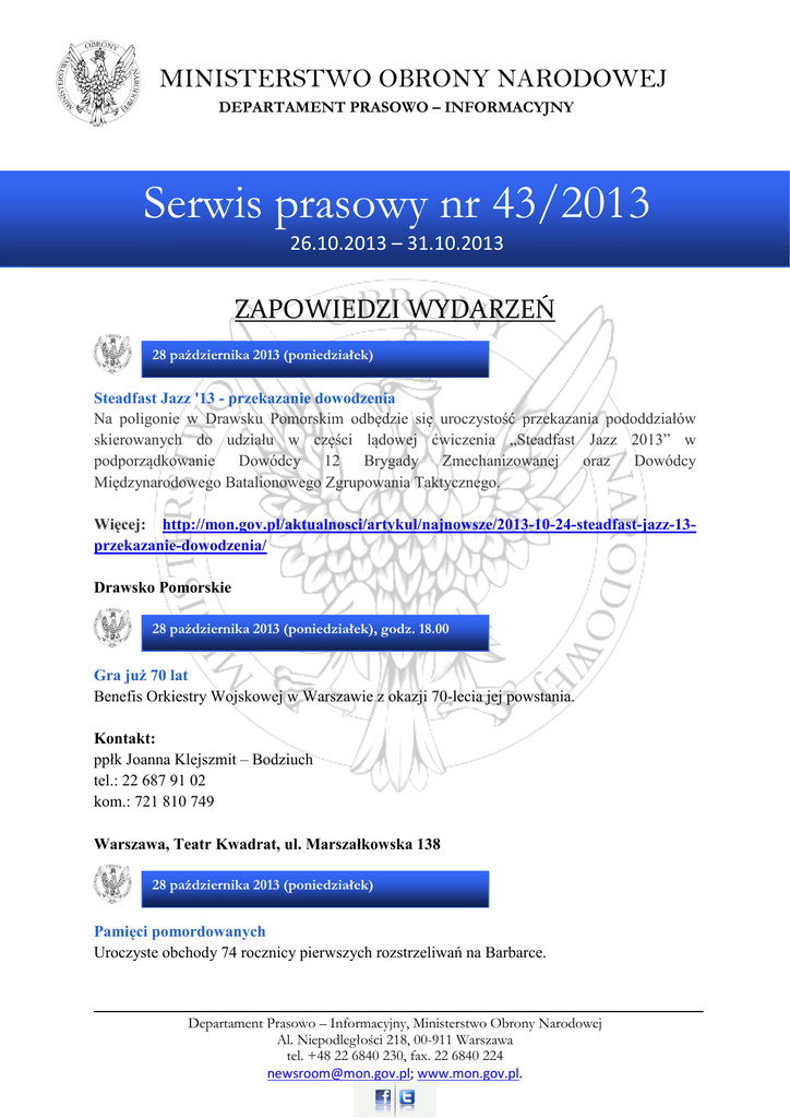 MINISTERSTWO OBRONY NARODOWEJ DEPARTAMENT PRASOWO – INFORMACYJNY Serwis prasowyWYDARZEŃ nr 43/2013 ZAPOWIEDZI 2011 26.10.2013 9– 31.10.2013 ZAPOWIEDZI WYDARZEŃ 28 października 2013 (poniedziałek) Steadfast Jazz '13 - przekazanie dowodzenia Na poligonie w Drawsku Pomorskim odbędzie się uroczystość przekazania pododdziałów skierowanych do udziału w części lądowej ćwiczenia „Steadfast Jazz 2013” w podporządkowanie Dowódcy 12 Brygady Zmechanizowanej oraz Dowódcy Międzynarodowego Batalionowego Zgrupowania Taktycznego. Więcej: http://mon.gov.pl/aktualnosci/artykul/najnowsze/2013-10-24-steadfast-jazz-13przekazanie-dowodzenia/ Drawsko Pomorskie 28 października 2013 (poniedziałek), godz. 18.00 Gra już 70 lat Benefis Orkiestry Wojskowej w Warszawie z okazji 70-lecia jej powstania. Kontakt: ppłk Joanna Klejszmit – Bodziuch tel.: 22 687 91 02 kom.: 721 810 749 Warszawa, Teatr Kwadrat, ul. Marszałkowska 138 28 października 2013 (poniedziałek) Pamięci pomordowanych Uroczyste obchody 74 rocznicy pierwszych rozstrzeliwań na Barbarce. Departament Prasowo – Informacyjny, Ministerstwo Obrony Narodowej Al. Niepodległości 218, 00-911 Warszawa tel. +48 22 6840 230, fax. 22 6840 224 [email protected]; www.mon.gov.pl. Kontakt: kpt. Tomasz Kisiel tel.: 727 012 336 tel/fax: 56 653 22 07 e-mail: [email protected] Toruń, Barbarka KRONIKA 19 października 2013 (sobota) Nowa wystawa w Muzeum Wojska Polskiego Prezydent RP Bronisław Komorowski oraz minister ON Tomasz Siemoniak wzięli udział w uroczystym otwarciu wystawy w Muzeum WP, zatytułowanej „Usque ad finem – Książę Józef Poniatowski w Bitwie Narodów pod Lipskiem". http://mon.gov.pl/aktualnosci/artykul/najnowsze/2013-10-16-prezydent-rp-i-minister-obronyna-otwarciu-wystawy/ 19 października 2013 (sobota) Podsekretarz ds. infrastruktury z wizytą u marynarzy Beata Oczkowicz, podsekretarz stanu ds. infrastruktury, złożyła kolejną wizytę roboczą w Marynarce Wojennej. http://mon.gov.pl/aktualnosci/artykul/najnowsze/2013-10-19-podsekretarz-stanu-dsinfrastruktury-z-robocza-wizyta-w-marynarce-wojennej/ 20 października 2013 (niedziela) W hołdzie uczestnikom powstania styczniowego „Serdecznie pozdrawiam uczestników Zlotu i dziękuję za wszystko, co Polskie Towarzystwo Turystyczno-Krajoznawcze czyni dla upowszechniania historii i przyrody naszego kraju” – napisał minister Tomasz Siemoniak do młodzieży, która wzięła udział w rajdzie „Palmiry 2013”. http://mon.gov.pl/aktualnosci/artykul/najnowsze/2013-10-20-list-ministra-tomaszasiemoniaka-do-uczestnikow-53-centralnego-zlotu-mlodziezy-pttk-palmiry-2013/ 21 października 2013 (poniedziałek) MON zawarło porozumienie z CBA Departament Prasowo – Informacyjny, Ministerstwo Obrony Narodowej Al. Niepodległości 218, 00-911 Warszawa tel. +48 22 6840 230, fax. 22 6840 224 [email protected]; www.mon.gov.pl. Minister obrony narodowej Tomasz Siemoniak i Szef Centralnego Biura Antykorupcyjnego Paweł Wojtunik podpisali dziś porozumienie o współpracy pomiędzy MON i CBA. http://mon.gov.pl/aktualnosci/artykul/najnowsze/2013-10-21-porozumienie-z-cba-podpisane/ 21 października 2013 (poniedziałek) Akt mianowania płk. Pileckiego przekazany rodzinie „Chcielibyśmy, aby postać pułkownika Witolda Pileckiego była postacią, która wpływa na formułowanie charakterów żołnierzy Wojska Polskiego. Żołnierzy, którzy potrzebują czerpać wzorce z ludzi, stawiających interes Rzeczypospolitej Polskiej zawsze na pierwszym miejscu” – powiedział minister Tomasz Siemoniak podczas uroczystości przekazania rodzinie aktu mianowania Witolda Pileckiego na wyższy stopień wojskowy. http://mon.gov.pl/aktualnosci/artykul/najnowsze/2013-10-21-akt-mianowania-rotmistrzapileckiego-przekazany-najblizszym/ 22 października 2013 (wtorek) Zginął ratując życie żołnierza Kapitan Grzegorz Nicke własnym ciałem zasłonił młodszego kolegę przed wybuchem granatu. Sam jednak został poważnie ranny, zmarł kilka dni temu. – Dla Grześka wojsko było czymś więcej niż pracą – mówi kpt. Piotr Figas, który przez 20 lat przyjaźnił się z oficerem z toruńskiej jednostki. http://mon.gov.pl/aktualnosci/artykul/najnowsze/2013-10-22-zginal-ratujac-zycie-zolnierza/ 22 października 2013 (wtorek) Polsko-koreańska umowa o współpracy obronnej Przebywający w składzie delegacji prezydenta RP w Korei sekretarz stanu w MON Czesław Mroczek oraz minister obrony narodowej Republiki Korei Kwan Jin Kim podpisali we wtorek (22 bm.) w Seulu Umowę między Rzeczpospolitą Polską a Republiką Korei o współpracy w dziedzinie obronności. http://mon.gov.pl/aktualnosci/artykul/najnowsze/2013-10-22-polsko-koreanska-umowa-owspolpracy-obronnej/ 22 października 2013 (wtorek) Awans dla bohatera Departament Prasowo – Informacyjny, Ministerstwo Obrony Narodowej Al. Niepodległości 218, 00-911 Warszawa tel. +48 22 6840 230, fax. 22 6840 224 [email protected]; www.mon.gov.pl. W uznaniu bohaterskiego czynu kapitana Grzegorza Nicke, który własnym ciałem zasłonił kolegę przed wybuchem granatu, minister obrony narodowej Tomasz Siemoniak awansował pośmiertnie kapitana na stopień pułkownika. http://mon.gov.pl/aktualnosci/artykul/najnowsze/2013-10-22-awans-dla-bohatera/ 22 października 2013 (wtorek) Wojskowa służba kobiet - to już 25 lat! „25 lat służby kobiet w Wojsku Polskim to więcej niż pełnoletność, to okres kiedy tzw. choroby wieku dziecięcego są już za nami. To zmierzanie ku dojrzałości – świadome dążenie do wytyczonego celu” – powiedziała podczas konferencji poświęconej służbie wojskowej kobiet kmdr Bożena Szubińska, przewodnicząca Rady ds. Kobiet w SZ RP. http://mon.gov.pl/aktualnosci/artykul/najnowsze/2013-10-21-o-wojskowej-sluzbie-kobietkonferencja-z-udzialem-ministra-siemoniaka/ 22 października 2013 (wtorek) Wniosek o przedłużenie użycia PKW na Bałkanach Rada Ministrów skierowała wniosek do prezydenta Rzeczypospolitej 