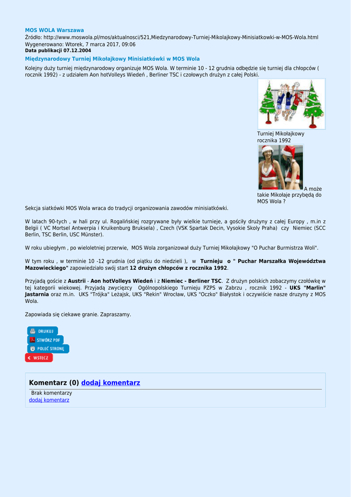 MOS WOLA Warszawa Źródło: http://www.moswola.pl/mos/aktualnosci/521,Miedzynarodowy-Turniej-Mikolajkowy-Minisiatkowki-w-MOS-Wola.html Wygenerowano: Wtorek, 7 marca 2017, 09:06 Data publikacji 07.12.2004 Międzynarodowy Turniej Mikołajkowy Minisiatkówki w MOS Wola Kolejny duży turniej międzynarodowy organizuje MOS Wola. W terminie 10 - 12 grudnia odbędzie się turniej dla chłopców ( rocznik 1992) - z udziałem Aon hotVolleys Wiedeń , Berliner TSC i czołowych drużyn z całej Polski. Turniej Mikołajkowy rocznika 1992 A może takie Mikołaje przybędą do MOS Wola ? Sekcja siatkówki MOS Wola wraca do tradycji organizowania zawodów minisiatkówki. W latach 90-tych , w hali przy ul. Rogalińskiej rozgrywane były wielkie turnieje, a gościły drużyny z całej Europy , m.in z Belgii ( VC Mortsel Antwerpia i Kruikenburg Bruksela) , Czech (VSK Spartak Decin, Vysokie Skoly Praha) czy Niemiec (SCC Berlin, TSC Berlin, USC Münster). W roku ubiegłym , po wieloletniej przerwie, MOS Wola zorganizował duży Turniej Mikołajkowy "O Puchar Burmistrza Woli". W tym roku , w terminie 10 -12 grudnia (od piątku do niedzieli ), w Turnieju o " Puchar Marszałka Województwa Mazowieckiego" zapowiedziało swój start 12 drużyn chłopców z rocznika 1992. Przyjadą goście z Austrii - Aon hotVolleys Wiedeń i z Niemiec - Berliner TSC. Z drużyn polskich zobaczymy czołówkę w tej kategorii wiekowej. Przyjadą zwycięzcy Ogólnopolskiego Turnieju PZPS w Zabrzu , rocznik 1992 - UKS "Marlin" Jastarnia oraz m.in. UKS "Trójka" Leżajsk, UKS "Rekin" Wrocław, UKS "Oczko" Białystok i oczywiście nasze druzyny z MOS Wola. Zapowiada się ciekawe granie. Zapraszamy. Komentarz (0) dodaj komentarz Brak komentarzy dodaj komentarz