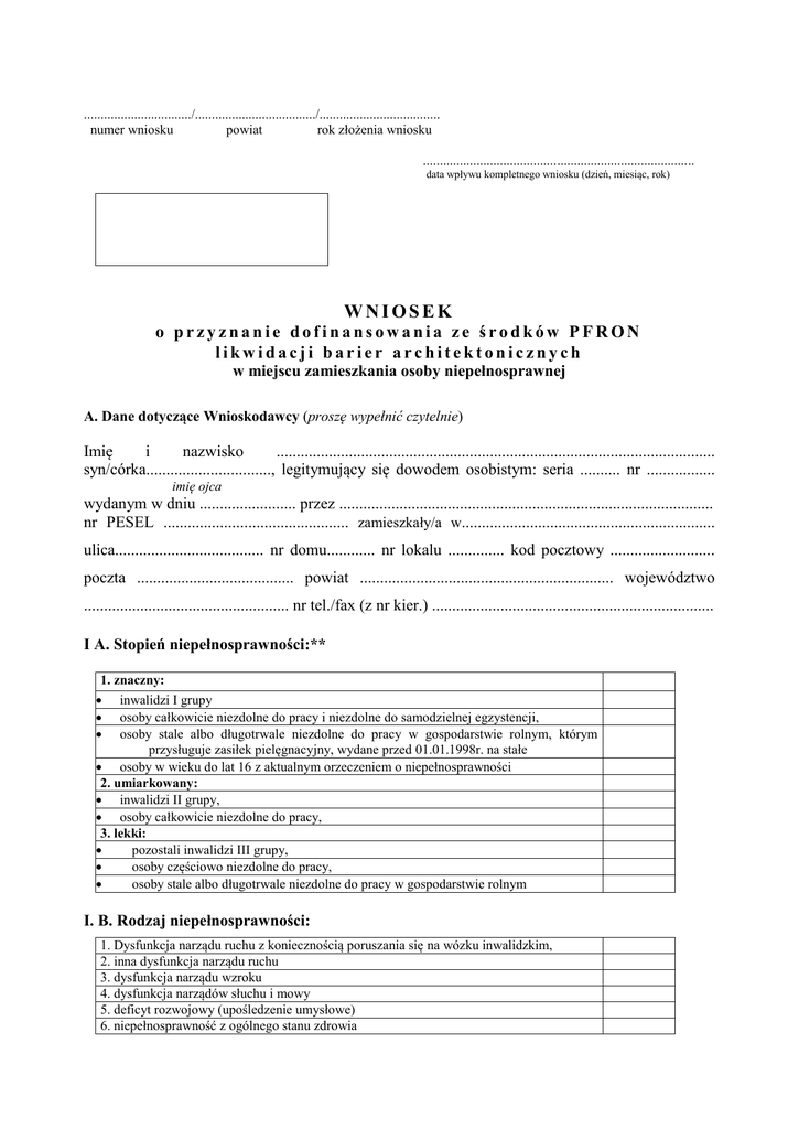 ................................/..................................../.................................... numer wniosku powiat rok złożenia wniosku ................................................................................. data wpływu kompletnego wniosku (dzień, miesiąc, rok) WNIOSEK o przyznanie dofinansowania ze środków PFRON likwidacji barier architektonicznych w miejscu zamieszkania osoby niepełnosprawnej A. Dane dotyczące Wnioskodawcy (proszę wypełnić czytelnie) Imię i nazwisko ............................................................................................................. syn/córka..............................., legitymujący się dowodem osobistym: seria .......... nr ................. imię ojca wydanym w dniu ........................ przez ............................................................................................. nr PESEL .............................................. zamieszkały/a w............................................................... ulica..................................... nr domu............ nr lokalu .............. kod pocztowy .......................... poczta ....................................... powiat ............................................................... województwo ................................................... nr tel./fax (z nr kier.) ...................................................................... I A. Stopień niepełnosprawności:** 1. znaczny: inwalidzi I grupy osoby całkowicie niezdolne do pracy i niezdolne do samodzielnej egzystencji, osoby stale albo długotrwale niezdolne do pracy w gospodarstwie rolnym, którym przysługuje zasiłek pielęgnacyjny, wydane przed 01.01.1998r. na stałe osoby w wieku do lat 16 z aktualnym orzeczeniem o niepełnosprawności 2. umiarkowany: inwalidzi II grupy, osoby całkowicie niezdolne do pracy, 3. lekki: pozostali inwalidzi III grupy, osoby częściowo niezdolne do pracy, osoby stale albo długotrwale niezdolne do pracy w gospodarstwie rolnym I. B. Rodzaj niepełnosprawności: 1. Dysfunkcja narządu ruchu z koniecznością poruszania się na wózku inwalidzkim, 2. inna dysfunkcja narządu ruchu 3. dysfunkcja narządu wzroku 4. dysfunkcja narządów słuchu i mowy 5. deficyt rozwojowy (upośledzenie umysłowe) 6. niepełnosprawność z ogólnego stanu zdrowia II. Sytuacja zawodowa:** 1. zatrudniony/prowadzący działalność gospodarcza 2. osoba w wieku od lat 18 do 24 ucząca się w systemie szkolnym lub studiująca 3. bezrobotny poszukujący pracy/rencista poszukujący pracy 4. rencista/emeryt nie zainteresowany podjęciem pracy 5. dzieci i młodzież do lat 18 III. A. Sytuacja mieszkaniowa – opis budynku i mieszkania, w którym będzie realizowane zadanie: 1. dom jednorodzinny*, wielorodzinny prywatny*, wielorodzinny komunalny*, wielorodzinny spółdzielczy*, 2. inne*...................................................................................................................................... 3. budynek parterowy*, piętrowy*, mieszkanie na ...................(proszę podać kondygnację) 4. przybliżony wiek budynku lub rok budowy ....................................... 5. opis mieszkania: pokoje.........(podać liczbę), z kuchnią*, bez kuchni*, z łazienką*, bez łazienki*, z WC*, bez WC* 6. łazienka jest wyposażona w: wannę*, brodzik*, kabinę prysznicową*, umywalkę* 7. w mieszkaniu jest: instalacja wody zimnej*, ciepłej*, centralne ogrzewanie*, prąd*, gaz*, 8. inne informacje o warunkach mieszkaniowych..................................................................... ...................................................................................................................................................... ...................................................................................................................................................... ...................................................................................................................................................... ...................................................................................................................................................... III. B. Sytuacja mieszkaniowa – Wnioskodawca zamieszkuje:** 1. samotnie 2. z rodziną 3. z osobami niespokrewnionymi III. C. Osoby pozostające we wspólnym gospodarstwie domowym z Wnioskodawcą, w tym osoby niepełnosprawne: Niepełnosprawność Imię i nazwisko – pokrewieństwo Stopień Rodzaj Dochód miesięczny netto [zł] 1. 2. 3. 4. 5. 6. 7. 2 IV. Średni dochód Wnioskodawcy:** miesięczny netto (na osobę w gospodarstwie domowym 1. poniżej 100.00 zł 2. 101.00-200.00 zł 3. 201.00-300.00 zł 4. 301.00-400.00 zł 5. 401.00-500.00 zł 6. 501-600.00 zł 7. 601.00-700.00 zł 8. 701.00-800.00 zł powyżej 800.00 zł V. Korzystanie ze środków finansowych PFRON przyznanych wcześniej:** 1. na likwidacje barier architektonicznych a) nie korzystał b) korzystał 2. korzystał na inne cele ustawowe i rozliczył się 3. korzystał na inne cele ustawowe i jest w trakcie rozliczenia 4. korzystał i nie rozliczył się VI. Deklarowany udział własny Wnioskodawcy i/lub sponsora:** 1. deklarowany przez wnioskodawcę % pokrycia kosztów realizacji zadania- ponad obowiązkowe 5% 2. deklarowany przez sponsora % pokrycia kosztów realizacji zadania VII. Informacje o Wnioskodawcy:** a) wykształcenie 1. niepełne podstawowe 2. podstawowe 3. zawodowe 4.średnie ogólnokształcące 5.średnie zawodowe 6.policealne 7.wyższe 8.wyższe ze stopniem naukowym zaznacz właściwe b) rodzaj źródła utrzymania zaznacz właściwe 1.wynagrodzenie za pracę 2.przychody z działalności gospodarczej 3.renta stała*/emerytura* 4.renta okresowa 5.renta szkoleniowa 6.zasiłek dla bezrobotnych 7.zasiłek socjalny 8.stypendium 9.alimenty*/inne* VIII. Cel likwidacji barier architektonicznych: ......................................................................................