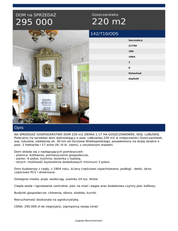 Goszczanówko DOM na SPRZEDAŻ 220 m2 295 000 142/710/ODS Secondary 21700 180 1904 1 6 Detached Asphalt Opis NA SPRZEDAŻ GOSPODARSTWO DOM 220 m2 ZIEMIA 2,17 HA GOSZCZANÓWEK, WOJ. LUBUSKIE. Polecamy na sprzedaż dom wolnostojący o pow. całkowitej 220 m2 w miejscowości Goszczanówek, woj. lubuskie, oddalonej ok. 30 km od Gorzowa Wielkopolskiego, posadowiony na dużej działce o pow. 2 hektarów i 17 arów (III, IV kl. ziemi), z zarybionym stawem. Dom składa się z następujących pomieszczeń: - piwnica: kotłownia, pomieszczenie gospodarcze, - parter: 6 pokoi, kuchnia, łazienka z toaletą, - strych: możliwość wydzielenia dodatkowych minimum 3 pokoi. Dom budownay z cegły, z 1904 roku, ściany częściowo szpachlowane, podłogi - deski, okna częściowo PCV i drewniane. Dostępne media: prąd, wodociąg, szambo 24 tys. litrów. Ciepła woda i ogrzewanie centralne: piec na miał i węgie oraz dodatkowo czynny piec kaflowy. Budynki gospodarcze: chlewnia, obora, stodoła, kurnik. Nieruchomość doskonała na agroturystykę. CENA: 295.000 zł do negocjacji, zaproponuj swoją cenę! Łagoda Nieruchomości MOŻLIWOŚĆ KUPNA TEJ NIERUCHOMOŚCI Z WIĘKSZĄ POWIERZCHNIĄ ZIEMI TJ. 14,68 HA ZA CENĘ 650.000 ZŁ ZAPEWNIAMY BEZPŁATNĄ POMOC W UZYSKANIU KREDYTU Z SZEROKIEJ OFERTY PONAD 25 BANKÓW - GWARANCJA NAJLEPSZEJ OFERTY ZAPRASZAMY NA PREZENTACJĘ ZAPEWNIAMY BEZPŁATNĄ POMOC W UZYSKANIU KREDYTU Z SZEROKIEJ OFERTY PONAD 25 BANKÓW Łagoda Nieruchomości tel. +48 95 725 63 35 email: [email protected] Łagoda Nieruchomości Powered by TCPDF (www.tcpdf.org)
