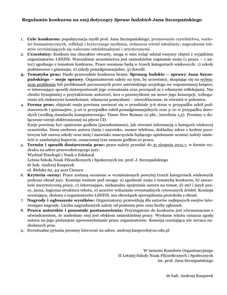 Regulamin konkursu na esej dotyczący Spraw ludzkich Jana Szczepańskiego 1. Cele konkursu: popularyzacja myśli prof. Jana Szczepańskiego; promowanie czytelnictwa, wartości humanistycznych, refleksji i krytycznego myślenia, zwłaszcza wśród młodzieży; nagrodzenie tekstów wyróżniających się walorami intelektualnymi i artystycznymi. 2. Uczestnicy: Konkurs ma charakter otwarty, mogą w nim wziąć udział wszyscy chętni z wyjątkiem organizatorów LSNFiS. Warunkiem uczestnictwa jest samodzielne napisanie eseju (1 praca – 1 autor) zgodnego z tematem konkursu. Prace oceniane będą w trzech kategoriach wiekowych: 1) szkoły podstawowe i gimnazja; 2) szkoły ponadgimnazjalne; 3) dorośli. 3. Tematyka prac: Hasło przewodnie konkursu brzmi: Sprawy ludzkie – sprawy Jana Szczepańskiego – moje sprawy. Organizatorom zależy na tym, by uczestnicy, skupiając się na wybranym problemie lub problemach poruszonych przez ustrońskiego socjologa we wspomnianej książce, w interesujący sposób zinterpretowali jego rozważania oraz powiązali je z własnymi refleksjami. Nie chodzi bynajmniej o przytakiwanie autorowi, lecz o przemyślenie na nowo jego koncepcji, wzbogacenie ich ciekawymi kontekstami, własnymi pomysłami – niewykluczone, że również w polemice. 4. Forma prac: objętość eseju powinna zawierać się w przedziale 3-6 stron w przypadku szkół podstawowych i gimnazjów, 5-10 w przypadku szkół ponadgimnazjalnych oraz 5-10 w przypadku dorosłych (według standardu komputerowego: Times New Roman 12 pkt., interlinia 1,5). Prosimy o dołączenie wersji elektronicznej na płycie CD. Eseje powinny być opatrzone godłem (pseudonimem), jak również informacją o kategorii wiekowej uczestnika. Dane osobowe autora (imię i nazwisko, numer telefonu, dokładny adres z kodem pocztowym lub nazwa szkoły oraz imię i nazwisko nauczyciela będącego opiekunem ucznia) należy umieścić w zamkniętej kopercie, oznaczonej tym samym godłem co praca. 5. Termin i sposób dostarczenia prac: prace należy przesłać do 31 sierpnia 2015 r. w formie wydruku na adres przewodniczącego jury: Wydział Etnologii i Nauk o Edukacji Letnia Szkoła Nauk Filozoficznych i Społecznych im. prof. J. Szczepańskiego dr hab. Andrzej Kasperek ul. Bielska 62, 43-400 Cieszyn 6. Kryteria oceny: Prace zostaną ocenione w wymienionych powyżej trzech kategoriach wiekowych podczas obrad jury. Komisja weźmie pod uwagę: a) zgodność eseju z tematyką konkursu, b) zawartość merytoryczną pracy, c) interesujące, niebanalne spojrzenie autora na temat, d) styl i język pracy, jasna, logiczna struktura tekstu, e) uczciwe wskazanie ewentualnych cytowanych źródeł. Komisja oceniająca, złożona z organizatorów LSNFiS, ma obowiązek sporządzenia protokołu z obrad. 7. Nagrody i ogłoszenie wyników: Organizatorzy przewidują dla autorów najlepszych esejów interesujące nagrody. Liczba nagrodzonych zależy od poziomu prac oraz liczby zgłoszeń. 8. Prawa autorskie i pozostałe postanowienia: Przystąpienie do konkursu jest równoznaczne z oświadczeniem, że nadesłany esej jest efektem samodzielnej pracy. Wysłanie tekstu oznacza zgodę autora na jego późniejsze upowszechnianie przez organizatorów. Komisja oceniająca nie zwraca nadesłanych prac. 9. Ewentualne pytania prosimy kierować na adres: [email protected] W imieniu Komitetu Organizacyjnego II Letniej Szkoły Nauk Filozoficznych i Społecznych im. prof. Jana Szczepańskiego dr hab. Andrzej Kasperek