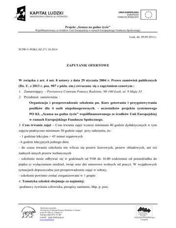 Projekt „Szansa na godne życie” Współfinansowany ze środków Unii Europejskiej w ramach Europejskiego Funduszu Społecznego Łask, dn. 09.09.2014 r. PCPR-V-POKL.SZ.271.10.2014 ZAPYTANIE OFERTOWE W związku z art. 4 ust. 8 ustawy z dnia 29 stycznia 2004 r. Prawo zamówień publicznych (Dz. U. z 2013 r. poz. 907 z późn. zm.) zwracamy się z zapytaniem cenowym : 1. Zamawiający - Powiatowe Centrum Pomocy Rodzinie, 98-100 Łask, ul. 9 Maja 33 2. Przedmiot zamówienia : Organizacja i przeprowadzenie szkolenia pn. Kurs gotowania i przygotowywania posiłków dla 4 osób niepełnosprawnych. - uczestników projektu systemowego PO KL „Szansa na godne życie” współfinansowanego ze środków Unii Europejskiej w ramach Europejskiego Funduszu Społecznego. 3. Czas trwania zajęć – Czas trwania zajęć wynosi minimum 40 godzin dydaktycznych w tym zajęcia praktyczne minimum 30 godzin zajęć przy założeniu, że: - 1 godzina lekcyjna = 45 minut zegarowych - 6 godzin lekcyjnych jednego dnia - do czasu trwania szkolenia nie wlicza się przerw kawowych, przerw obiadowych, ani też żadnych innych przerw technicznych - szkolenie może odbywać się w godzinach od 9.00 do 16.00 codziennie od poniedziałku do piątku (z wyłączeniem niedziel, świąt oraz dni ustawowo wolnych od pracy). W wyjątkowych sytuacjach dopuszczalne jest przeprowadzenie zajęć w soboty. - szkolenie powinno zostać zorganizowane w 1 grupie 4. Tematyka szkoleń obejmuje co najmniej: -podstawy żywienia człowieka, przepisy sanitarne, bhp, p. poż; Realizator projektu Powiatowe Centrum Pomocy Rodzinie w Łasku Łask 98-100, ul. 9 Maja 33 Tel/fax 043 675 37 49 e-mail: [email protected] www.pcprlask.pl Instytucja Pośrednicząca 2 stopnia Projekt „Szansa na godne życie” Współfinansowany ze środków Unii Europejskiej w ramach Europejskiego Funduszu Społecznego - Zajęcia praktyczne: przygotowanie posiłków uwzględniających wybrane diety; technologia gastronomiczna - techniki sporządzania, sposoby dekorowania i podawania potraw - w tym: potrawy tradycyjnej kuchni polskiej, potrawy z wykorzystaniem produktów sezonowych, przygotowanie przetworów. 5. Miejsce organizacji szkolenia: Łask, bądź inne miasto na terenie województwa łódzkiego, Wykonawca jest zobowiązany zapewnić transport uczestników z miejsca ich zamieszkania na miejsce szkolenia i z powrotem (miejsce zamieszkania uczestników szkolenia: 1 osoba z Czestkowa - gmina Buczek; 2 osoby z Kolumny - gmina Łask; 1 osoba z Łasku. 6. Termin wykonania zamówienia: 06 października 2014 r – 31 października 2014 r. 7. Dodatkowe informacje: - do oferty należy przedłożyć harmonogram, będący propozycją terminów szkolenia, - Zamawiający wymaga zorganizowania szkolenia jedynie dla wskazanych przez niego beneficjentów z wsparciem dwóch trenerów, - zaoferowana cena powinna uwzględniać wykonanie wszystkich prac i czynności oraz zawierać wszelkie koszty związane z realizacją zamówienia świadczonego przez okres i na warunkach określonych w ofercie (w tym m.in. zapoznania uczestników z zasadami żywienia, technologią gastronomiczną i towaroznawstwem, wyposażeniem technicznym zakładów gastronomicznych oraz z ćwiczeniami praktycznymi. Koszt zorganizowania kursu powinien uwzględniać ponadto wydatki związane z przygotowaniem niezbędnych materiałów szkoleniowych dla uczestników szkolenia, z zakupem odpowiednich produktów spożywczych, opłat związanych z udostępnieniem pomieszczenia wraz z niezbędnym zapleczem technicznym, w którym odbywać będą się zajęcia praktyczne, - program szkolenia musi być dostosowany do potrzeb i możliwości uczestników- osób niepełnosprawnych. 8. Wykonawca zobowiązany jest zapewnić: a) kadrę prowadzącą szkolenie, posiadającą odpowiednie kwalifikacje, uprawnienia i doświadczenie, w tym doświadczenie w pracy z osobami niepełnosprawnymi; (w sposób zapewniający ciągłość prowadzonych zajęć – np. w razie konieczności zastępstwo), Realizator projektu Powiatowe Centrum Pomocy Rodzinie w Łasku Łask 98-100, ul. 9 Maja 33 Tel/fax 043 675 37 49 e-mail: [email protected] www.pcprlask.pl Instytucja Pośrednicząca 2 stopnia Projekt „Szansa na godne życie” Współfinansowany ze środków Unii Europejskiej w ramach Europejskiego Funduszu Społecznego b) salę szkoleniową wyposażoną w sprzęt niezbędny do wykonania szkolenia oraz indywidualne stanowisko pracy dla uczestników skierowanego na szkolenie; Warunki lokalowe i techniczne powinny być przystosowane do potrzeb i możliwości osób niepełnosprawnych; c) sprzęt niezbędny do przeprowadzenia zajęć praktycznych, materiały i narzędzia pomocnicze niezbędne do przeprowadzenia szkolenia; d) materiały dydaktyczne (każdy uczestnik szkolenia musi otrzymać na własność: program szkolenia i harmonogram zajęć, materiały szkoleniowe zgodne z tematyką szkolenia materiały z logotypami Unii Europejskiej i Europejskiego Funduszu Społecznego); dodatkowo jeden egzemplarz materiałów dydaktycznych dla Zamawiającego, przekazany najpóźniej 3 dni przed planowanym rozpoczęciem realizacji szkolenia, e) materiały biurowe dla każdego uczestnika na własność (teczka lub segregator, notatnik format A5 oraz długopis) – z logotypami Unii Europejskiej i Europejskiego Funduszu Społecznego. Wzór materiałów biurowych, tj. jeden komplet, powinien dotrzeć do Zamawiającego najpóźniej 3 dni przed planowanym rozpoczęciem realizacji szkolenia, f) oznaczenie miejsca szkolenia zgodnie z wymogami PO KL, g) catering dla uczestników szkolenia w postaci drugiego dania oraz „serwis kawowy” ( kawy, herbaty, ciastek, stałego dostępu do wody mineralnej) podczas każdego dnia zajęć, h) ubezpieczenie uczestników skierowanych na szkolenie od następstw nieszczęśliwych wypadków powstałych w związku ze szkoleniem oraz w drodze na szkolenie i z powrotem, i) niezbędne badania lekarskie przed rozpoczęciem szkolenie 