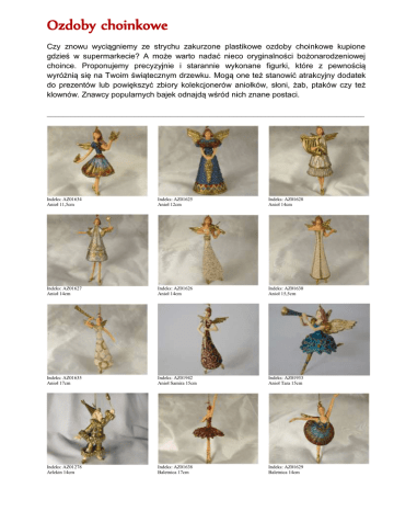 Ozdoby choinkowe Czy znowu wyciągniemy ze strychu zakurzone plastikowe ozdoby choinkowe kupione gdzieś w supermarkecie? A może warto nadać nieco oryginalności bożonarodzeniowej choince. Proponujemy precyzyjnie i starannie wykonane figurki, które z pewnością wyróżnią się na Twoim świątecznym drzewku. Mogą one też stanowić atrakcyjny dodatek do prezentów lub powiększyć zbiory kolekcjonerów aniołków, słoni, żab, ptaków czy też klownów. Znawcy popularnych bajek odnajdą wśród nich znane postaci. ________________________________________________________________________________ Indeks: AZ01634 Anioł 11,5cm Indeks: AZ01625 Anioł 12cm Indeks: AZ01628 Anioł 14cm Indeks: AZ01627 Anioł 14cm Indeks: AZ01626 Anioł 14cm Indeks: AZ01630 Anioł 15,5cm Indeks: AZ01635 Anioł 17cm Indeks: AZ01942 Anioł Samira 15cm Indeks: AZ01933 Anioł Tara 15cm Indeks: AZ01278 Arlekin 14cm Indeks: AZ01638 Baletnica 17cm Indeks: AZ01629 Baletnica 14cm