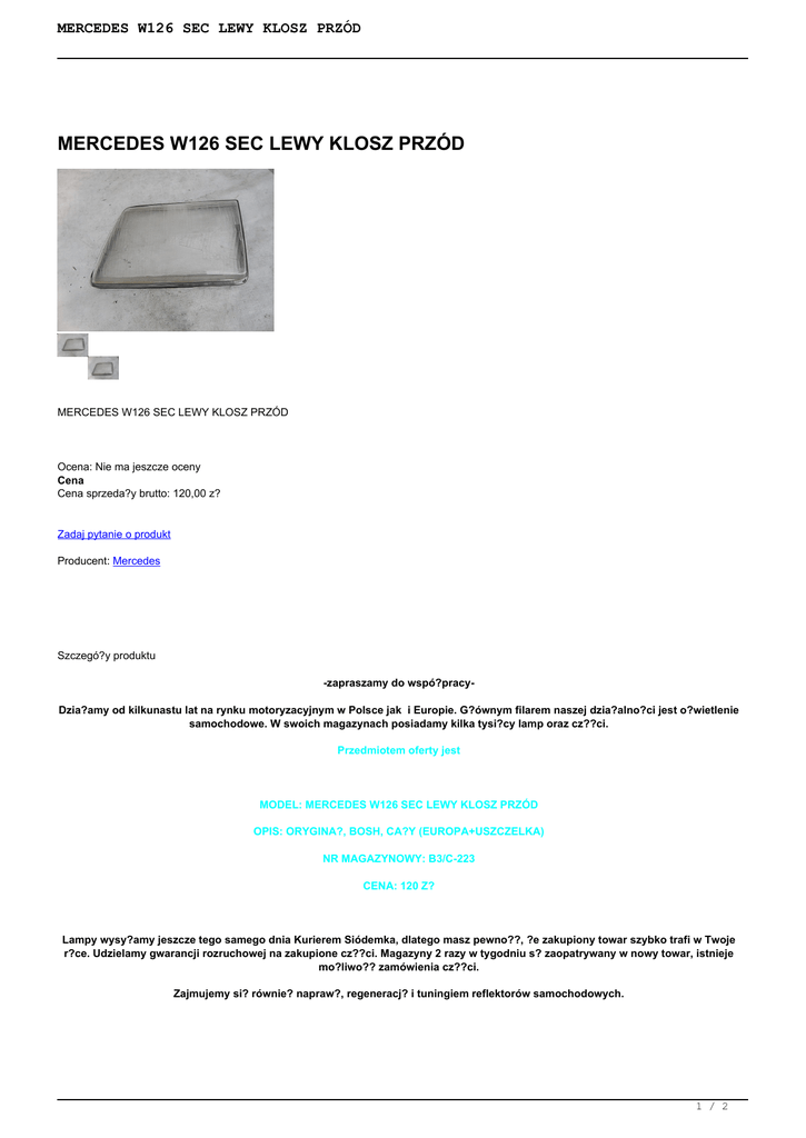 MERCEDES W126 SEC LEWY KLOSZ PRZÓD MERCEDES W126 SEC LEWY KLOSZ PRZÓD MERCEDES W126 SEC LEWY KLOSZ PRZÓD Ocena: Nie ma jeszcze oceny Cena Cena sprzeda?y brutto: 120,00 z? Zadaj pytanie o produkt Producent: Mercedes Szczegó?y produktu -zapraszamy do wspó?pracyDzia?amy od kilkunastu lat na rynku motoryzacyjnym w Polsce jak i Europie. G?ównym filarem naszej dzia?alno?ci jest o?wietlenie samochodowe. W swoich magazynach posiadamy kilka tysi?cy lamp oraz cz??ci. Przedmiotem oferty jest MODEL: MERCEDES W126 SEC LEWY KLOSZ PRZÓD OPIS: ORYGINA?, BOSH, CA?Y (EUROPA+USZCZELKA) NR MAGAZYNOWY: B3/C-223 CENA: 120 Z? Lampy wysy?amy jeszcze tego samego dnia Kurierem Siódemka, dlatego masz pewno??, ?e zakupiony towar szybko trafi w Twoje r?ce. Udzielamy gwarancji rozruchowej na zakupione cz??ci. Magazyny 2 razy w tygodniu s? zaopatrywany w nowy towar, istnieje mo?liwo?? zamówienia cz??ci. Zajmujemy si? równie? napraw?, regeneracj? i tuningiem reflektorów samochodowych. 1 / 2 MERCEDES W126 SEC LEWY KLOSZ PRZÓD Siedziba firmy: Lampy Samochodowe P.Alwin Nowa 33 64-560 Ostroróg NIP: 783-160-38-97 TEL.: 739-020-099 513-531-967 [email protected] Drogi kliencie! Masz prawo zwrotu zakupionego towaru w ci?gu 14 dni bez podania przyczyny, niczym nie ryzykujesz. Jedyne koszty, których nie zwracamy to koszty wysy?ki. 2 / 2 Powered by TCPDF (www.tcpdf.org)