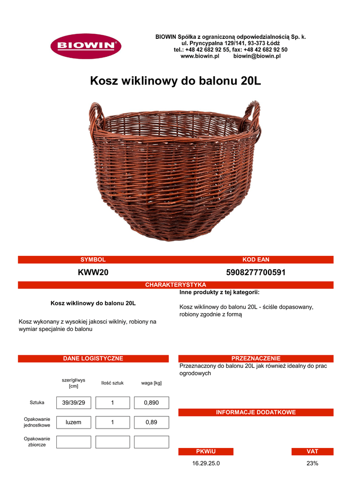Kosz wiklinowy do balonu 20L SYMBOL KOD EAN KWW20 5908277700591 CHARAKTERYSTYKA Inne produkty z tej kategorii: Kosz wiklinowy do balonu 20L Kosz wiklinowy do balonu 20L - ściśle dopasowany, robiony zgodnie z formą Kosz wykonany z wysokiej jakosci wiklniy, robiony na wymiar specjalnie do balonu DANE LOGISTYCZNE Sztuka PRZEZNACZENIE Przeznaczony do balonu 20L jak również idealny do prac ogrodowych szer/gł/wys [cm] Ilość sztuk waga [kg] 39/39/29 1 0,890 INFORMACJE DODATKOWE Opakowanie jednostkowe luzem 1 0,89 Opakowanie zbiorcze PKWiU VAT 16.29.25.0 23%
