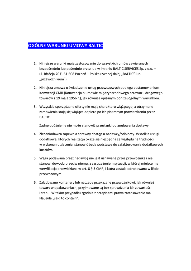 OGÓLNE WARUNKI UMOWY BALTIC 1. Niniejsze warunki mają zastosowanie do wszystkich umów zawieranych bezpośrednio lub pośrednio przez lub w imieniu BALTIC SERVICES Sp. z o.o. – ul. Błażeja 70 E, 61-608 Poznań – Polska (zwanej dalej „BALTIC” lub „przewoźnikiem”). 2. Niniejsza umowa o świadczenie usług przewozowych podlega postanowieniom Konwencji CMR (Konwencja o umowie międzynarodowego przewozu drogowego towarów z 19 maja 1956 r.), jak również opisanym poniżej ogólnym warunkom. 3. Wszystkie sporządzane oferty nie mają charakteru wiążącego, a otrzymane zamówienia stają się wiążące dopiero po ich pisemnym potwierdzeniu przez BALTIC. Żadne opóźnienie nie może stanowić przesłanki do anulowania dostawy. 4. Zleceniodawca zapewnia sprawny dostęp u nadawcy/odbiorcy. Wszelkie usługi dodatkowe, których realizacja okaże się niezbędna ze względu na trudności w wykonaniu zlecenia, stanowić będą podstawę do zafakturowania dodatkowych kosztów. 5. Waga podawana przez nadawcę nie jest uznawana przez przewoźnika i nie stanowi dowodu przeciw niemu, z zastrzeżeniem sytuacji, w której miejsce ma weryfikacja przewidziana w art. 8 § 3 CMR, i która została odnotowana w liście przewozowym. 6. Załadowane kontenery lub naczepy przekazane przewoźnikowi, jak również towary w opakowaniach, przyjmowane są bez sprawdzania ich zawartości i stanu. W takim przypadku zgodnie z przepisami prawa zastosowanie ma klauzula „said to contain”. 7. Strony uzgadniają jednoznacznie, że załadunek, sztauowanie i rozładunek kontenera lub naczepy wykonywane są przez nadawcę i/lub odbiorcę. W przypadku, gdy nadawca lub odbiorca zwrócą się do kierowców o wykonanie czynności załadunku, sztauowania lub rozładunku, kierowcy wykonają te czynności pod ścisłym nadzorem, kontrolą i na odpowiedzialność danego nadawcy i/lub odbiorcy. BALTIC nie ponosi jakiejkolwiek odpowiedzialności za szkody spowodowane przez załadunek, sztauowanie lub rozładunek kontenera i/lub w czasie trwania tych czynności. 8. Zostaje jednoznacznie uzgodnione, że zleceniodawca i/lub podmiot wykonujący załadunek w pełni zwalniają BALTIC ze wszelkich kar i roszczeń odszkodowawczych jakiegokolwiek rodzaju będących skutkiem niekompetentnego załadunku względnie załadunku wykonanego z naruszeniem obowiązujących w tym zakresie wymogów prawnych, nawet jeśli załadunek taki wykonywany byłby przez kierowców BALTIC, zgodnie z artykulem 7 , na wniosek nadawcy i/ lub odbiorcy . 9. Strony uzgadniają jednoznacznie, że opłaty celne, akcyza i podatek VAT związane z przewożonymi przez BALTIC towarami nie będą opłacane przez tego ostatniego. 10. Przedstawiciele przewoźnika nie mogą akceptować jakichkolwiek instrukcji lub deklaracji nakładających zobowiązania na przewoźnika, które wykraczałyby poza wyznaczone ramy odnośnie do: - wartości towarów obowiązujących jako referencyjne w przypadku pełnej lub częściowej utraty względnie uszkodzenia (CMR, art. 23 i 25 ), - terminów dostaw (CMR, art. 19), - instrukcji dotyczących płatności przy odbiorze (CMR, art. 21), - wartości szczególnej (CMR, art. 24) lub specjalnego interesu w dostawie (CMR, art. 26). Nie są oni również upoważnieni do przyjmowania instrukcji lub oświadczeń, jakie zobowiązywałyby przewoźnika w odniesieniu do towarów niebezpiecznych (ADR) lub towarów stanowiących przedmiot szczególnych limitów. 11. Faktury opłacane będą nie później niż w dniu ich wymagalności podanym na fakturze bez rabatu oraz bez stosowania kompensacji roszczeń. W przypadku braku zapłaty w wyznaczonym dniu zgodnie z przepisami prawa oraz bez jakiegokolwiek wcześniejszego powiadomienia o niewywiązaniu się ze zobowiązania w stosunku do wszystkich niezapłaconych kwot naliczane będą odsetki za zwłokę w wysokości 12 % w skali roku oraz zryczałtowane odszkodowanie w wysokości 15 % niezapłaconej kwoty przy minimum 125,00 EUR. 12. Pomiędzy BALTIC i zleceniodawcą uzgodnione zostało jednoznacznie, że wszystkie usługi stanowią jedną całość, oraz że wszystkie towary, jakie zleceniodawca powierzył lub powierzy BALTIC stanowią zastaw względem należności na rzecz BALTIC. BALTIC ma prawo odmowy dostarczenia danego towaru przed wykonaniem przez zleceniodawcę części jego zobowiązań, niezależnie od tego, czy zobowiązania te odnoszą się do towaru w posiadaniu lub pod nadzorem BALTIC czy ustalonej osoby trzeciej. 13. Czas oczekiwania przekraczający 2 godziny na fracht podczas załadunku lub rozładunku oraz czas oczekiwania przekraczający 1 godzinę podczas podłączania zostanie dodatkowo zafakturowany zleceniodawcy przez przewoźnika. Zleceniodawca zgadza się na opłacenie tego czasu zgodnie ze stawką godzinową obowiązującą według umowy pisemnej. Dowód czasu oczekiwania zostanie przedstawiony w oparciu o list przewozowy podpisany przez nadawcę lub odbiorcę. 14. Ponadnormatywny czas oczekiwania w procedurze celnej wskutek m.in. nieprzewidzianych akcji strajkowych lub z powodu braku, niepełności lub niedokładności listu przewozowego czy różnych dokumentów, takich jak karnety TIR, dokumenty tranzytowe, atesty sanitarne itp., stanowią przesłankę do podwyższenia ceny. 15. Siła wyższa - BALTIC nie ponosi odpowiedzialności za opóźnienie, niewywiązywanie się z wykonania niniejszej umowy, jeśli opóźnienie lub niewywiązanie się spowodowane będzie przez siłę wyższą. Siła wyższa oznacza wszystkie zdarzenia niezależne od woli i/lub kontroli BALTIC. W takich okolicznościach nie będzie możliwe zgłoszenie roszczeń odszkodowawczych względem BALTIC. 16. Każda ze stron jest niezależnym podmiotem - zarówno prawnie jak i finansowo i, przystępując do niniejszej umowy, działa na własną odpowiedzialność. Niniejsza umowa nie ma charakteru „joint venture”, nie stanowi pełnomocnictwa udzielonego jednej stronie przez drugą, nie jest umową agenc