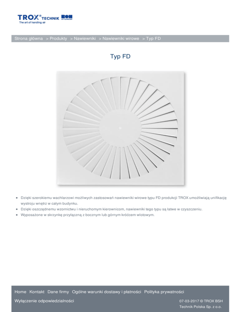 Strona główna > Produkty > Nawiewniki > Nawiewniki wirowe > Typ FD Typ FD Dzięki szerokiemu wachlarzowi możliwych zastosowań nawiewniki wirowe typu FD produkcji TROX umożliwiają unifikację wystroju wnętrz w całym budynku. Dzięki oszczędnemu wzornictwu i nieruchomym kierownicom, nawiewniki tego typu są łatwe w czyszczeniu. Wyposażone w skrzynkę przyłączną z bocznym lub górnym króćcem wlotowym. Home Kontakt Dane firmy Ogólne warunki dostawy i płatności Polityka prywatności Wyłączenie odpowiedzialności 07-03-2017 © TROX BSH Technik Polska Sp. z o.o. Strona główna > Produkty > Nawiewniki > Nawiewniki wirowe > Typ FD OPIS URZĄDZENIA Płyta czołowa nawiewników wirowych typu FD produkcji TROX wykonana jest z ustawionych promieniście, nieprzestawialnych łopatek kierujących strumień powietrza nawiewanego. Płyta czołowa może być okrągła lub kwadratowa. Podłączenie do kanałów wentylacyjnych poprzez skrzynkę rozprężną z pionowym lub poziomym króćcem przyłącznym. Poziomy i wirowy wypływ zapewnia wysoką indukcję powietrza, a w następstwie szybkie wyrównanie temperatury i spadek prędkości w strumieniu powietrza nawiewanego. W celu stabilizacji strumienia nawiewnego konieczne jest zlicowanie płyty czołowej nawiewnika z powierzchnią sufitu, dotyczy to wszystkich wielkości nawiewników. TECHNOLOGIA okrągłe, kwadratowe 30 – 200 l/s 110 – 700 m³/h 65 – 412 cfm Ø 300 – 625 mm 298 – 623 mm Home Kontakt Dane firmy Ogólne warunki dostawy i płatności Polityka prywatności Wyłączenie odpowiedzialności 07-03-2017 © TROX BSH Technik Polska Sp. z o.o. Strona główna > Produkty > Nawiewniki > Nawiewniki wirowe > Typ FD TROX BSH Technik Polska Sp. z o.o. Kontakt online Formularz kontaktowy Kontakt TROX BSH Stara Iwiczna Zgłoszenie usterki Zapytanie ofertowe - szafy Telefon: +48 22 73718 58 Fax: +48 22 737 18 59 Tel. Komórkowy: +48 662 129 415 Kontakt TROX BSH Technik Polska Sp. z o.o. ul. Kolejowa 13, Stara Iwiczna 05-500 Piaseczno telefon +48 22 737 18 58 fax +48 22 737 18 59 e-mail: [email protected] Home Kontakt Dane firmy Ogólne warunki dostawy i płatności Polityka prywatności Wyłączenie odpowiedzialności 07-03-2017 © TROX BSH Technik Polska Sp. z o.o.