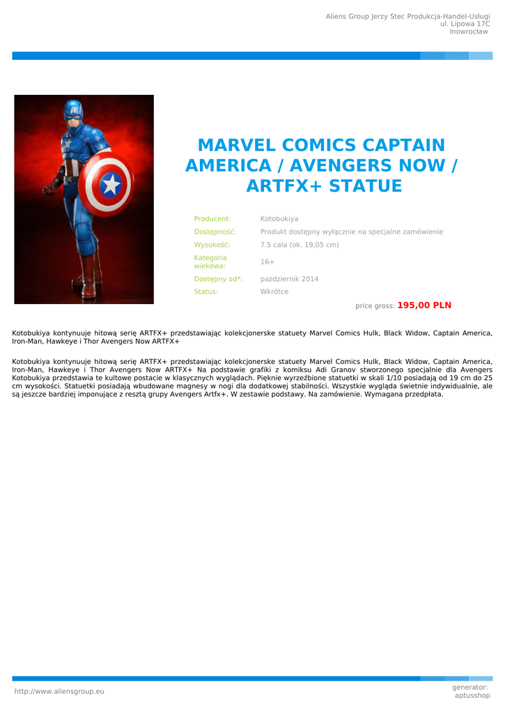 Aliens Group Jerzy Stec Produkcja-Handel-Usługi ul. Lipowa 17C Inowrocław MARVEL COMICS CAPTAIN AMERICA / AVENGERS NOW / ARTFX+ STATUE Producent: Kotobukiya Dostępność: Produkt dostępny wyłącznie na specjalne zamówienie Wysokość: 7.5 cala (ok. 19,05 cm) Kategoria wiekowa: 16+ Dostępny od*: pażdziernik 2014 Status: Wkrótce price gross: 195,00 PLN Kotobukiya kontynuuje hitową serię ARTFX+ przedstawiając kolekcjonerske statuety Marvel Comics Hulk, Black Widow, Captain America, Iron-Man, Hawkeye i Thor Avengers Now ARTFX+ Kotobukiya kontynuuje hitową serię ARTFX+ przedstawiając kolekcjonerske statuety Marvel Comics Hulk, Black Widow, Captain America, Iron-Man, Hawkeye i Thor Avengers Now ARTFX+ Na podstawie grafiki z komiksu Adi Granov stworzonego specjalnie dla Avengers Kotobukiya przedstawia te kultowe postacie w klasycznych wyglądach. Pięknie wyrzeźbione statuetki w skali 1/10 posiadają od 19 cm do 25 cm wysokości. Statuetki posiadają wbudowane magnesy w nogi dla dodatkowej stabilności. Wszystkie wygląda świetnie indywidualnie, ale są jeszcze bardziej imponujące z resztą grupy Avengers Artfx+. W zestawie podstawy. Na zamówienie. Wymagana przedpłata. http://www.aliensgroup.eu generator: aptusshop