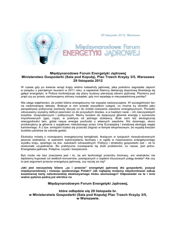 Międzynarodowe Forum Energetyki Jądrowej Ministerstwo Gospodarki (Sala pod Kopułą), Plac Trzech Krzyży 3/5, Warszawa 29 listopada 2012 W czasie gdy po świecie wciąż krąży widmo katastrofy jądrowej, jaka podobno zagrażała Japonii w związku z pamiętnym tsunami w 2011 roku, a sąsiednie Niemcy deklarują stopniową likwidację tej gałęzi energetyki, w Polsce konkretyzuje się plany budowy pierwszej siłowni jądrowej. Płyniemy pod prąd czy po prostu zachowujemy zdrowy rozsądek, gdy inni wpadają w nieuzasadnioną panikę? Nie ulega wątpliwości, że polski bilans energetyczny nie wypada nadzwyczajnie. W szczególności ten na nadchodzące dekady. Brakuje w nim przede wszystkim czegoś, co można by określić jako perspektywa politycznej swobody decyzji co do źródeł czerpania zasobów energetycznych. Ponadto odczuwamy wyraźny deficyt pewności co do przyszłych dostaw, a w każdym razie – ich rzeczywistych kosztów. Gospodarczych i politycznych. Mamy bowiem do dyspozycji głównie energię z surowców importowanych (gaz, ropa), w praktyce od jednego dostawcy. Brak nam też ekologicznej wiarygodności tam, gdzie nasza energia pochodzi z własnych zasobów. Nic dziwnego, skoro produkujemy ją głównie z wyjątkowo nielubianego przez Unię Europejską i światową ekologię węgla kamiennego. A z tzw. emisjami trzeba się przecież żegnać w tempie ekspresowym, bo wypalą kieszeń budżetu państwa że szkoda gadać. Ekolodzy mówią o rozwiązaniu energetycznej łamigłówki, tkwiącym w tysiącach niewybudowanych jeszcze wiatraków, w szerokim wykorzystaniu biomasy i w ogóle w rozproszeniu energetycznego wysiłku kraju, opartego na tzw. zasobach odnawialnych. Politycy i stratedzy gospodarki zaś – że to doskonałe uzupełnienie. Bo praktyczne rozwiązanie tej skali problemów, co nasze, jest jedno. Energetyka jądrowa. Potężna, czysta i bezpieczna. Być może nie bez znaczenia jest i to, że ani technologii przerobu biomasy, ani wiatraków nie będziemy kupować od wielkich koncernów, powiązanych z rządami kluczowych potęg świata? Ale czy to jest argument przeciw energetyce jądrowej, czy raczej za nią? Jaki jest rzeczywisty bilans „za i przeciw” energetyki jądrowej dla gospodarki, pozycji międzynarodowej i rozwoju społecznego Polski? Jak najlepiej możemy zdyskontować zakup kosztownej karty członkowskiej ekskluzywnego klubu atomowego? Odpowiedzi na te i inne ważne pytania padną już wkrótce na Międzynarodowym Forum Energetyki Jądrowej, które odbędzie się 29 listopada br. w Ministerstwie Gospodarki (Sala pod Kopułą) Plac Trzech Krzyży 3/5, w Warszawie. Organizatorem spotkania są: magazyn The Warsaw Voice oraz PowerMeetings.pl, znana w branży, wyspecjalizowana firma konferencyjno-szkoleniowa. Zapraszamy do udziału! Więcej informacji: www.energyforum.eu Miło nam poinformować, że swoje wystąpienia w trakcie konferencji potwierdzili między innymi: Hanna Trojanowska, Pełnomocnik Rządu ds. Polskiej Energetyki Jądrowej, Podsekretarz Stanu w Ministerstwie Gospodarki, Aleksander Grad, Prezes Zarządu PGE Energia Jądrowa, Andrzej Czerwiński, Przewodniczący Parlamentarnego Zespołu ds. Energetyki, prof. Andrzej Kraszewski, Minister Środowiska 2010-2011, Politechnika Warszawska, prof. Grzegorz Wrochna, Dyrektor Narodowego Centrum Badań Jądrowych, prof. Andrzej Chmielewski, Dyrektor Instytutu Chemii i Techniki Jądrowej, dr Krzysztof Rzymkowski, Sekretarz Generalny SEREN Polska, Anna Katarzyna Nietyksza, Prezes Zarządu EFICOM, Dariusz Szwed, Partia Zieloni 2004. Do zabrania głosu zostali zaproszeni także: Marek Walczak, Prezes Urzędu Dozoru Technicznego, Henryk Majchrzak, Prezes Zarządu PSE Operator oraz wiele innych, znamienitych osób. Wśród potwierdzonych i zaproszonych firm dostarczających technologie, są m.in. GE Hitachi, Westinghouse-Toshiba. Do udziału zaprosiliśmy przedstawicieli polskich i międzynarodowych firm zainteresowanych rozwojem energetyki jądrowej w Polsce, przedstawicieli środowiska naukowego, organizacje branżowe, samorządy, media i inne instytucje zainteresowane tematem. Kontakt z organizatorem: Renata Kałużna Dyrektor Zarządzająca SC Consulting +48 22 740 67 80 +48 603 386 917 [email protected] Agnieszka Kozłowska Project Manager SC Consulting +48 22 740 67 80 [email protected]