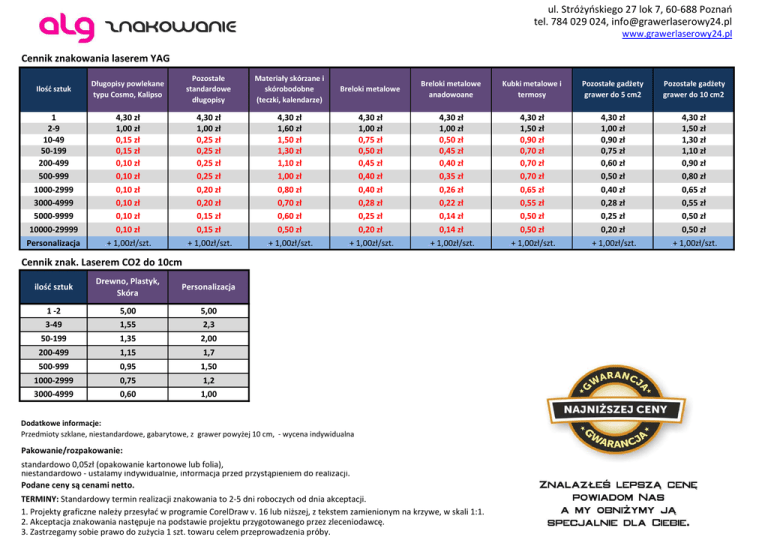 ul. Stróżyńskiego 27 lok 7, 60-688 Poznań tel. 784 029 024, [email protected] www.grawerlaserowy24.pl Cennik znakowania laserem YAG Pozostałe standardowe długopisy Ilość sztuk Długopisy powlekane typu Cosmo, Kalipso 1 2-9 10-49 50-199 200-499 500-999 1000-2999 3000-4999 5000-9999 10000-29999 Personalizacja 4,30 zł 1,00 zł 0,15 zł 0,15 zł 0,10 zł 0,10 zł 0,10 zł 0,10 zł 0,10 zł 0,10 zł .+ 1,00zł/szt. 4,30 zł 1,00 zł 0,25 zł 0,25 zł 0,25 zł 0,25 zł 0,20 zł 0,20 zł 0,15 zł 0,15 zł .+ 1,00zł/szt. ilość sztuk Drewno, Plastyk, Skóra Personalizacja 3-49 1,55 2,3 200-499 1,15 Cennik znak. Laserem CO2 do 10cm 1 -2 50-199 500-999 1000-2999 3000-4999 5,00 5,00 1,35 2,00 0,95 1,50 0,60 1,00 0,75 Materiały skórzane i skórobodobne (teczki, kalendarze) 4,30 zł 1,60 zł 1,50 zł 1,30 zł 1,10 zł 1,00 zł 0,80 zł 0,70 zł 0,60 zł 0,50 zł .+ 1,00zł/szt. Breloki metalowe Breloki metalowe anadowoane Kubki metalowe i termosy Pozostałe gadżety grawer do 5 cm2 Pozostałe gadżety grawer do 10 cm2 4,30 zł 1,00 zł 0,75 zł 0,50 zł 0,45 zł 0,40 zł 0,40 zł 0,28 zł 0,25 zł 0,20 zł .+ 1,00zł/szt. 4,30 zł 1,00 zł 0,50 zł 0,45 zł 0,40 zł 0,35 zł 0,26 zł 0,22 zł 0,14 zł 0,14 zł .+ 1,00zł/szt. 4,30 zł 1,50 zł 0,90 zł 0,70 zł 0,70 zł 0,70 zł 0,65 zł 0,55 zł 0,50 zł 0,50 zł .+ 1,00zł/szt. 4,30 zł 1,00 zł 0,90 zł 0,75 zł 0,60 zł 0,50 zł 0,40 zł 0,28 zł 0,25 zł 0,20 zł .+ 1,00zł/szt. 4,30 zł 1,50 zł 1,30 zł 1,10 zł 0,90 zł 0,80 zł 0,65 zł 0,55 zł 0,50 zł 0,50 zł .+ 1,00zł/szt. 1,7 1,2 Dodatkowe informacje: Przedmioty szklane, niestandardowe, gabarytowe, z grawer powyżej 10 cm, - wycena indywidualna Pakowanie/rozpakowanie: standardowo 0,05zł (opakowanie kartonowe lub folia), niestandardowo - ustalamy indywidualnie, informacja przed przystąpieniem do realizacji. Podane ceny są cenami netto. TERMINY: Standardowy termin realizacji znakowania to 2-5 dni roboczych od dnia akceptacji. 1. Projekty graficzne należy przesyłać w programie CorelDraw v. 16 lub niższej, z tekstem zamienionym na krzywe, w skali 1:1. 2. Akceptacja znakowania następuje na podstawie projektu przygotowanego przez zleceniodawcę. 3. Zastrzegamy sobie prawo do zużycia 1 szt. towaru celem przeprowadzenia próby.