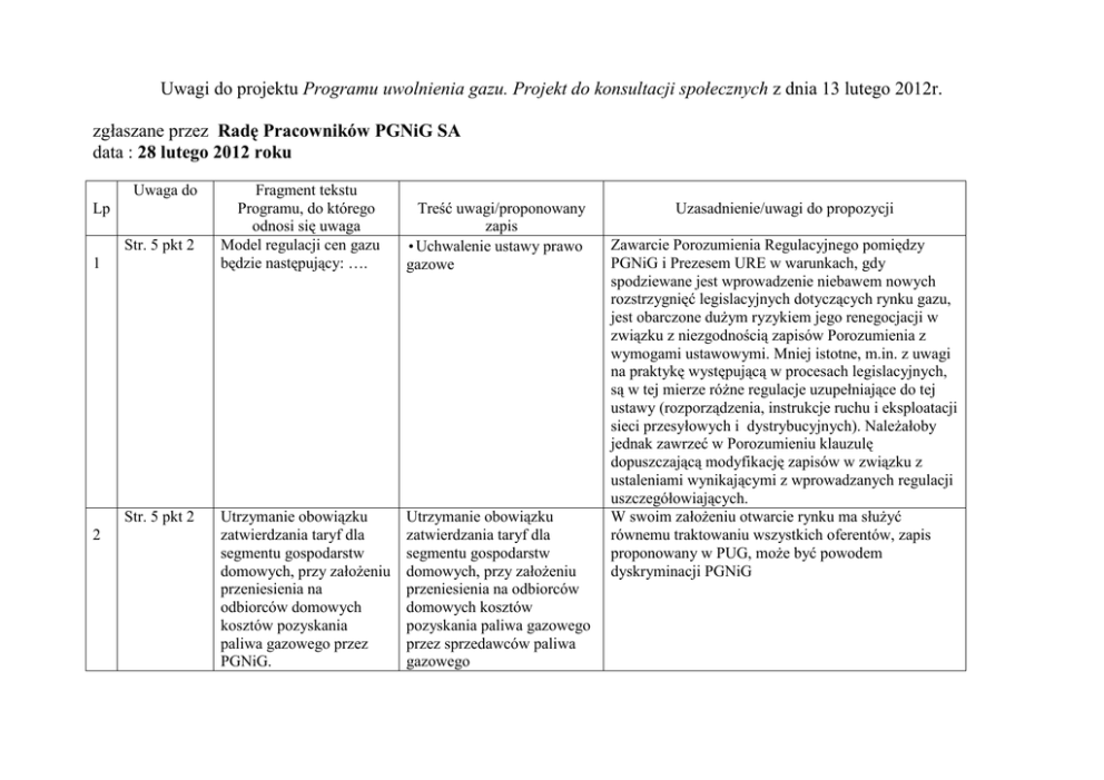 Uwagi do projektu Programu uwolnienia gazu. Projekt do konsultacji społecznych z dnia 13 lutego 2012r. zgłaszane przez Radę Pracowników PGNiG SA data : 28 lutego 2012 roku Uwaga do Lp Str. 5 pkt 2 1 Str. 5 pkt 2 2 Fragment tekstu Programu, do którego odnosi się uwaga Model regulacji cen gazu będzie następujący: …. Treść uwagi/proponowany zapis •Uchwalenie ustawy prawo gazowe Utrzymanie obowiązku zatwierdzania taryf dla segmentu gospodarstw domowych, przy założeniu przeniesienia na odbiorców domowych kosztów pozyskania paliwa gazowego przez PGNiG. Utrzymanie obowiązku zatwierdzania taryf dla segmentu gospodarstw domowych, przy założeniu przeniesienia na odbiorców domowych kosztów pozyskania paliwa gazowego przez sprzedawców paliwa gazowego Uzasadnienie/uwagi do propozycji Zawarcie Porozumienia Regulacyjnego pomiędzy PGNiG i Prezesem URE w warunkach, gdy spodziewane jest wprowadzenie niebawem nowych rozstrzygnięć legislacyjnych dotyczących rynku gazu, jest obarczone dużym ryzykiem jego renegocjacji w związku z niezgodnością zapisów Porozumienia z wymogami ustawowymi. Mniej istotne, m.in. z uwagi na praktykę występującą w procesach legislacyjnych, są w tej mierze różne regulacje uzupełniające do tej ustawy (rozporządzenia, instrukcje ruchu i eksploatacji sieci przesyłowych i dystrybucyjnych). Należałoby jednak zawrzeć w Porozumieniu klauzulę dopuszczającą modyfikację zapisów w związku z ustaleniami wynikającymi z wprowadzanych regulacji uszczegółowiających. W swoim założeniu otwarcie rynku ma służyć równemu traktowaniu wszystkich oferentów, zapis proponowany w PUG, może być powodem dyskryminacji PGNiG Str. 6 pkt 2 3 Koncepcja PUG zakłada udostępnienie przez PGNiG w ramach aukcji na lata 2013-2015 łącznych wolumenów gazu ziemnego GZ-50 w wysokości do 70% wielkości rynku (określonego na bazie roku 2011), czyli do łącznej wysokości 9,4 mld m3/rocznie. Koncepcja PUG zakłada udostępnienie przez PGNiG w ramach aukcji w roku 2013 łącznych wolumenów gazu ziemnego GZ-50 w wysokości do 3,4 mld m3/rocznie. Wielkość wolumenów gazu oferowanego na aukcjach PUG w latach 2014-2015 będą uzależnione od realnego popytu na taką formę zakupu gazu ziemnego GZ-50 w roku poprzednim. W roku 2015 łączny wolumen gazu ziemnego GZ-50 udostępnianego przez PGNiG nie powinien przekroczyć 6,7 mld m3/rok. Przyjęcie niejako za bazę PUG przekazania na aukcję wolumenu gazu w ilości do 70% zapotrzebowania krajowego jest obarczone ryzykiem, które w skrajnych okolicznościach może nie tylko nie doprowadzić do realnego otwarcia się rynku, ale jedynie do zastąpienia pozycji dominującej na rynku gazu jaką ma do tej pory PGNiG przez inny podmiot i to najprawdopodobniej przez podmiot z dominacją kapitału obcego i nawet niekoniecznie zasilanego kapitałem z państw UE. Jest to oczywiście zagrożenie dla bezpieczeństwa energetycznego państwa, mającego nadzór właścicielski nad PGNiG. Z uwagi na to proces uwalniania rynku gazu powinien odbywać się stopniowo, a wobec doświadczeń innych państw, które działania uwalniania rynku gazu mają za sobą należałoby przyjąć, że w pierwszym roku funkcjonowania tego Programu wielkość ta nie powinna przekroczyć 25% dotychczasowego zapotrzebowania krajowego. Przy założeniu, że gaz pochodzący od PGNiG będzie w dalszym ciągu realizował popyt krajowy na poziomie 98% (co z uwagi na różne zawirowania w gospodarce światowej wcale nie jest pewne) ilości oferowane na aukcji w latach następnych powinny być warunkowane wielkością zakupów (zainteresowania zakupem) w roku poprzednim. Mechanizm kroczący przy kształtowaniu oferty będzie jednocześnie pełnił rolę zaworu bezpieczeństwa w warunkach różnych zawirowań na rynku. Zbyt wysokie (powyżej 50% zapotrzebowania krajowego) odstąpienie własnego gazu przez PGNiG może doprowadzić do sytuacji, w której PGNiG nie będzie w stanie wywiązać z odbiorcami którzy nie będą się godzić na innego sprzedawcę. Np. w sytuacji gdy klient PGNiG znajdzie się w sytuacji kryzysowej, będzie szukał poprawy własnej kondycji przez żądanie kar umownych z tytułu niewywiązywania się sprzedawcy (PGNiG) z obowiązku umownego, zamiast szukania innego podmiotu mogącemu mu zaoferować zakupiony na aukcji czy też rynku wtórnym gaz. Konieczne jest wprowadzenie regulacji uniemożliwiającej (w dalszej perspektywie czasowej 3 lat) opanowanie rynku przez jeden podmiot w zakresie większym niż 50%. PGNiG ten zapis również powinien dotyczyć, z tym jednak zastrzeżeniem, że o ile nie zrealizuje na aukcji całej swojej oferty będzie mógł sprzedać własny gaz na rynku detalicznym w ilości większej niż połowa krajowego zapotrzebowania. Str. 6 pkt 2 4 Zgodnie z wytycznymi Prezesa URE gaz będzie oferowany w ramach PUG w 5 aukcjach organizowanych w regularnych odstępach co 2 tygodnie. W każdej aukcji udostępniane będzie do 1,9 mld m3 gazu dla każdego roku funkcjonowania PUG (ca 14% rynku) Gaz ziemny GZ-50 w roku 2013 będzie oferowany w ramach PUG w 3 aukcjach organizowanych w odstępach co 5-6 tygodni. Wraz ze wzrostem ilości udostępnianego na aukcji gazu ilość aukcji może wzrosnąć do pięciu. Okres między pierwszą a ostatnią aukcją w danym roku nie powinien być dłuższy niż jeden kwartał. W każdej aukcji oferowana będzie równa ilość gazu będąca Dobrym rozwiązaniem może być oferowanie całej puli gazu przeznaczonego na aukcję w kilku transzach, przy czym czas między nimi powinien być dłuższy zwłaszcza w pierwszym roku, co może pozwolić większej ilości podmiotów przystąpić do aukcji, a tym samym urealnić otwartość rynku. Wydaje się, że w pierwszym roku funkcjonowania Programu wystarczą 3 aukcje, a okresy między kolejnymi aukcjami powinny być nie krótsze niż 5-6 tygodni. W kolejnych latach wraz ze wzrostem wielkości oferty można zwiększyć częstość i ilość au