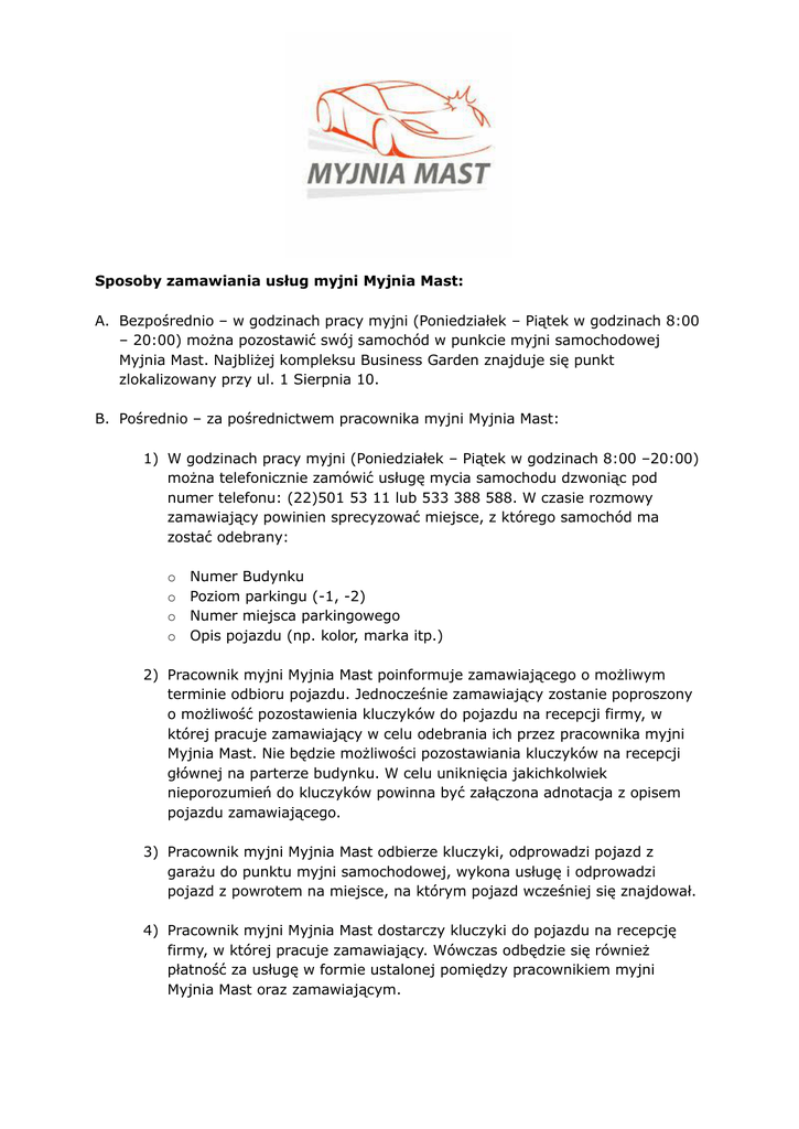 Sposoby zamawiania usług myjni Myjnia Mast: A. Bezpośrednio – w godzinach pracy myjni (Poniedziałek – Piątek w godzinach 8:00 – 20:00) można pozostawić swój samochód w punkcie myjni samochodowej Myjnia Mast. Najbliżej kompleksu Business Garden znajduje się punkt zlokalizowany przy ul. 1 Sierpnia 10. B. Pośrednio – za pośrednictwem pracownika myjni Myjnia Mast: 1) W godzinach pracy myjni (Poniedziałek – Piątek w godzinach 8:00 –20:00) można telefonicznie zamówić usługę mycia samochodu dzwoniąc pod numer telefonu: (22)501 53 11 lub 533 388 588. W czasie rozmowy zamawiający powinien sprecyzować miejsce, z którego samochód ma zostać odebrany: o o o o Numer Budynku Poziom parkingu (-1, -2) Numer miejsca parkingowego Opis pojazdu (np. kolor, marka itp.) 2) Pracownik myjni Myjnia Mast poinformuje zamawiającego o możliwym terminie odbioru pojazdu. Jednocześnie zamawiający zostanie poproszony o możliwość pozostawienia kluczyków do pojazdu na recepcji firmy, w której pracuje zamawiający w celu odebrania ich przez pracownika myjni Myjnia Mast. Nie będzie możliwości pozostawiania kluczyków na recepcji głównej na parterze budynku. W celu uniknięcia jakichkolwiek nieporozumień do kluczyków powinna być załączona adnotacja z opisem pojazdu zamawiającego. 3) Pracownik myjni Myjnia Mast odbierze kluczyki, odprowadzi pojazd z garażu do punktu myjni samochodowej, wykona usługę i odprowadzi pojazd z powrotem na miejsce, na którym pojazd wcześniej się znajdował. 4) Pracownik myjni Myjnia Mast dostarczy kluczyki do pojazdu na recepcję firmy, w której pracuje zamawiający. Wówczas odbędzie się również płatność za usługę w formie ustalonej pomiędzy pracownikiem myjni Myjnia Mast oraz zamawiającym.