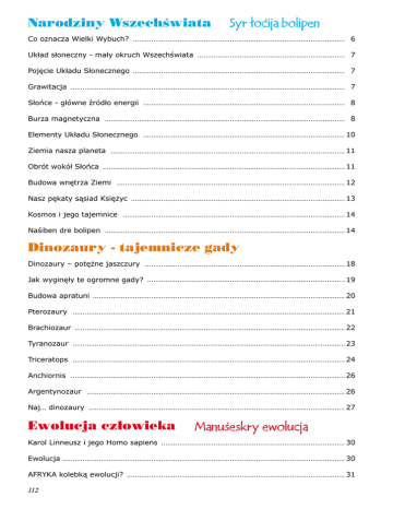Narodziny Wszechświata Syr łoćija bolipen Co oznacza Wielki Wybuch? ......................................................................................................... 6 Układ słoneczny - mały okruch Wszechświata ......................................................................... 7 Pojęcie Układu Słonecznego ......................................................................................................... 7 Grawitacja ........................................................................................................................................ 7 Słońce - główne źródło energii .................................................................................................... 8 Burza magnetyczna ....................................................................................................................... 8 Elementy Układu Słonecznego .................................................................................................... 10 Ziemia nasza planeta .................................................................................................................... 11 Obrót wokół Słońca ........................................................................................................................ 11 Budowa wnętrza Ziemi ................................................................................................................. 12 Nasz pękaty sąsiad Księżyc .......................................................................................................... 13 Kosmos i jego tajemnice .............................................................................................................. 14 Naśiben dre bolipen ....................................................................................................................... 14 Dinozaury - tajemnicze gady Dinozaury – potężne jaszczury ................................................................................................... 18 Jak wyginęły te ogromne gady? .................................................................................................. 19 Budowa apratuni ............................................................................................................................. 20 Pterozaury ....................................................................................................................................... 21 Brachiozaur ...................................................................................................................................... 22 Tyranozaur ....................................................................................................................................... 23 Triceratops ....................................................................................................................................... 24 Anchiornis ........................................................................................................................................ 26 Argentynozaur ................................................................................................................................ 26 Naj… dinozaury ............................................................................................................................... 27 Ewolucja człowieka Manuśeskry ewolucja Karol Linneusz i jego Homo sapiens ........................................................................................... 30 Ewolucja ............................................................................................................................................ 30 AFRYKA kolebką ewolucji? ............................................................................................................ 31 112 Australopitek ................................................................................................................................... 31 Homo habilis - najstarszy gatunek z rodzaju Homo ............................................................... 32 Homo erectus, czyli człowiek wyprostowany ........................................................................... 32 Poprzednik Homo sapiens – Neandertalczyk ........................................................................... 33 Człowiek współczesny (Homo sapiens) ..................................................................................... 35 Pozostałości po przodkach ........................................................................................................... 36 Cechy ludzkie gatunku Homo sapiens ....................................................................................... 37 Starożytne cywilizacje Phurane ćirytka ciwilizacji Starożytność ................................................................................................................................... 40 Cywilizacja ....................................................................................................................................... 41 Mezopotamia – żyzny półksiężyc ......................................................................................... 42 Sumerowie ...................................................................................................................................... 42 Wierzenia Sumerów ....................................................................................................................... 43 Państwo Hammurabiego .............................................................................................................. 43 Egipt darem Nilu ......................................................................................................................... 44 Faraon głową społeczeństwa egipskiego ................................................................................... 45 Tajemnica Tutenchamona ................................................................................