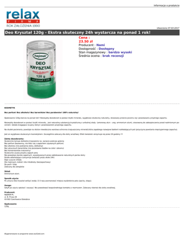 Informacje o produkcie Utworzono 07-03-2017 Deo Kryształ 120g - Ekstra skuteczny 24h wystarcza na ponad 1 rok! Cena : 23.50 zł Producent : Nami Dostępność : Dostępny Stan magazynowy : bardzo wysoki Średnia ocena : brak recenzji KOSMETYK Bez perfum! Bez alkoholu! Bez barwników! Bez parabenów! 100% naturalny! Opakowanie 120g starcza na ponad rok!! Niezwykły dezodorant w postaci bryłki minerału, wyjątkowo skuteczny naturalny, stosowany przeciw poceniu się i powstawaniu przykrego zapachu. Niezwykły dezodorant w postaci bryłki minerału, jest naturalną substancją krystaliczną z unikalnej skały (amonowy ałun – ang. ammonium alum), stosowaną do zabezpieczenia przed nadmiernym poceniem (działa ściągająco na pory skóry) i powstawaniem przykrego zapachu. Na skutek pocierania, powstaje na skórze niewidoczna warstwa ochronna (rozpuszczony minerał),która zapobiega rozwojowi bakterii rozkładających pot (przyczyna powstania nieprzyjemnego zapachu). Jest on wyjątkowo skutecznym kosmetykiem. Szczególnie zalecany dla skóry wrażliwej. Efekt świeżości utrzymuje się przez 24 godziny !!! Zalety dezodorantu: Skutecznie tamuje delikatne krwawienie np. zacięcie podczas golenia Bez perfum (bezwonny, nie kłóci się z zapachem używanych perfum) Bez alkoholu (nie podrażnia skóry, delikatny) Bez sztucznych barwników (nie pozostawia śladów na ciele i ubraniu) Bez konserwantów (naturalny) Skutecznie usuwa przykry zapach potu Nie powoduje stanów zapalnych, wywoływanych przez zablokowanie naturalnych porów skóry Działa odświeżająco (utrzymuje świeżość przez około 24h) Daje uczucie chłodu Dla mężczyzn, kobiet i dla młodzieży (bezzapachowy) Do pach i stóp Zalecany dla alergików Skład: Ammonium alum. Sposób użycia: Po umyciu Deo kryształ zwilżyć wodą i 2-3 razy posmarować miejsca wydzielania potu (pachy, stopy). Uwaga: Sztyft po użyciu opłukać i osuszyć. Nie powodować bezpośredniego kontaktu z marmurem. Zalecany również dla skóry wrażliwej. Producent: NAJMAR-PL ul. B. Prusa 28 43-502 Czechowice Dziedzice Opakowanie: 120g Wygenerowano w programie www.oscGold.com