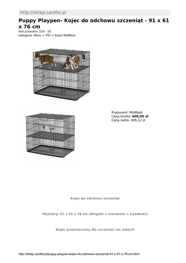 http://sklep.canifel.pl Puppy Playpen- Kojec do odchowu szczeniąt - 91 x 61 x 76 cm kod produktu: 224 - 10 kategoria: Menu > PSY > Kojce MidWest Producent: MidWest Cena brutto: 609,00 zł Cena netto: 495,12 zł Kojec do odchowu szczeniąt Wymiary: 61 x 91 x 76 cm (długość x szerokość x wysokość) Kojec przeznaczony dla szczeniąt ras małych http://sklep.canifel.pl/puppy-playpen-kojec-do-odchowu-szczeniat-91-x-61-x-76-cm.html Puppy Playpen 224-10 kojec wykonany z drutów o przekrojach od 2,3 mm do 3,26 mm, podwójnie niklowanych i chromowanych powierzchniowo podłoga wykonana z drutów o przekrojach od 3,26 mm do 5,9 mm, zabezpieczona i powlekana winylem o średnicy oczek 2,54 cm waga - 15 kg ilość bocznych drzwi - 1 szt 2 zamki w drzwiach otwierana w całości góra regulowana wysokość drucianej podłogi 1 mocna plastikowa podłoga, którą można swobodnie wysuwać do czyszczenia łatwe składanie umożliwia transport i przechowywanie kojca Kojce Puppy Playpen są zaprojektowane specjalnie dla szczeniąt. Zapewniają im bezpieczną oraz szeroką przestrzeń. Dają możliwość regulacji wysokości podłogi. Atrakcyjny srebrny kolor jest łatwy w utrzymaniu czystości. Boczne drzwiczki oraz szeroka otwierana góra zapewniają wygodny dostęp do szczeniąt. Druciana podłoga pokryta winylem zabezpiecza przed ślizganiem się łapek. Odpowiednio dobrana wielkość oczek w podłodze pozwala na łatwe utrzymanie czystości. Kojec posiada mocną plastikową podłogę łatwą do czyszczenia. http://sklep.canifel.pl/puppy-playpen-kojec-do-odchowu-szczeniat-91-x-61-x Wielkość oczka w podłodze: 2,54 x 2,54 cm Kojce dostępne są w trzech rozmiarach: Dedykowana podłoga: Plastikowa podłoga do kojca 224 PAN (Puppy Playpen 224 - 10) http://sklep.canifel.pl/puppy-playpen-kojec-do-odchowu-szczeniat-91-x-61-x-76-cm.html