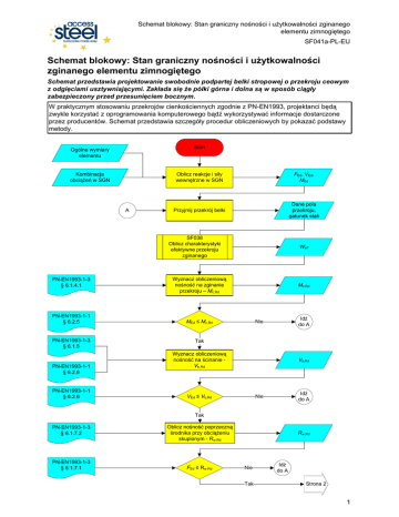 Schemat blokowy: Stan graniczny nośności i uŜytkowalności zginanego elementu zimnogiętego SF041a-PL-EU Schemat blokowy: Stan graniczny nośności i uŜytkowalności zginanego elementu zimnogiętego Schemat przedstawia projektowanie swobodnie podpartej belki stropowej o przekroju ceowym z odgięciami usztywniającymi. Zakłada się Ŝe półki górna i dolna są w sposób ciągły zabezpieczony przed przesunięciem bocznym. W praktycznym stosowaniu przekrojów cienkościennych zgodnie z PN-EN1993, projektanci będą zwykle korzystać z oprogramowania komputerowego bądź wykorzystywać informacje dostarczone przez producentów. Schemat przedstawia szczegóły procedur obliczeniowych by pokazać podstawy metody. Start Ogólne wymiary elementu Kombinacja obciąŜeń w SGN A Oblicz reakcje i siły wewnętrzne w SGN FEd, VEd, MEd Przyjmij przekrój belki Dane pola przekroju, gatunek stali SF038 Oblicz charakterystyki efektywne przekroju zginanego PN-EN1993-1-3 § 6.1.4.1 PN-EN1993-1-1 § 6.2.5 PN-EN1993-1-3 § 6.1.5 PN-EN1993-1-1 § 6.2.6 PN-EN1993-1-1 § 6.2.6 Weff Wyznacz obliczeniową nośność na zginanie przekroju – Mc,Rd Mc,Rd MEd ≤ Mc,Rd Idź do A Nie Tak Wyznacz obliczeniową nośność na ścinanie Vb,Rd Vb,Rd VEd ≤ Vb,Rd Idź do A Nie Tak PN-EN1993-1-3 § 6.1.7.2 PN-EN1993-1-3 § 6.1.7.1 Oblicz nośność poprzeczną środnika przy obciąŜeniu skupionym - Rw,Rd FEd ≤ Rw,Rd Rw,Rd Nie Tak Idź do A Strona 2 1 Schemat blokowy: Stan graniczny nośności i uŜytkowalności zginanego elementu zimnogiętego SF041a-PL-EU Stan graniczny nośności i uŜytkowalności zginanego elementu zimnogiętego (kontynuacja) Efektywny moment bezwładności Ific w SGN moŜe być interpolowany pomiędzy wartością odpowiadającą przekrojowi brutto i wartoścą otrzymaną w SGN zgodnie z PN-EN1993-1-3, §7.1(3) Strona 1 Rozpiętość elementu Oddziaływania na element w SGN Oblicz charakterystyki efektywnego przekroju zginanego w SGN Ific Oblicz maksymalne ugięcie w SGN ugięcie PN-EN1993-1-3 §7.1(3) PN-EN1993-1-1 §7.2.1 Ugięcie spełnia warunki ? Nie A Ugięcie graniczne powinno być określone przez klienta. Dodatek Krajowy moŜe określić niektóre wartości graniczne. Tak SN036 PN-EN1993-1-1 §7.2.3 Sprawdź kryterium drgań Drgania spełniają warunki ? Tak Koniec Nie A Odnośnie drgań Dodatek Krajowy moŜe określić częstotliwości graniczne 2 Schemat blokowy: Stan graniczny nośności i uŜytkowalności zginanego elementu zimnogiętego SF041a-PL-EU Quality Record RESOURCE Title Schemat blokowy: Stan graniczny nośności i uŜytkowalności zginanego elementu zimnogiętego Reference(s) ORIGINAL DOCUMENT Name Company Date Created by Viorel Ungureanu BRITT Ltd. Timisoara, RO Technical content checked by Dan Dubina BRITT Ltd. Timisoara, RO 1. UK G W Owens SCI 20/4/06 2. France A Bureau CTICM 20/4/06 3. Sweden B Uppfeldt SBI 11/4/06 4. Germany C Müller RWTH 11/4/06 5. Spain J Chica Labein 20/4/06 G W Owens SCI 15/8/06 Editorial content checked by Technical content endorsed by the following STEEL Partners: Resource approved by Technical Coordinator 3 Schemat blokowy: Stan graniczny nośności i uŜytkowalności zginanego elementu zimnogiętego SF039a-EN-EU Wrapper Information Title Schemat blokowy: Stan graniczny nośności i uŜytkowalności zginanego elementu zimnogiętego Series Description Schemat przedstawia projektowanie swobodnie podpartej belki stropowej o przekroju ceowym z odgięciami usztywniającymi. Zakłada się Ŝe półki górna i dolna są w sposób ciągły zabezpieczony przed przesunięciem bocznym. Access Level Expertise Practitioner Identifiers Filename SF041a-PL-EU.vsd Resource Type Schemat blokowy Viewpoint Engineer Subject Application Area(s) Budynki mieszkalne Dates Created Date 15/03/2004 Last Modified Date 24/03/2006 Checked Date 24/03/2006 Format Category Valid From Valid To Languages Contacts English Author Viorel Ungureanu, BRITT Ltd. Timisoara, RO Checked By Dan Dubina, BRITT Ltd. Timisoara, RO Approved By Editor Keywords See Also Last Modified By Ultimate limit state, serviceability limit state,elements in bending, cold-formed steel products, bending resistance, structural response Eurocode Reference Worked Examples Commentary Discussion Other Coverage National Applicability EU Special Instructions 4