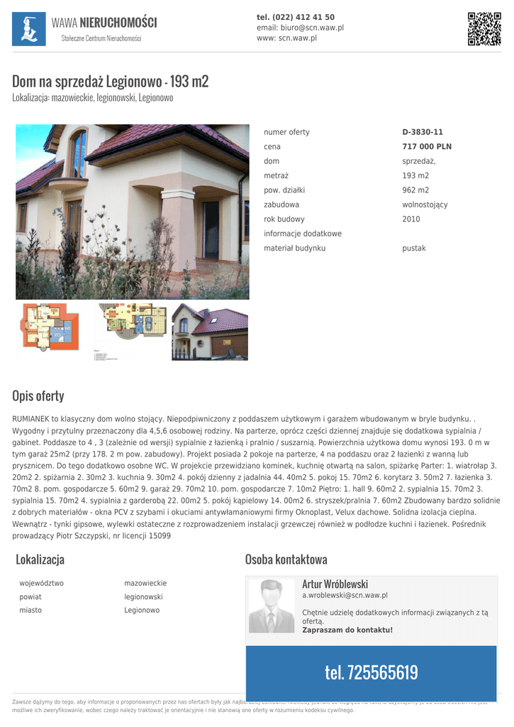 tel. (022) 412 41 50 email: [email protected] www: scn.waw.pl Dom na sprzedaż Legionowo - 193 m2 Lokalizacja: mazowieckie, legionowski, Legionowo numer oferty D-3830-11 cena 717 000 PLN dom sprzedaż, metraż 193 m2 pow. działki 962 m2 zabudowa wolnostojący rok budowy 2010 informacje dodatkowe materiał budynku pustak Opis oferty RUMIANEK to klasyczny dom wolno stojący. Niepodpiwniczony z poddaszem użytkowym i garażem wbudowanym w bryle budynku. . Wygodny i przytulny przeznaczony dla 4,5,6 osobowej rodziny. Na parterze, oprócz części dziennej znajduje się dodatkowa sypialnia / gabinet. Poddasze to 4 , 3 (zależnie od wersji) sypialnie z łazienką i pralnio / suszarnią. Powierzchnia użytkowa domu wynosi 193. 0 m w tym garaż 25m2 (przy 178. 2 m pow. zabudowy). Projekt posiada 2 pokoje na parterze, 4 na poddaszu oraz 2 łazienki z wanną lub prysznicem. Do tego dodatkowo osobne WC. W projekcie przewidziano kominek, kuchnię otwartą na salon, spiżarkę Parter: 1. wiatrołap 3. 20m2 2. spiżarnia 2. 30m2 3. kuchnia 9. 30m2 4. pokój dzienny z jadalnia 44. 40m2 5. pokoj 15. 70m2 6. korytarz 3. 50m2 7. łazienka 3. 70m2 8. pom. gospodarcze 5. 60m2 9. garaż 29. 70m2 10. pom. gospodarcze 7. 10m2 Piętro: 1. hall 9. 60m2 2. sypialnia 15. 70m2 3. sypialnia 15. 70m2 4. sypialnia z garderobą 22. 00m2 5. pokój kąpielowy 14. 00m2 6. stryszek/pralnia 7. 60m2 Zbudowany bardzo solidnie z dobrych materiałów - okna PCV z szybami i okuciami antywłamaniowymi firmy Oknoplast, Velux dachowe. Solidna izolacja cieplna. Wewnątrz - tynki gipsowe, wylewki ostateczne z rozprowadzeniem instalacji grzewczej również w podłodze kuchni i łazienek. Pośrednik prowadzący Piotr Szczypski, nr licencji 15099 Lokalizacja Osoba kontaktowa Artur Wróblewski województwo mazowieckie powiat legionowski [email protected] miasto Legionowo Chętnie udzielę dodatkowych informacji związanych z tą ofertą. Zapraszam do kontaktu! tel. 725565619 Zawsze dążymy do tego, aby informacje o proponowanych przez nas ofertach były jak najbardziej dokładne. Niekiedy jednak, ze względu na fakt, iż uzyskujemy je od osób trzecich nie jest możliwe ich zweryfikowanie, wobec czego należy traktować je orientacyjnie i nie stanowią one oferty w rozumieniu kodeksu cywilnego.