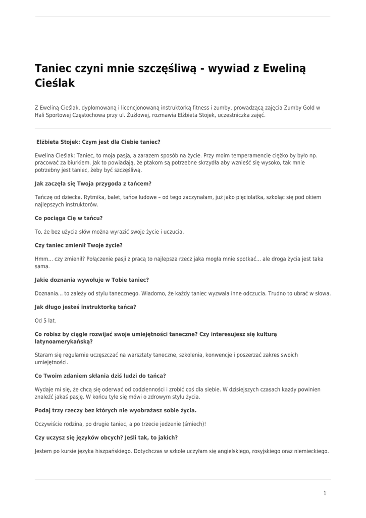 Taniec czyni mnie szczęśliwą - wywiad z Eweliną Cieślak Z Eweliną Cieślak, dyplomowaną i licencjonowaną instruktorką fitness i zumby, prowadzącą zajęcia Zumby Gold w Hali Sportowej Częstochowa przy ul. Żużlowej, rozmawia Elżbieta Stojek, uczestniczka zajęć. Elżbieta Stojek: Czym jest dla Ciebie taniec? Ewelina Cieślak: Taniec, to moja pasja, a zarazem sposób na życie. Przy moim temperamencie ciężko by było np. pracować za biurkiem. Jak to powiadają, że ptakom są potrzebne skrzydła aby wznieść się wysoko, tak mnie potrzebny jest taniec, żeby być szczęśliwą. Jak zaczęła się Twoja przygoda z tańcem? Tańczę od dziecka. Rytmika, balet, tańce ludowe – od tego zaczynałam, już jako pięciolatka, szkoląc się pod okiem najlepszych instruktorów. Co pociąga Cię w tańcu? To, że bez użycia słów można wyrazić swoje życie i uczucia. Czy taniec zmienił Twoje życie? Hmm... czy zmienił? Połączenie pasji z pracą to najlepsza rzecz jaka mogła mnie spotkać... ale droga życia jest taka sama. Jakie doznania wywołuje w Tobie taniec? Doznania... to zależy od stylu tanecznego. Wiadomo, że każdy taniec wyzwala inne odczucia. Trudno to ubrać w słowa. Jak długo jesteś instruktorką tańca? Od 5 lat. Co robisz by ciągle rozwijać swoje umiejętności taneczne? Czy interesujesz się kulturą latynoamerykańską? Staram się regularnie uczęszczać na warsztaty taneczne, szkolenia, konwencje i poszerzać zakres swoich umiejętności. Co Twoim zdaniem skłania dziś ludzi do tańca? Wydaje mi się, że chcą się oderwać od codzienności i zrobić coś dla siebie. W dzisiejszych czasach każdy powinien znaleźć jakaś pasję. W końcu tyle się mówi o zdrowym stylu życia. Podaj trzy rzeczy bez których nie wyobrażasz sobie życia. Oczywiście rodzina, po drugie taniec, a po trzecie jedzenie (śmiech)! Czy uczysz się języków obcych? Jeśli tak, to jakich? Jestem po kursie języka hiszpańskiego. Dotychczas w szkole uczyłam się angielskiego, rosyjskiego oraz niemieckiego. 1 Do jakich krajów podróżowałaś w celu podnoszenia kwalifikacji? Tak naprawdę to najwięcej podróżowałam po Polsce, ponieważ nie zawsze miałam czas na wyjazdy zagraniczne, albo najzwyczajniej w świecie, nie miałam na nie funduszy. Jakiej cechy u ludzi nie znosisz? Najbardziej to chyba zazdrości. Każdy indywidualnie kieruje swoim życiem, więc cieszmy się z tego, co mamy. Czy wierzysz, że marzenia się spełniają? W 100% tak! Sama po sobie wiem, że z tańcem przygoda nie była łatwa, bo jak to mówią, sport to zdrowie... Miałam kontuzję kręgosłupa i myślałam, że dalsza praca w tym zawodzie nie będzie możliwa, lecz los chciał, żebym jednak mogła spełniać swoje pasje i dzisiaj jestem tu z Wami i prowadzę zajęcia. Kto jest dla Ciebie autorytetem? Nie mam jednego faworyta. Są różne style taneczne i każdy na swój sposób mi imponuje. Dziękuję za rozmowę i życzę dalszych sukcesów. 2