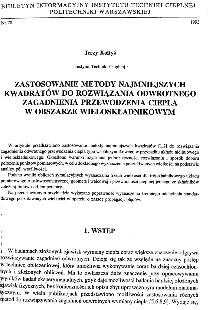 BIULETYN INFORMACYJNY INSTYTUTU TECHNIKI CIEPLNEJ POLITECHNIKI WARSZAWSKIEJ Nr 78 1993 Jerzy Koftyś Instytut Techniki Cieplnej · ZASTOSOWANIE METODY NAJMNIEJSZYCH KWADRATÓW DO ROZWIĄZANIA ODWROTNEGO ZAGADNIENIA PRZEWODZENIA CIEPŁA W OBSZARZE WIELOSKŁADNIKOWYM W artykule przedstawiono zastosowanie metody najmniejszych kwadratów [1,2] do rozwiązania zagadnienia odwrotnego przewodzenia ciepła typu współczynnikowego w przypadku układu nieliniowego i wieloskładnikowego. Określono warunki uzyskania jednoznaczności rozwiązania i sposób doboru położenia punktów pomiarowych, w celu dokładnego wyznaczenia poszukiwanych wielkości na podstawie analizy pól wrażliwości. Podano wyniki obliczeń symulacyjnych wyznaczania trzech wielkości dla trójskładnikowego układu pomiarowego o osiowosymetrycznej geometrii walcowej i przewodności cieplnej jednego ze składników zależnej liniowo od temperatury. Na przedstawionym przykładzie wykazano poprawność wyznaczenia średniego odchylenia standardowego poszukiwanych wielkości w oparciu o zasadę propagacji błędów. 1. WSTĘP \ i W badaniach złożonych zjawisk wymiany ciepła coraz większe znaczenie odgrywa iozwiązywanie zagadnień odwrotnych. Dzieje się tak ze względu na znaczny postęp ψ technice obliczeniowej, która umożliwia wykonywanie coraz bardziej czasochłonnych i złożonych obliczeń. Ma to zwłaszcza duże znaczenie przy opracowywaniu wyników badań eksperymentalnych, gdyż daje możliwości badania bardziej złożonych |jawisk fizycznych, bez konieczności ich opisu zbyt uproszczonym modelem matemal^cznym. W wielu publikacjach przedstawiono możliwości zastosowania różnych thetod do rozwiązywania zagadnień odwrotnych wymiany ciepła [5,6,8,9]. Wydaje się, Jerzy Kołtyś 5 38 że najbardziej efektywną w rozwiązywaniu zagadnień odwrotnych typu współczynmkowego może być metoda najmniejszych kwadratów, stosowana często do wyznaczania współczynników równań empirycznych i przedstawiona w [1, 2]. Metoda ta może okazać się przydatna wtedy, gdy poszukuje się niewielu zmiennych, a funkcja mmi określona wymaga złożonych i czasochłonnych obliczeń. Dotyczy to także pola temperatury wyznaczonego numerycznie w złożonym wieloskładnikowym obszarze. Pole w takim obszarze jest opisane złożoną funkcją analityczną albo wyznaczane metodą numeryczną zależną od właściwości cieplnych układu i warunków brzegowych Przyjmuje się, że niektóre wielkości służące do wyznaczania wartości temperatury są znane tylko z pewną dokładnością i ich wyznaczanie będzie celem rozwiązania zagadnienia odwrotnego. Celem zadania będzie również wskazanie miejsc pomiaru temperatury w badanym obszarze, aby rozwiązanie zadania było możliwe z największą dokładnością na jaką pozwalają pomiary temperatury. Zakłada się przy tym, ze pomiary temperatury są niezależne i mają to samo odchylenie standardowe. W takiro przypadku jak to wykazano w [1], możliwe jest również oszacowanie dokładność, wyznaczania poszukiwanych wielkości tą metodą jako funkcji dokładności pomiar« temperatury. 2. SFORMUŁOWANIE ZAGADNIENIA ODWROTNEGO Rozpatruje się układ pomiarowy, dla którego pole temperatury można przybliży) w pewnym obszarze funkcją Τ = Τ (χ,ρ) ( 1 gdzie χ - jest wektorem przestrzeni, a ρ - wektorem wielkości poszukiwanycl znanych tylko jako wartości wstępnie oszacowane wektorem p°. Wektor ρ jes wektorem N-wymiarowym. Funkcja Τ zależy też od pewnego zbioru wartość, znanych, które można wyznaczyć na tyle dokładnie, aby nie miało to wpływu η otrzymane wyniki. . _ _ Zakłada się, że w Μ punktach układu mierzona jest temperatura (i - i oraz w tych samych punktach można wyznaczyć wartość funkcji (1) jako Tt = T(xvp) Temperatury tworzą M-wymiarowe wektory kolumnowe: Tz — temperatur zmierzonych, Τ — temperatur obliczonych ze wzoru (1), , • Zastosowanie metody najmniejszych kwadratów do rozwiązania odwrotnego zagadnienia... 39 przy czym Μ г N. Funkcja Τ może być nieliniowa, ale przyjmuje się, że we wszystkich punktach w pewnym otoczeniu wektora p° daje się ją przybliżyć pierwszym rozwinięciem w szereg Taylora jako: N Τ^χ,,ρ) = Τ(Χί,ρ°)+Σ Pj-Pj°) (2) 7 = 1 °Pj Celem zadania jest poszukiwanie takich wartości wektora p , aby moduł wektora niezgodności temperatur zmierzonych i obliczonych osiągnął minimum, tzn. |w I = I Γ ζ - T | =»· miń (3) 3. ROZWIĄZANIE ZAGADNIENIA ODWROTNEGO Należy założyć, że poszukiwane rozwiązanie znajduje się w na tyle bliskim otoczeniu wektora p°, aby wektor temperatury można było przybliżyć wzorem (2) zapisanym w postaci macierzowej jako Τ = T° + B v (4) gdzie: v jest wektorem poprawek dla wektora ρ , В - macierzą o składowych: ^ 3T. (5) Wektor niezgodności temperatur można przedstawić jako w = Tz-T = Tz-T°~Bv = w°-Bv gdzie w° jest początkowym wektorem niezgodności. Aby wyznaczyć wektor poprawek należy wykonać minimalizację funkcjonału: F = (w0-Bv)r(w°-Bv) (6) =W tym celu należy rozwiązać równanie ? = -2BV-Bv)=0 dv (7) skąd otrzymuje się układ równań: ) i rozwiązanie: (BTB) ν = B r w ° (8) 40 Jerzy Kołtyś 5 v = (BrB)"1Brw° W Podobny sposób postępowania zastosowano w [1, 2, 7] przy wyznaczaniu współczynników wzoru empirycznego. Tutaj założono dodatkowo, że pomiary wszystkich temperatur mają to samo odchylenie standardowe AT. Nowy wektor poszukiwanych wielkości ρ będzie wyznaczony jako W przypadkach nieliniowych procedurę należy powtarzać w celu znalezienia kolejnych przybliżeń wektora p. 4. SZACOWANIE BŁĘDÓW WYZNACZANYCH WIELKOŚCI i 1 Jak przedstawiono w [1], dla poszukiwanego wektora ρ ze względu na przyjęte j wyżej założenia macierz kowariancji można przedstawić jako ] G p = Δ Γ 2 ( Β γ Β ) " χ = ΑΤ2Ό ' Błędy pomiarowe składowych wektora ρ można szacować następująco: APj = AT få gdzie djj są 