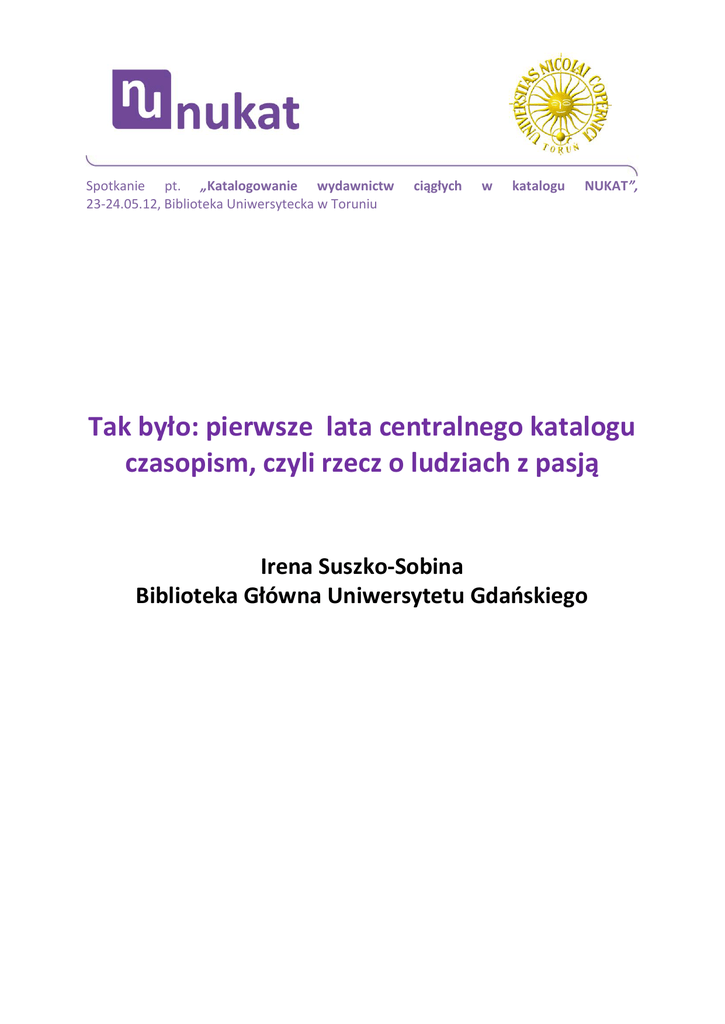 Spotkanie pt. „Katalogowanie wydawnictw 23-24.05.12, Biblioteka Uniwersytecka w Toruniu ciągłych w katalogu NUKAT”, Tak było: pierwsze lata centralnego katalogu czasopism, czyli rzecz o ludziach z pasją Irena Suszko-Sobina Biblioteka Główna Uniwersytetu Gdaoskiego Z perspektywy katalogu NUKAT w 2012 roku, który tworzy ponad 100 bibliotek, a liczba czasopism osiągnęła ponad 75 tysięcy rekordów, mało znaczące mogą wydawad się doświadczenia z pierwszego etapu powstawania centralnego katalogu czasopism, jednak zawsze warto pamiętad o ludziach. Kiedy w 2002 roku baza CKTCZ migrowała do katalogu NUKAT, było w niej ponad 20 tysięcy rekordów bibliograficznych czasopism. W opinii Ani Paluszkiewicz przekazana baza była „czysta” (co oznaczało pełną zgodnośd rekordów bibliograficznych z rekordami haseł wzorcowych oraz spójnośd i prawidłowe powiązania między rekordami bibliograficznymi), była to wysoka ocena pracy wszystkich, którzy tworzyli ten katalog. O centralnym katalogu czasopism jest kilka wcześniejszych publikacji, dlatego dzisiejsza wypowiedź będzie miała charakter subiektywnego wspomnienia tylko niektórych problemów. Moim zadaniem jest opisad w tym referacie, jak powstawał zespół, który uczył się nowych treści i form współpracy, który także przyczyniał się do powstawania nowych dla bibliotek zasad i procedur zdalnego budowania katalogu centralnego. Nie uniknę osobistego tonu opowiadając o sprawach i ludziach, z którymi miałam kontakt w tych latach. Jak to się zaczęło? Grupa bibliotek akademickich po uzyskaniu w 1992 roku grantów, zapewniających podstawy finansowe projektu i po wyborze zintegrowanego systemu VTLS, zapoczątkowała ścisłą i skoordynowaną współpracę od rozpoczęcia budowy Centralnej Kartoteki Haseł Wzorcowych, jako kluczowej części planowanego narodowego katalogu zbiorów bibliotecznych. Na drodze tak zarysowanego wspólnego celu piętrzyły się różnego rodzaju zewnętrzne i wewnętrzne trudności, których nie będę w tym miejscu opisywad, faktem jest, że w początkowej fazie biblioteki tworzyły wspólnie kartotekę CKHW, natomiast każda z bibliotek uczestniczących w projekcie budowała swój własny katalog oddzielnie. Lokalne katalogi korzystały z szybko powstających wspólnych zasobów CKHW, jednak w tym czasie idea centralnego katalogu zbiorów wydawała się dośd odległa. Nie mogąc przekonad środowiska do rozpoczęcia budowy jednego dla Polski katalogu książek, Zespół Koordynacyjny ds. VTLS uznał za celowe podjęcie próby stworzenia centralnego katalogu czasopism. W grudniu 1994 na posiedzeniu dyrektorów bibliotek i Zespołu Koordynacyjnego VTLS sformułowano koncepcję zlokalizowania tego katalogu w Bibliotece Głównej Uniwersytetu Gdaoskiego (jednym z czynników był wolny obszar w clas02 serwera biblioteki), rzecznikami tej idei byli: Ania Paluszkiewicz i Jurand Czermioski. Lokalizacja bazy budziła pewne kontrowersje, gdyż wśród bibliotek konsorcjum VTLS były biblioteki o większym i bardziej znaczącym zbiorze czasopism, jednak z perspektywy lat okazała się korzystnym wyborem. W imieniu Biblioteki Głównej UG decyzję o przyjęciu zadania podjęła dyrektor Biblioteki, dr Jadwiga Łuszczyoska, a koordynatorem projektu została Irena SuszkoSobina. Już na początku marca 1995 r. odbyła się pierwsza narada przedstawicieli pięciu bibliotek, zainteresowanych tworzeniem wspólnego katalogu czasopism, na której przyjęto pierwsze ustalenia merytoryczne, organizacyjne i techniczne. Moment startu okazał się bardzo ważny dla stworzenia od początku właściwych relacji między bibliotekami i konkretnymi osobami, podejmującymi się pionierskiego zadania, dlatego poświęcę temu wydarzeniu trochę czasu. W siedzibie Biblioteki Głównej Uniwersytetu Gdaoskiego w Sopocie, w obecności dyr. Jadwigi Łuszczyoskiej, przewodniczącego Zespołu Koordynacyjnego Bibliotek VTLS Juranda Czermioskiego i Ani Paluszkiewicz, sekretarza tegoż Zespołu i jednocześnie przedstawicielki CKHW, spotkali się przedstawiciele pięciu bibliotek : Barbara Nałęcz – Biblioteka Uniwersytecka w Warszawie, Elżbieta Burakowska-Niezgoda – Biblioteka Jagiellooska, Ewa Postawa – Biblioteka Główna AGH w Krakowie, Jadwiga Łukaszewicz (po jej przejściu na stanowisko bibliotekarza systemowego przejęła obowiązki Ewa Grabarska) – Biblioteka Uniwersytetu Wrocławskiego, Irena Krause (gdy awansowała na dyr. Biblioteki WSM w Gdyni jej obowiązki przejęła Krystyna Kreczko) i Irena Suszko-Sobina – Biblioteka Główna Uniwersytetu Gdaoskiego. Przyjętym do realizacji zadaniem było budowanie centralnego katalogu czasopism poprzez tworzenie w trybie online rekordów bibliograficznych dla poszczególnych tytułów czasopism z wykorzystaniem istniejących w CKHW rekordów khw (lub wcześniejszym ich utworzeniem). Jednostką opisu w rekordzie bibliograficznym było czasopismo jako całośd, jako cały tytuł, rekord powstawad miał z autopsji na podstawie pierwszego numeru czasopisma, pozostawiono opis posiadanych przez biblioteki zasobów (poszczególnych roczników, numerów) jako późniejsze zadanie dla lokalnych katalogów. Opisy bibliograficzne czasopism postanowiono tworzyd bez charakterystyki rzeczowej, gdyż w tym czasie biblioteki nie miały możliwości podjęcia tego zadania. Zupełnie nowym rozwiązaniem organizacyjnym była decentralizacja merytorycznej odpowiedzialności za tworzone rekordy, co wynikało głównie ze specyfiki czasopism (w bibliotekach były tytuły z różnych dziedzin wiedzy, BG UG nie rościła sobie prawa wyrokowania o poprawności opisu, nie mając w wielu wypadkach dostępu do danego tytułu lub pierwszego numeru).W każdej bibliotece osoby katalogujące czasopisma miały status CAT (bez uprawnieo do zatwierdzania rekordów), natomiast przedstawiciel biblioteki wyznaczony przez jej dyrektora otrzymywał status ADMIN (jako specjalista w zakresie o