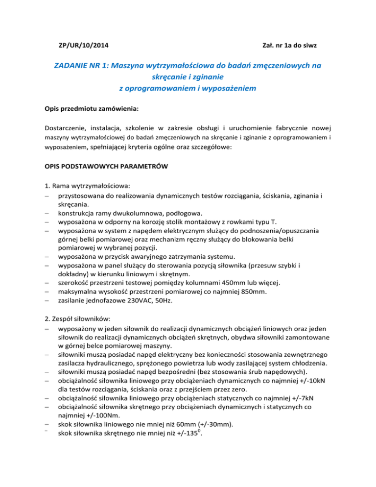 ZP/UR/10/2014 Zał. nr 1a do siwz ZADANIE NR 1: Maszyna wytrzymałościowa do badań zmęczeniowych na skręcanie i zginanie z oprogramowaniem i wyposażeniem Opis przedmiotu zamówienia: Dostarczenie, instalacja, szkolenie w zakresie obsługi i uruchomienie fabrycznie nowej maszyny wytrzymałościowej do badań zmęczeniowych na skręcanie i zginanie z oprogramowaniem i wyposażeniem, spełniającej kryteria ogólne oraz szczegółowe: OPIS PODSTAWOWYCH PARAMETRÓW 1. Rama wytrzymałościowa: przystosowana do realizowania dynamicznych testów rozciągania, ściskania, zginania i skręcania. konstrukcja ramy dwukolumnowa, podłogowa. wyposażona w odporny na korozję stolik montażowy z rowkami typu T. wyposażona w system z napędem elektrycznym służący do podnoszenia/opuszczania górnej belki pomiarowej oraz mechanizm ręczny służący do blokowania belki pomiarowej w wybranej pozycji. wyposażona w przycisk awaryjnego zatrzymania systemu. wyposażona w panel służący do sterowania pozycją siłownika (przesuw szybki i dokładny) w kierunku liniowym i skrętnym. szerokość przestrzeni testowej pomiędzy kolumnami 450mm lub więcej. maksymalna wysokość przestrzeni pomiarowej co najmniej 850mm. zasilanie jednofazowe 230VAC, 50Hz. 2. Zespół siłowników: wyposażony w jeden siłownik do realizacji dynamicznych obciążeń liniowych oraz jeden siłownik do realizacji dynamicznych obciążeń skrętnych, obydwa siłowniki zamontowane w górnej belce pomiarowej maszyny. siłowniki muszą posiadać napęd elektryczny bez konieczności stosowania zewnętrznego zasilacza hydraulicznego, sprężonego powietrza lub wody zasilającej system chłodzenia. siłowniki muszą posiadać napęd bezpośredni (bez stosowania śrub napędowych). obciążalność siłownika liniowego przy obciążeniach dynamicznych co najmniej +/-10kN dla testów rozciągania, ściskania oraz z przejściem przez zero. obciążalność siłownika liniowego przy obciążeniach statycznych co najmniej +/-7kN obciążalność siłownika skrętnego przy obciążeniach dynamicznych i statycznych co najmniej +/-100Nm. skok siłownika liniowego nie mniej niż 60mm (+/-30mm). skok siłownika skrętnego nie mniej niż +/-1350. realizacja obciążeń rotacyjnych, minimum 15 obrotów w każdą stronę. siłownik liniowy wyposażony w enkoder optyczny o rozdzielczości co najmniej 1 mikron (sterowanie przemieszczeniem siłownika). siłownik skrętny wyposażony w enkoder optyczny służący do sterowania przemieszczeniem w osi skrętnej. maksymalna częstotliwość ze skokiem siłownika ±1mm i obciążeniem 5kN co najmniej 40Hz. 3. Głowica pomiarowa siły mierząca obciążenia osiowo-skrętne: obciążalność osiowa: +/-10kN. obciążalność skrętna: +/-100Nm. głowica musi posiadać jeden czujnik przyspieszeń zamontowany w osi obciążenia oraz przynajmniej jeden czujnik przyspieszeń zamocowany w osi skrętnej; czujniki te mają służyć do eliminacji inercji powstałych od mas uchwytów podczas testów cyklicznych w czasie rzeczywistym. odporność głowicy na przeciążenia minimum 300%. klasa dokładności głowicy pomiarowej siły 0,5 wg ISO 7500-1 w zakresie przynajmniej od 100N do 10kN. 4. Cyfrowa elektronika sterująco-pomiarowa: posiada cztery standardowe kanały pomiarowo-sterujące: pozycja liniowa, pozycja obrotowa, siła oraz moment obrotowy; kanały te muszą posiadać 19-bitową rozdzielczość przy minimalnej szerokości pasma 1kHz, w całym zakresie przetwornika. dodatkowa karta kanału pomiarowo-sterującego umożliwiająca podłączenie ekstensometru (sterowanie w zamkniętym obwodzie regulacji). funkcja automatycznego rozpoznawania i kalibracji dostarczonych z maszyną przetworników pomiarowych. kontroler musi posiadać co najmniej dwa wejścia analogowe (podłączenie sygnałów z urządzeń zewnętrznych) oraz co najmniej cztery wyjścia analogowe. 5. Komora temperaturowa: zakres uzyskiwanych temperatur co najmniej od -1000C do 3500C. wyposażona w układ chłodzenia z wykorzystaniem LN2. powinna gabarytowo zmieścić się w przestrzeni roboczej maszyny i posiadać wymiary wewnętrzne co najmniej: wysokość 480mm, szerokość 240mm, głębokość 230mm. powinna posiadać specjalne demontowane kliny, umożliwiające odsunięcie komory z przestrzeni pomiarowej bez demontażu łańcucha pomiarowego. układ zapobiegający osadzaniu się pary na szybie komory. drzwi komory z trójwarstwowym szklanym oknem o wymiarach nie mniejszych niż: wysokość 350mm, szerokość 120mm. komora mocowana na specjalnej prowadnicy wózkowej, umożliwiającej jej łatwe wysunięcie z przestrzeni pomiarowej. podłączenie do komputera poprzez port USB (sterowanie przebiegiem temperatury z poziomu oprogramowania maszyny). 6. Uchwyty mechaniczne do realizacji obciążeń osiowo-skrętnych: zakres temperatur pracy co najmniej od -700C do 3500C. obciążalność osiowa: +/-10kN. obciążalność skrętna: +/-100Nm. pozwalające na wykonywanie testów rozciągania, ściskania, skręcania oraz testów dynamicznych z przejściem przez zero. wkładki do uchwytów pozwalające na zamocowanie próbek płaskich o szerokości 25mm oraz zakresie grubości co najmniej od 0 do 12mm wkładki do uchwytów pozwalające na zamocowanie próbek okrągłych o zakresie średnic co najmniej od 3mm do 12mm cięgna pośredniczące umożliwiające montaż uchwytów w komorze temperaturowej 7. Ekstensometr mechaniczny: zakres temperatur pracy co najmniej od -800C do 2000C zestaw ramion ekstensometru umożliwiający konfigurację dwóch baz pomiarowych: 25mm oraz 50mm zakres mierzonych odkształceń nie mniej niż: +12mm, -2mm 8. Uchwyt do testów zginania 3-punktowego: realizacja obciążeń dynamicznych i statycznych. obciążalność 10kN. zakres temperatur pracy co najmniej od -1000C do 3500C. maksymalny rozstaw podpór co najmniej 170mm. kowadła o średnicy 10mm. zestaw cięgien pośredniczących pozwalających na montaż uchwytu do testó