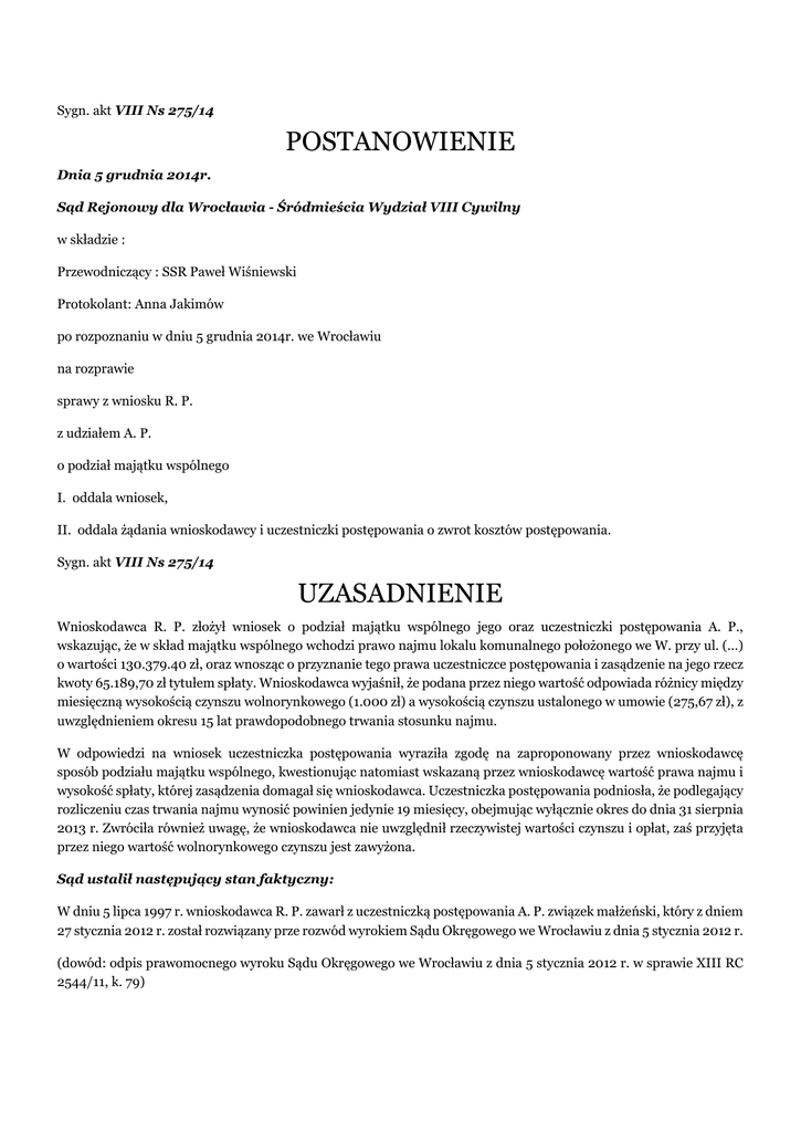 Sygn. akt VIII Ns 275/14 POSTANOWIENIE Dnia 5 grudnia 2014r. Sąd Rejonowy dla Wrocławia - Śródmieścia Wydział VIII Cywilny w składzie : Przewodniczący : SSR Paweł Wiśniewski Protokolant: Anna Jakimów po rozpoznaniu w dniu 5 grudnia 2014r. we Wrocławiu na rozprawie sprawy z wniosku R. P. z udziałem A. P. o podział majątku wspólnego I. oddala wniosek, II. oddala żądania wnioskodawcy i uczestniczki postępowania o zwrot kosztów postępowania. Sygn. akt VIII Ns 275/14 UZASADNIENIE Wnioskodawca R. P. złożył wniosek o podział majątku wspólnego jego oraz uczestniczki postępowania A. P., wskazując, że w skład majątku wspólnego wchodzi prawo najmu lokalu komunalnego położonego we W. przy ul. (...) o wartości 130.379.40 zł, oraz wnosząc o przyznanie tego prawa uczestniczce postępowania i zasądzenie na jego rzecz kwoty 65.189,70 zł tytułem spłaty. Wnioskodawca wyjaśnił, że podana przez niego wartość odpowiada różnicy między miesięczną wysokością czynszu wolnorynkowego (1.000 zł) a wysokością czynszu ustalonego w umowie (275,67 zł), z uwzględnieniem okresu 15 lat prawdopodobnego trwania stosunku najmu. W odpowiedzi na wniosek uczestniczka postępowania wyraziła zgodę na zaproponowany przez wnioskodawcę sposób podziału majątku wspólnego, kwestionując natomiast wskazaną przez wnioskodawcę wartość prawa najmu i wysokość spłaty, której zasądzenia domagał się wnioskodawca. Uczestniczka postępowania podniosła, że podlegający rozliczeniu czas trwania najmu wynosić powinien jedynie 19 miesięcy, obejmując wyłącznie okres do dnia 31 sierpnia 2013 r. Zwróciła również uwagę, że wnioskodawca nie uwzględnił rzeczywistej wartości czynszu i opłat, zaś przyjęta przez niego wartość wolnorynkowego czynszu jest zawyżona. Sąd ustalił następujący stan faktyczny: W dniu 5 lipca 1997 r. wnioskodawca R. P. zawarł z uczestniczką postępowania A. P. związek małżeński, który z dniem 27 stycznia 2012 r. został rozwiązany prze rozwód wyrokiem Sądu Okręgowego we Wrocławiu z dnia 5 stycznia 2012 r. (dowód: odpis prawomocnego wyroku Sądu Okręgowego we Wrocławiu z dnia 5 stycznia 2012 r. w sprawie XIII RC 2544/11, k. 79) W trakcie trwania związku małżeńskiego, w dniu 24 stycznia 2007 r., wnioskodawca i uczestniczka postępowania (jako najemcy) zawarli z Gminą W. (jako wynajmującą) umowę najmu lokalu mieszkalnego położonego we W. przy ul. (...) na czas nieoznaczony. Zgodnie z umową, najemca mógł wypowiedzieć najem na 3 miesiące naprzód, na koniec miesiąca kalendarzowego. (dowód: umowa najmu, k. 109-113) Po uprawomocnieniu się wyroku Sądu Okręgowego we Wrocławiu z dnia 5 stycznia 2012 r. wnioskodawca oświadczył Gminie W., że wypowiada umowę najmu opisanego powyżej lokalu mieszkalnego, ze skutkiem prawnym na dzień 31 sierpnia 2013 r. (bezsporne) W dniu 13 marca 2014 r. Gmina W. zawarła z uczestniczką postępowania umowę sprzedaży i użytkowania wieczystego, na podstawie której Gmina W. ustanowiła odrębną własność samodzielnego lokalu mieszkalnego przy ul. (...) we W. i sprzedała uczestniczce postępowania prawo własności opisanego lokalu wraz z udziałem w częściach wspólnych budynku i urządzeń, które nie służą wyłącznie do użytku właścicieli lokali. (dowód: - zawiadomienie o przeznaczeniu nieruchomości do zbycia, k. 117-118, - informacja dla nabywcy lokalu mieszkalnego, k. 119, - umowa sprzedaży i użytkowania wieczystego, k. 120-126) Sąd zważył, co następuje: Wniosek nie zasługiwał na uwzględnienie. Z chwilą zawarcia małżeństwa przez uczestników postępowania powstała między nimi z mocy ustawy wspólność majątkowa obejmująca ich dorobek (art. 31 k.r.o. w pierwotnym brzmieniu obowiązującym do dnia 20 stycznia 2005 r.). Każdy z małżonków mógł żądać dokonania podziału majątku wspólnego dopiero po ustaniu wspólności ustawowej (zob. art. 35 k.r.o.), a więc po prawomocnym rozwiązaniu małżeństwa przez rozwód. Wniosek złożony w niniejszej sprawie podlegał jednak oddaleniu ze względu na brak składników majątkowych mogących podlegać podziałowi. Podział majątku wspólnego może bowiem dotyczyć jedynie tych składników, które należały do tego majątku w chwili ustania wspólności ustawowej i istnieją nadal w momencie dokonywania podziału (por. uzasadnienie uchwały Sądu Najwyższego z dnia 19 maja 1989 r., III CZP 52/89, OSNCP 1990/4-5/60; uzasadnienie postanowienia Sądu Najwyższego z 7 kwietnia 1994 r., III CZP 41/94, Lex nr 9107; uzasadnienie postanowienia Sądu Najwyższego z dnia 4 listopada 1999 r., II CKN 523/98, LEX nr 737256; uzasadnienie postanowienia Sądu Najwyższego z dnia 31 stycznia 2013 r., II CSK 349/12, LEX nr 1314384). W niniejszej sprawie nie budzi zaś wątpliwości, że wchodzące w skład majątku wspólnego prawo najmu lokalu mieszkalnego położonego we W. przy ul. (...), stanowiące jedyny składnik tego majątku istniejący w chwili ustania wspólności ustawowej, wygasło jeszcze przed złożeniem wniosku. Ponieważ czas trwania najmu nie został oznaczony każdy z najemców mógł wypowiedzieć najem z zachowaniem terminu umownego (art. 673 § 1 k.c.), a zatem wskutek złożonego przez wnioskodawcę oświadczenia skierowanego do wynajmującej Gminy W. o wypowiedzeniu, ustał stosunek najmu, którego wnioskodawca był stroną. Prawo najmu przedmiotowego lokalu wygasło zaś w pozostałym zakresie, w którym najemcą pozostawała uczestniczka postępowania, z momentem, gdy wynajmująca Gmina W. zbyła na rzecz uczestniczki postępowania prawo własności lokalu mieszkalnego. Wprawdzie co do zasady w razie zbycia rzeczy najętej w czasie trwania najmu nie dochodzi do wygaśnięcia stosunku najmu, gdyż nabywca wstępuje na miejsce zbywcy (art. 678 § 1 k.c.), ale z właściwości każdej umowy wzajemnej wynika, że stronami umowy muszą być co najmniej dwie osoby. Dla oceny bezza